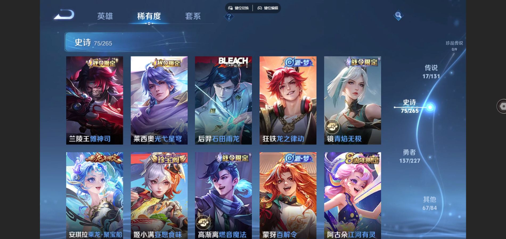 2319895-123英雄-296皮肤v8-17传说 1星传说 金色仲夏夜 【全皮英雄】 狂铁全皮 【传说】 乘龙铭钟鼎 逐花归海 神树通天 启明星使 妄想实况 记忆之芯 无双飞将 怒海麟威 诗剑行 地狱火 云鹰飞将 一念神魔 黄金射手座 超时空战士男 时之恋人男 仲夏夜之梦 地狱之眼 【热门】至尊宝 岱宗 飞衡 天狼狩猎者 大圣娶亲 辉光之辰 白晶晶 引擎之心 拒霜思 猎兽之王 神迹守