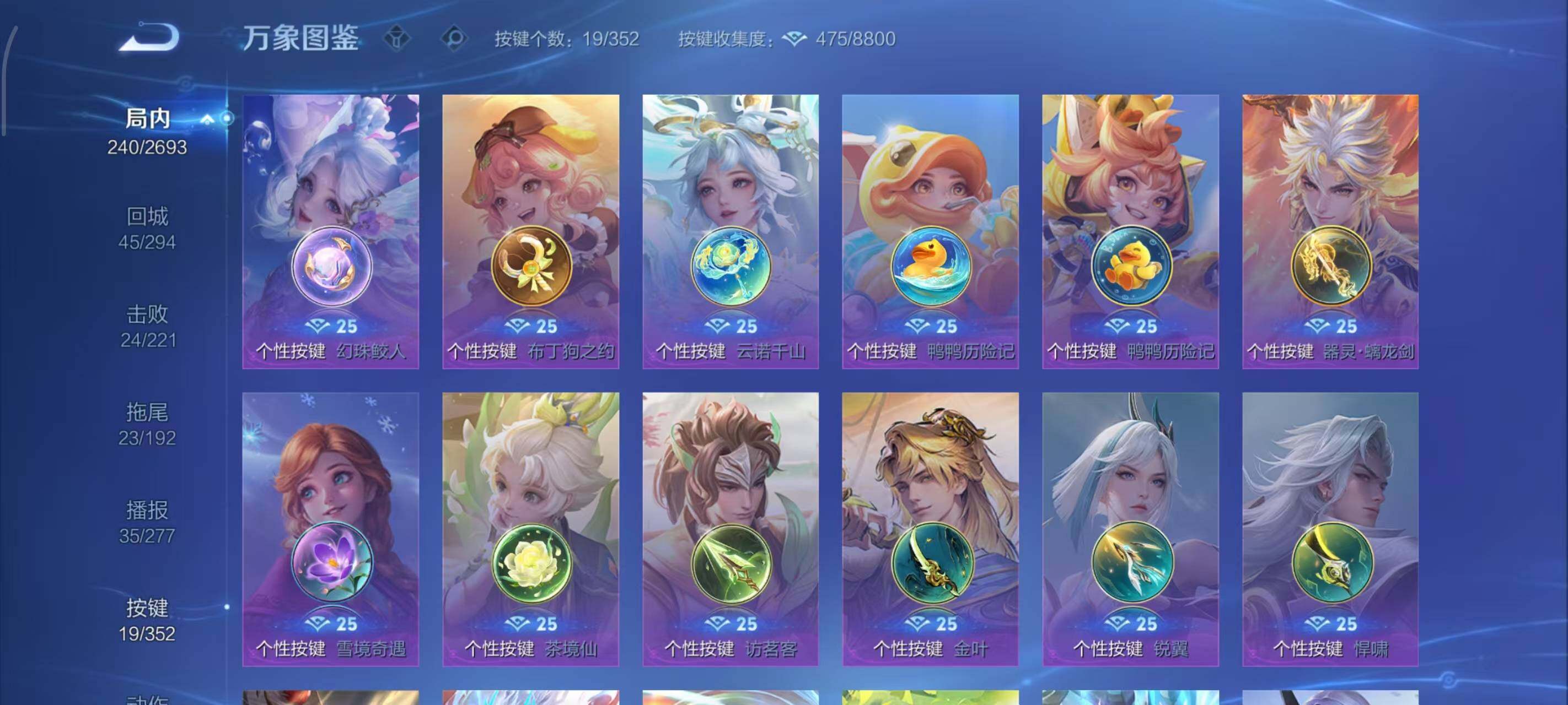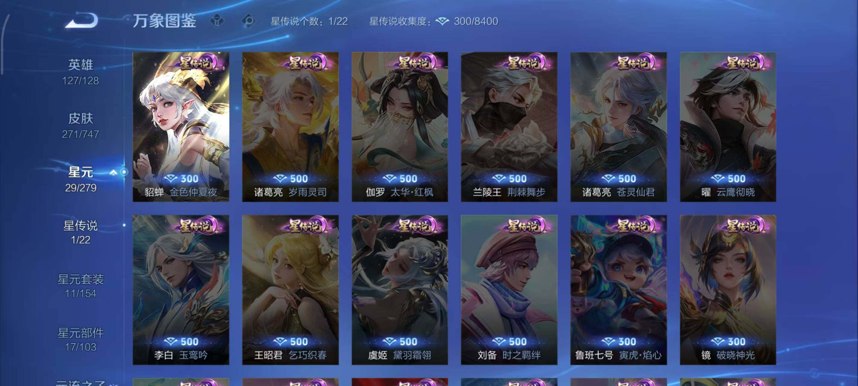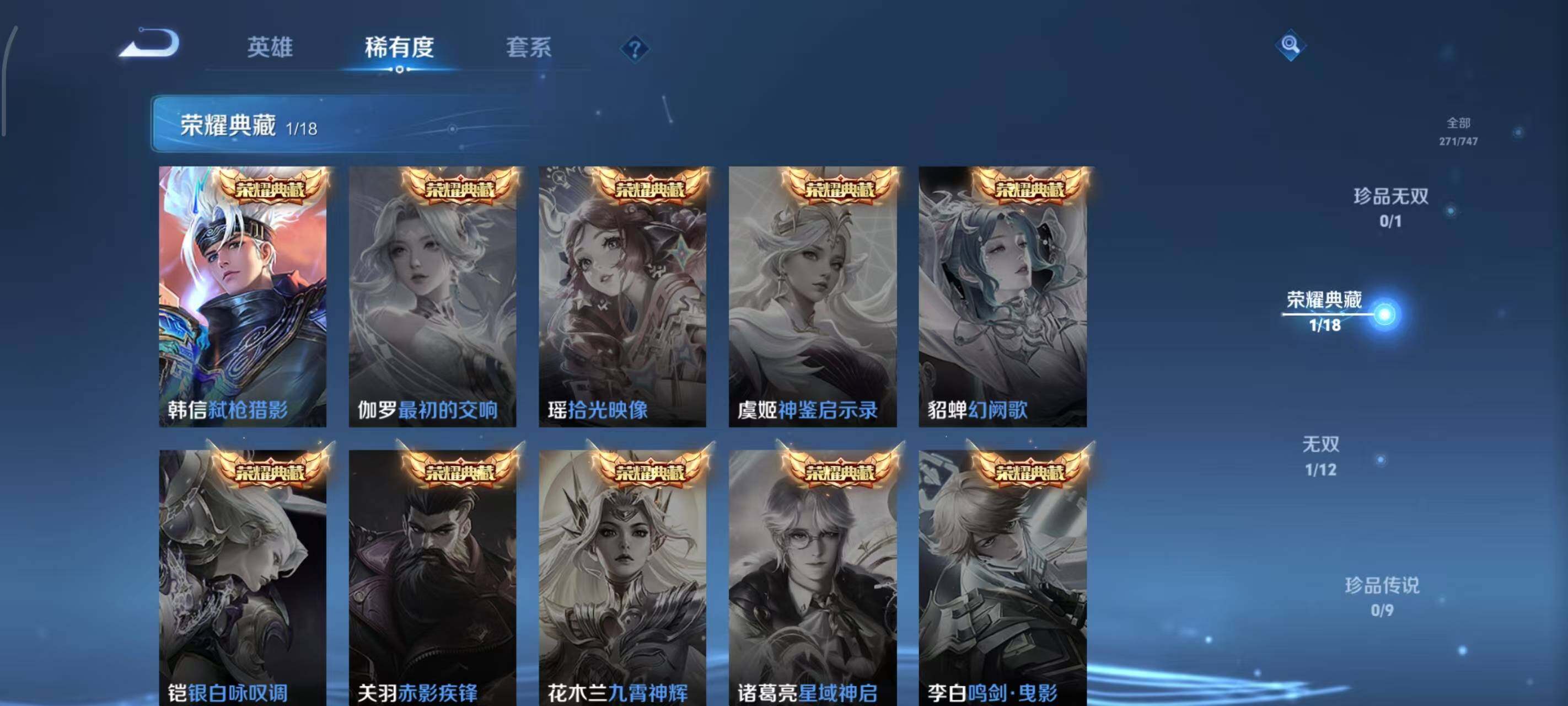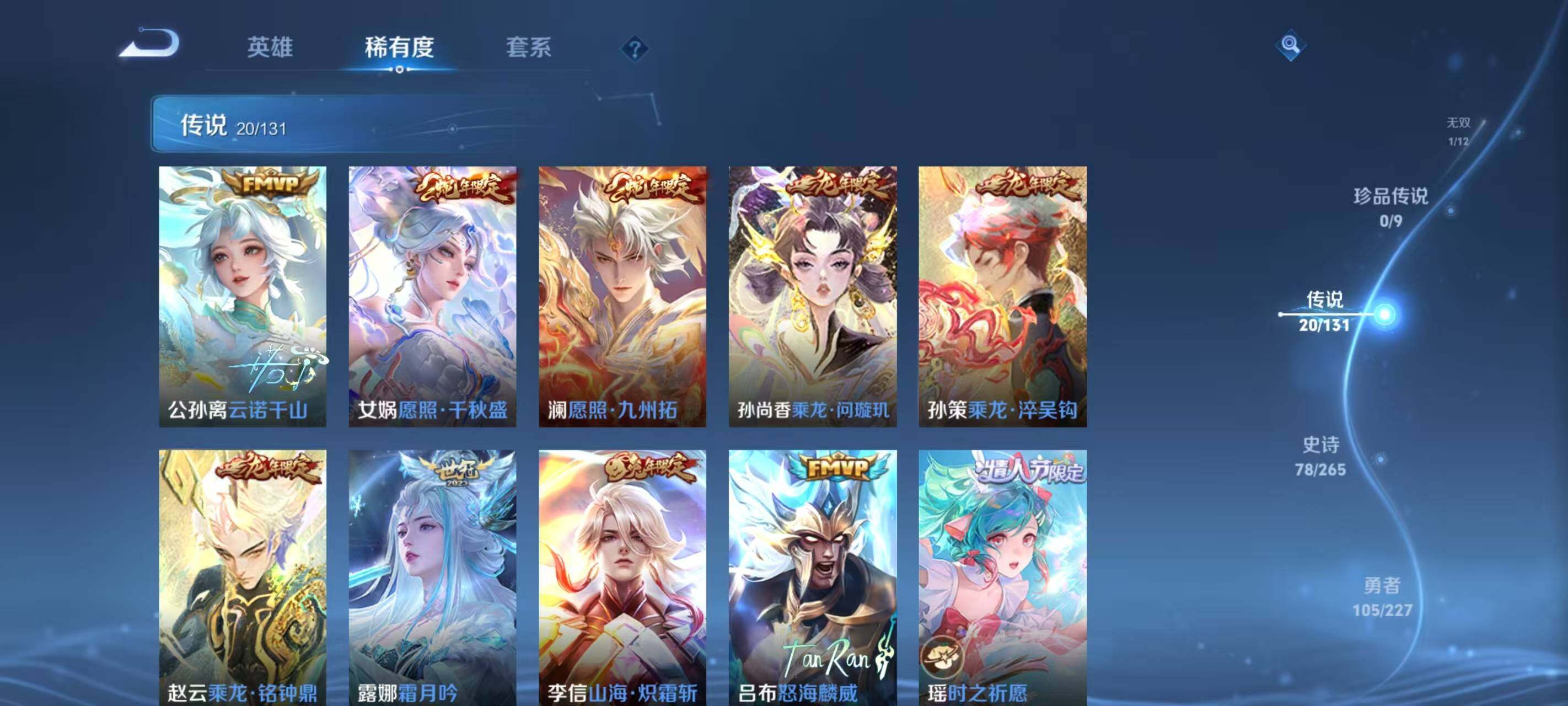 127英雄-271皮肤-按键19 安卓wx-271皮肤-1典藏皮肤-1无双-20传说-78史诗 【英雄全皮】:李信全皮,蒙恬全皮,戈娅全皮 【荣耀典藏】:韩信弑呛猎影 【无双皮肤】:曜器灵螭龙剑 【传说皮肤】:公孙离云诺千山,女娲愿照千秋盛,澜愿照九州拓,孙尚香乘龙问璇玑,孙策乘龙淬吴钩,赵云乘龙铭钟鼎,露娜霜月吟,李信山
