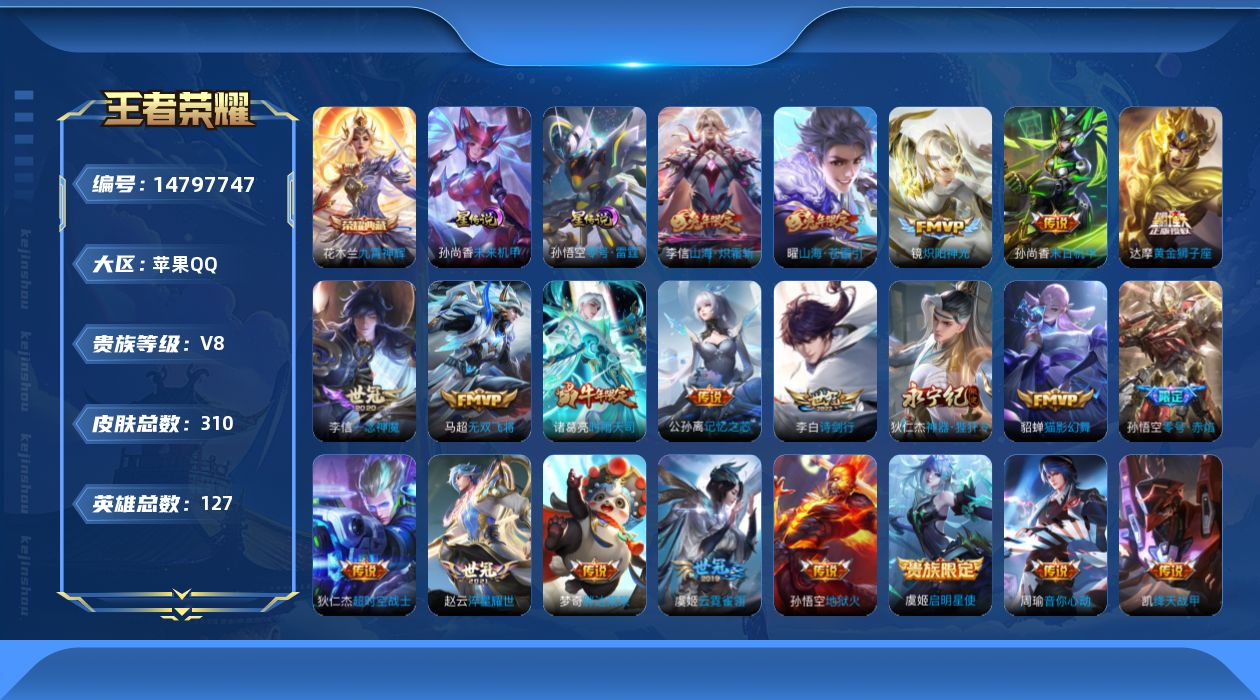 [14797747]苹果q-v8-最强王者段位-127英雄-310皮肤-1典藏皮肤-22传说-85史诗 【英雄全皮】:鬼谷子全皮,李信全皮,蒙恬全皮,空空儿全皮,影全皮 【荣耀典藏】:花木兰九霄神辉 【传说皮肤】:后羿神树通天,公孙离记忆之芯,曜山海苍雷引,李信山海炽霜斩,李白诗剑行,狄仁杰神器狴犴令,马超无双飞将,赵云淬星耀世,周瑜音你心动,诸葛亮时雨天司,铠绛天战甲,镜炽阳神光,虞姬启明星使,孙悟空零号赤焰,李信一念神魔,貂蝉猫影幻舞,虞姬云霓雀翎,达摩黄金狮子座,梦奇胖达荣荣,孙尚香末日机甲,孙悟空地狱火,狄仁杰超时空战士 【限定皮肤】:狄仁杰阴阳师,赵云皇家上将,嬴政优雅恋人,高渐离玩趣恶龙,阿轲迷踪丽影,钟无艳超时空战士,扁鹊奇幻香踪,吕布御风骁将,元歌云间偶戏,元歌无心,夏侯惇朔风刀,甄姬游园惊梦,甄姬落雪兰心,典韦穷奇,典韦蓝屏警告,马可波罗暗影游猎,马可波罗山海玄木吟,狄仁杰魔术师,狄仁杰万华元夜,狄仁杰神器狴犴令,达摩星际陆战队,达摩沙漠行僧,项羽海滩派对,老夫子醍醐杖,程咬金演武夺筹,刘邦夺宝奇兵,花木兰默契交锋,亚瑟潮玩骑士王,孙悟空至尊宝,孙悟空零号赤焰,牛魔御旌,后羿如梦令,刘备百相守梦,李元芳云中旅人,虞姬启明星使,钟馗驱傩正仪,杨玉环遇见飞天,杨戬潮玩骑兵,女娲朔望之晖,干将莫邪冰霜恋舞曲,雅典娜单词大作战,蔡文姬繁星吟游,鬼谷子原初探秘者,鬼谷子五谷丰年,诸葛亮时雨天司,苏烈玄武志,苏烈千军破阵,百里玄策原初追逐者,百里守约朱雀志,弈星混沌棋,梦奇顽趣,沈梦溪匿光破解者,明世隐疑决卦,裴擒虎李小龙,裴擒虎擒涛扼浪,米莱狄御霄,米莱狄胡桃异想国,云中君纤云弄巧,李信山海炽霜斩,盾山御銮,猪八戒西部大镖客,上官婉儿梁祝,嫦娥拒霜思,嫦娥暖冬兔眠,曜山海苍雷引,西施玲珑珍味,蒙犽狂想玩偶喵,鲁班大师探海日志,桑启海盐诗旅,暃星界游侠,戈娅驭风魔法,艾琳流音漫舞,司空震地狱燃心,阿古朵江河有灵,张良古海寻踪,蒙犽百解令,蒙恬荣光圣徽,鬼谷子天穹祈灯,刘邦剑破天穹,镜青焰无极 【年限皮肤】:百里守约朱雀志,苏烈玄武志,吕布御风骁将,诸葛亮时雨天司,马可波罗山海玄木吟,李信山海炽霜斩,曜山海苍雷引 【赛季限定】:夏侯惇朔风刀,典韦穷奇,狄仁杰万华元夜,达摩沙漠行僧,老夫子醍醐杖,程咬金演武夺筹,张良古海寻踪,牛魔御旌,李元芳云中旅人,钟馗驱傩正仪,鬼谷子原初探秘者