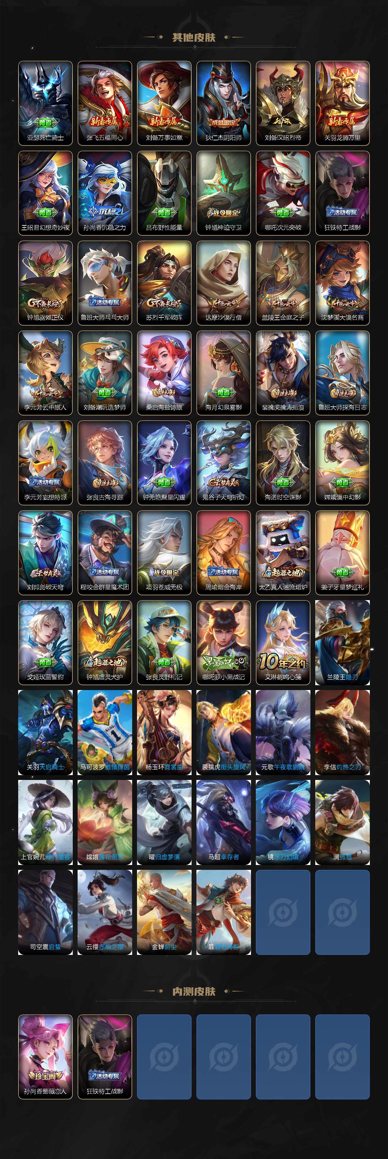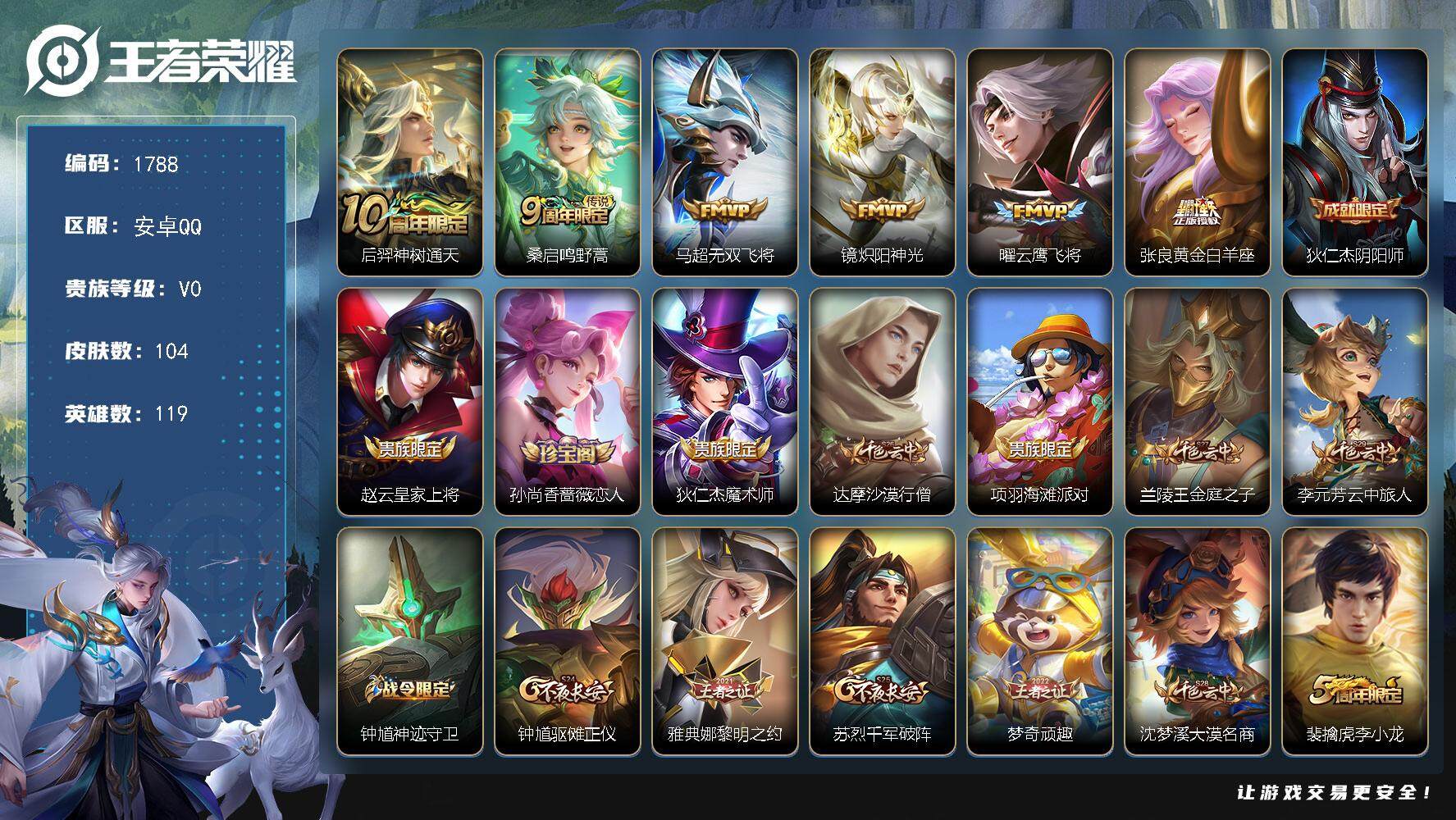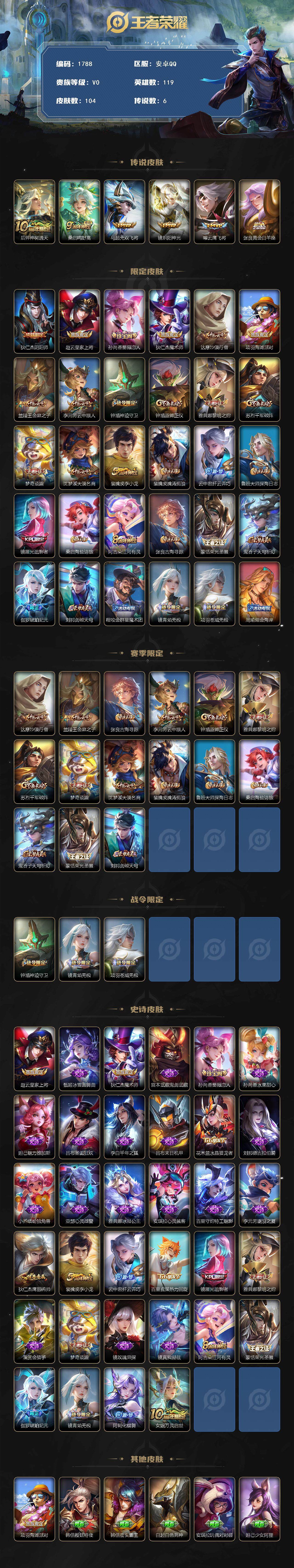 119英雄-104皮肤-贵族0/皮肤104/传说6/史诗34/英雄119/镜全皮/神树通天 后羿/鸣野蒿 桑启/无双飞将 马超/炽阳神光 镜/云鹰飞将 曜/黄金白羊座 张良/阴阳师 狄仁杰/皇家上将 赵云/蔷薇恋人 孙尚香/魔术师 狄仁杰/沙漠行僧 达摩/海滩派对 项羽/金庭之子 兰陵王/云中旅人 李元芳/神迹守卫 钟馗/驱傩正仪 钟馗/黎明之约 雅典娜/千军破阵 苏烈/顽趣 梦奇/大漠名商 沈梦溪/李小龙 裴擒虎/