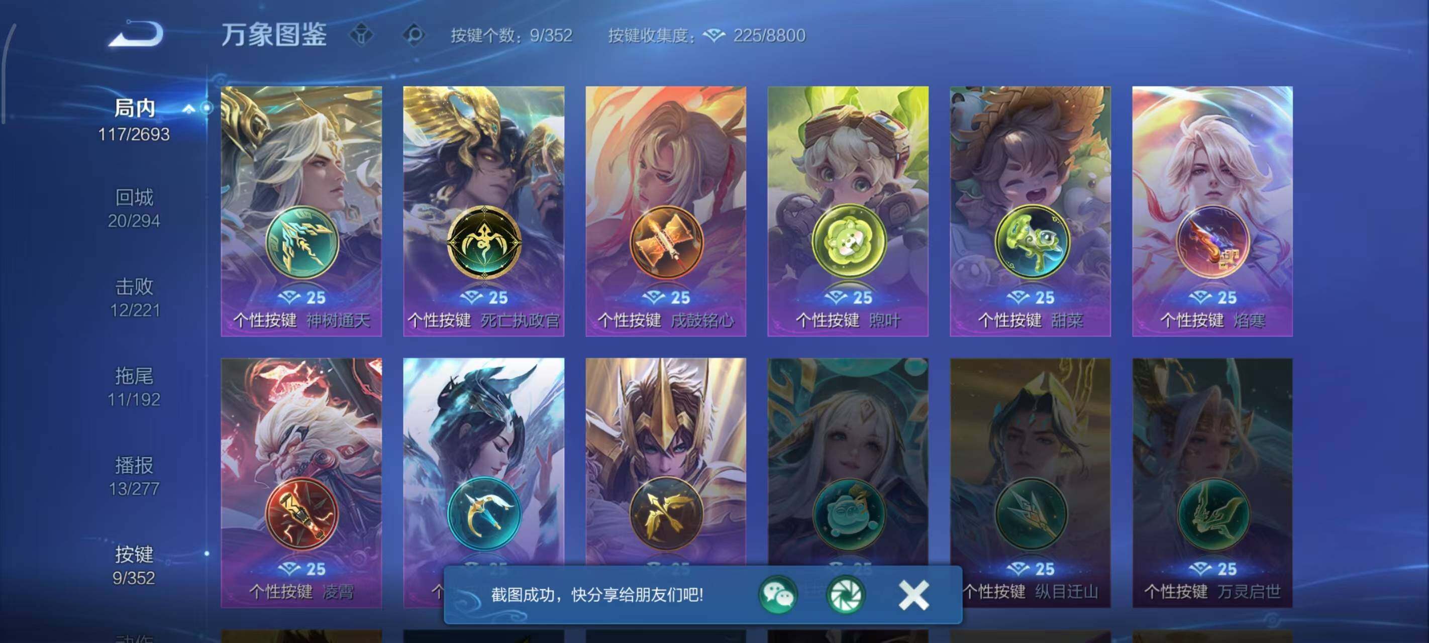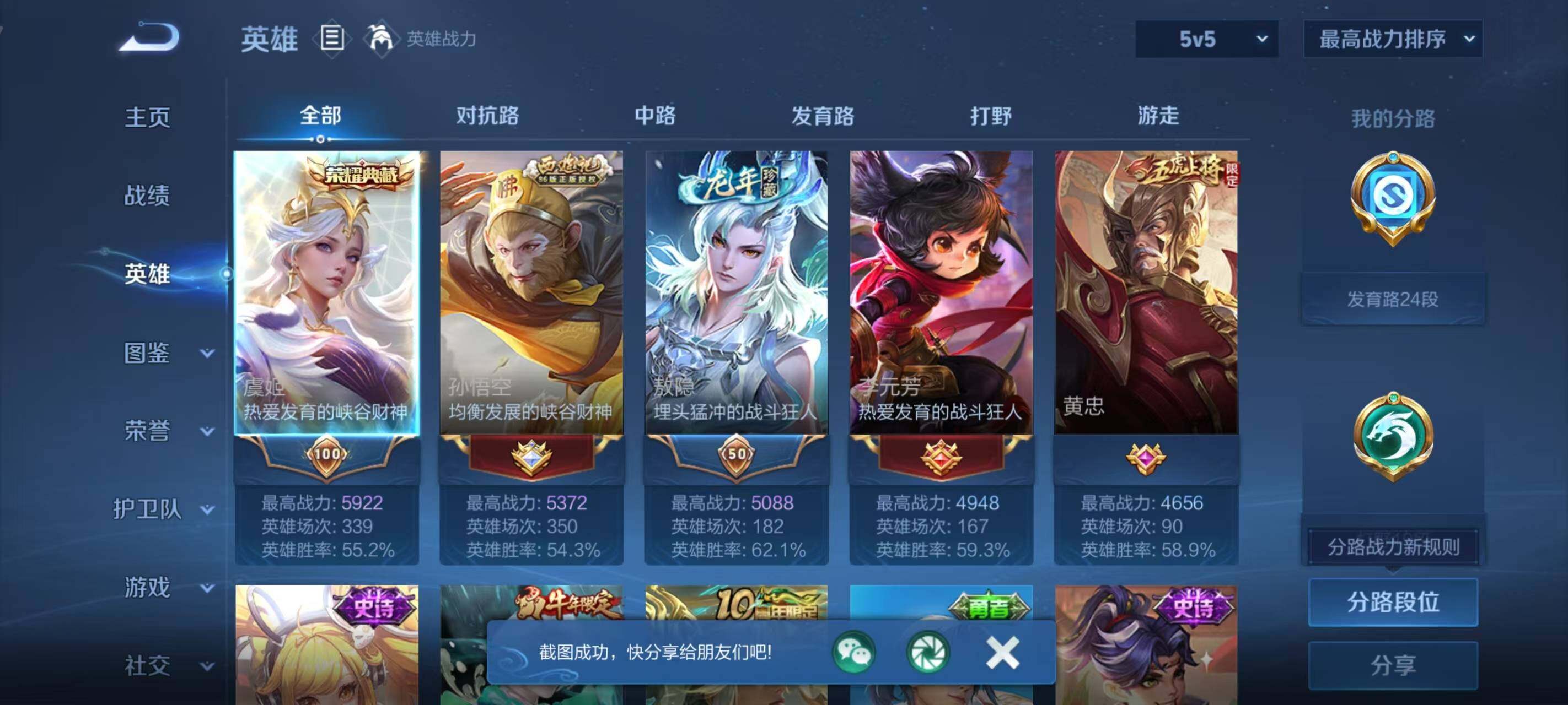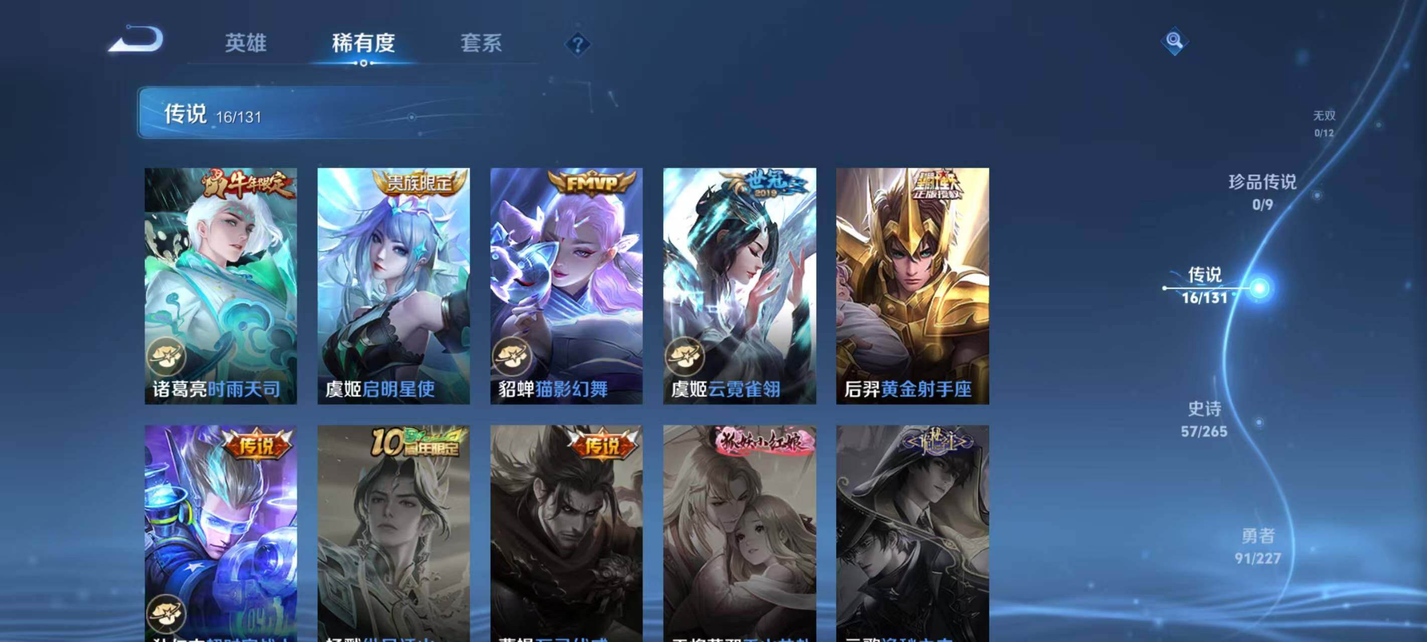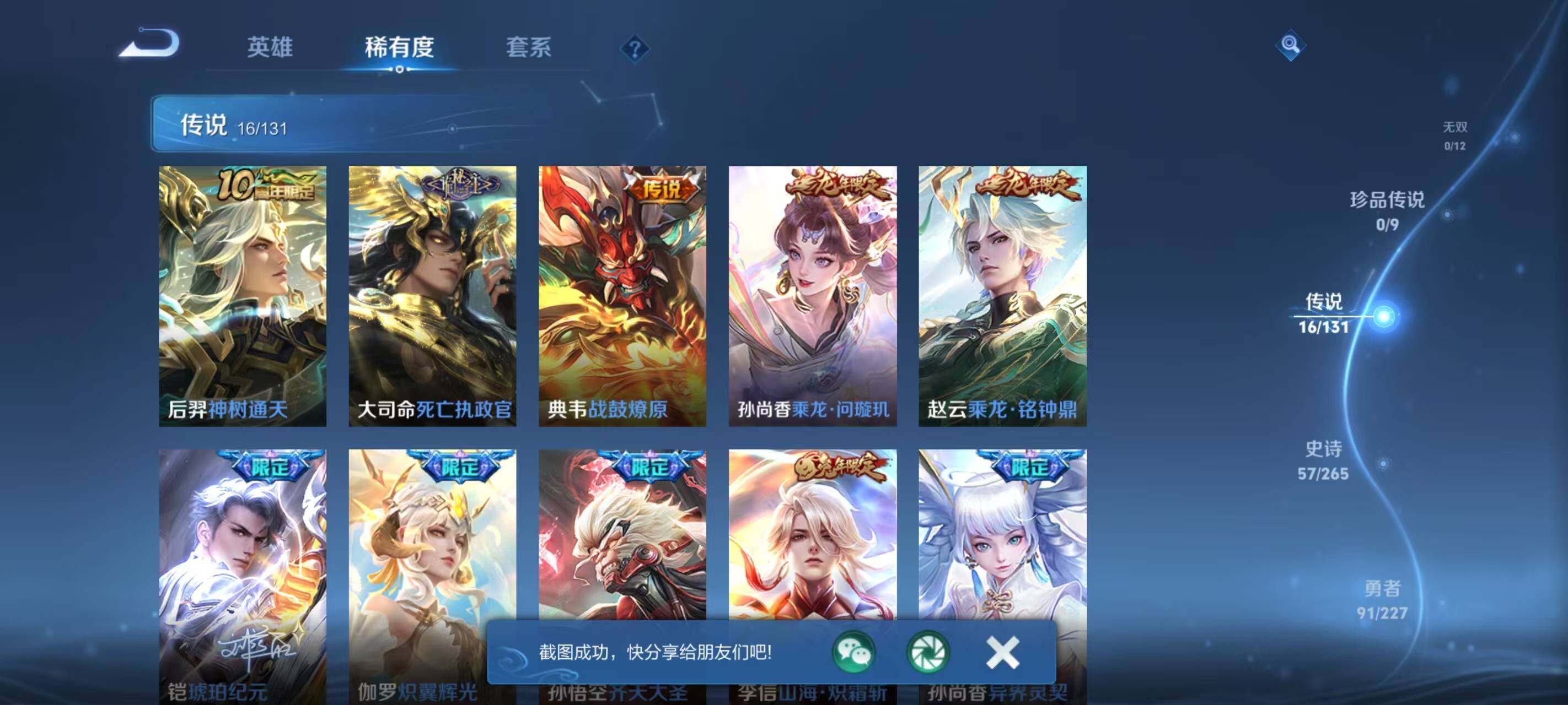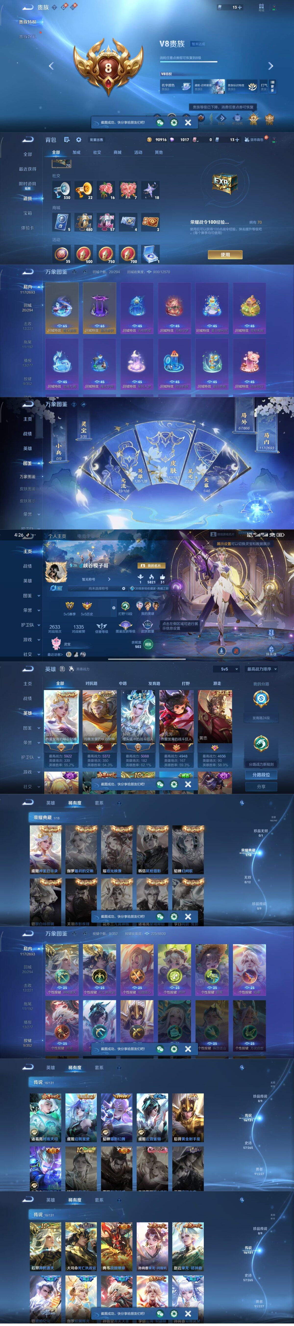 126英雄-182皮肤-安卓wx-v8-182皮肤-1典藏皮肤-16传说-57史诗 【英雄全皮】:空空儿全皮 【荣耀典藏】:虞姬神鉴启示录 【传说皮肤】:后羿神树通天,大司命死亡执政官,典韦战鼓燎原,孙尚香乘龙问璇玑,赵云乘龙铭钟鼎,铠琥珀纪元,伽罗炽翼辉光,孙悟空齐天大圣,李信山海炽霜斩,孙尚香异界灵契,诸葛亮时雨天司,