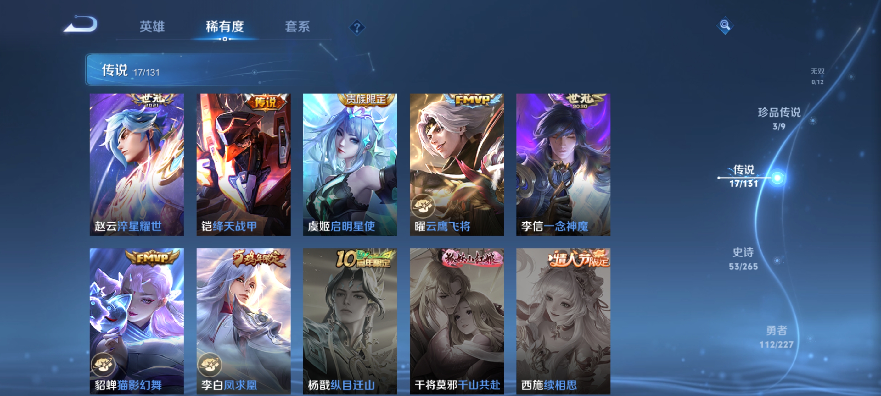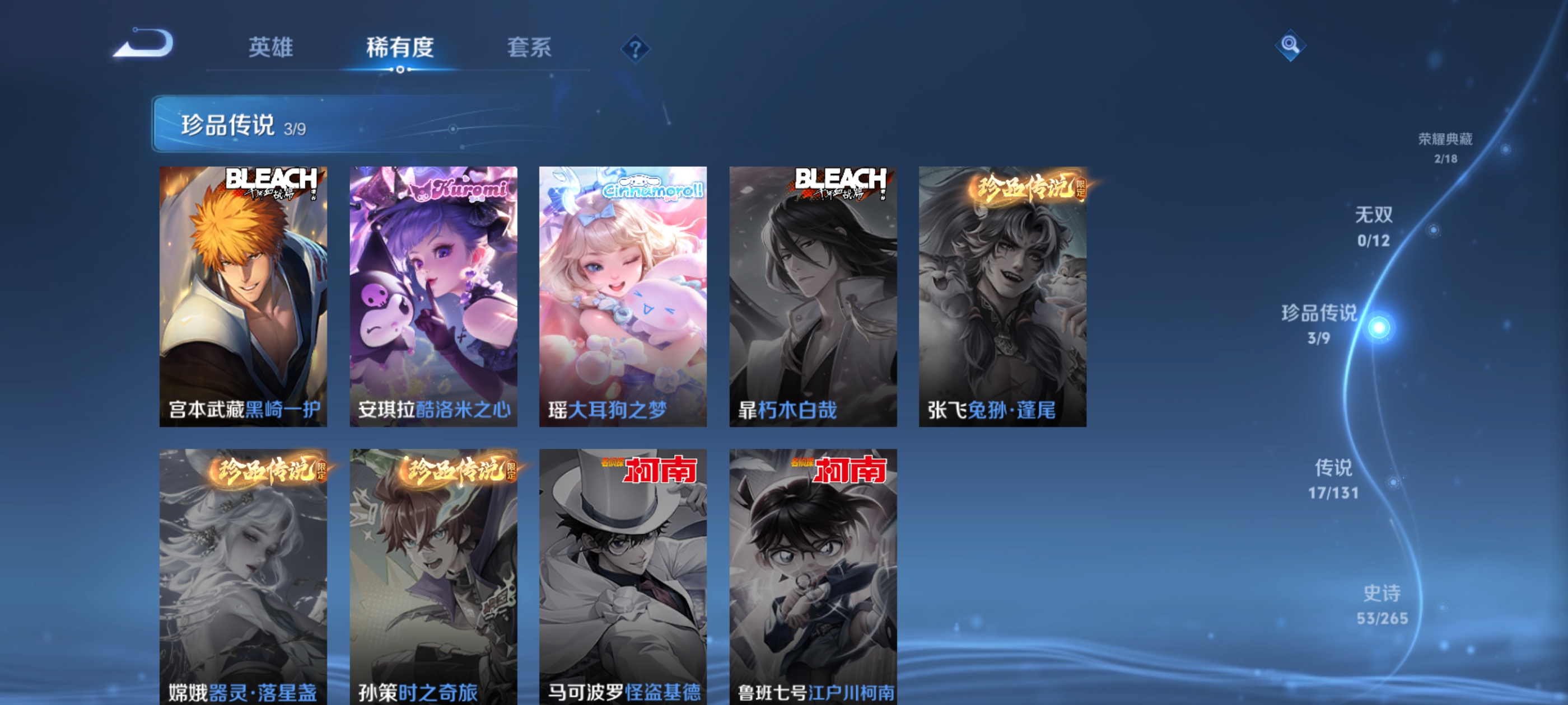 v8-239皮2典藏(最初的交响,全息碎影)3珍品传说(黑崎一护,大耳狗之梦,酷洛米之心)17传说云诺千山,一念神魔,霜北刀,神树通天,启明星使,万灵伏威,诡秘之主,死亡执政官,九山相柳,无双飞将,淬星耀世,绛天战甲,碎云,妄想奇谈,云鹰飞将,凤求凰,猫影幻舞