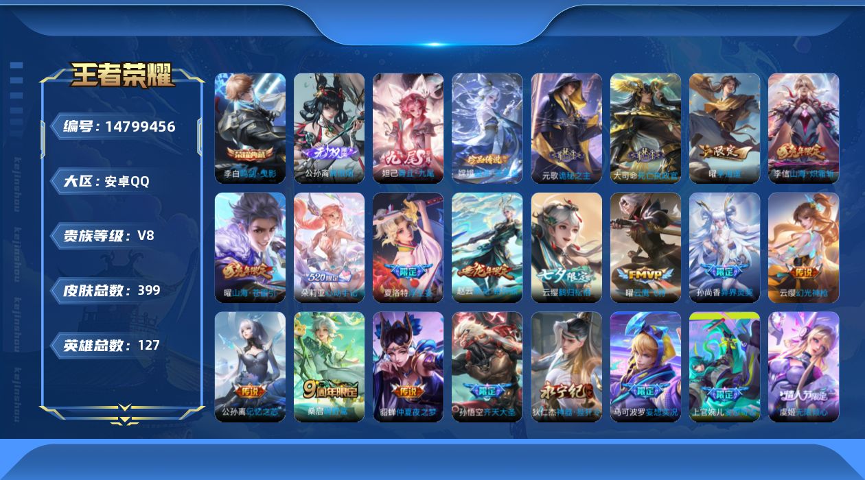 [14799456]可二次 安卓手q367区399皮1典藏27传说2无双1珍品传说v8 营地id1893029087无双王者【珍品传说皮肤】:器灵·落星盏【无双皮肤】:离恨烟青丘·九尾【荣耀典藏】:鸣剑·曳影【优质限定皮肤】:云中君时之祈愿至尊宝山海·苍雷引山海·炽霜斩神威【传说皮肤】:地狱火神树通天诡秘之主死亡执政官幻光神呛鸣野蒿心动手记乘龙·铭钟鼎神器·狴犴令鹤