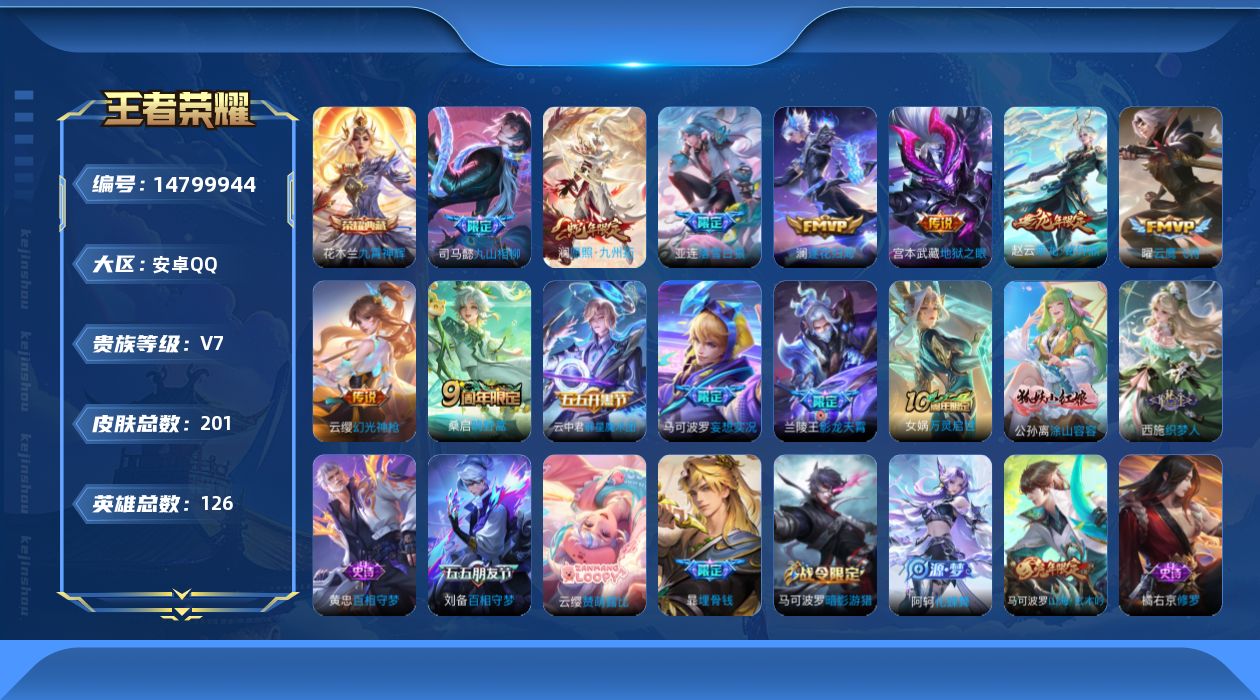 v7 1典藏 12传说 126英雄 201皮肤 可修改实名 【英雄全皮】:司马懿全皮 【稀有英雄】:大司命嬴政始皇帝韩信韩跳跳夏洛特夏师傅艾琳橘右京橘子娜可露露鸟人不知火舞赵云金蝉唐僧戈娅 【荣耀水晶】:九霄神辉木兰典藏 【传说皮】:乘龙·铭钟鼎赵