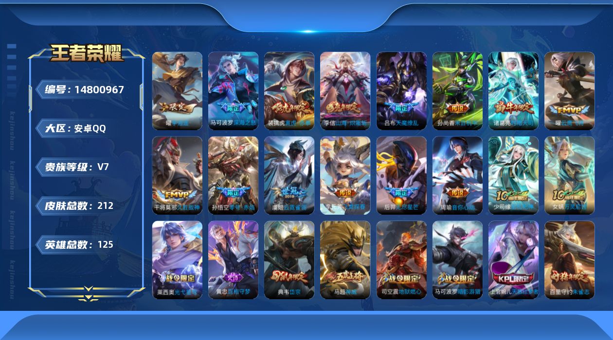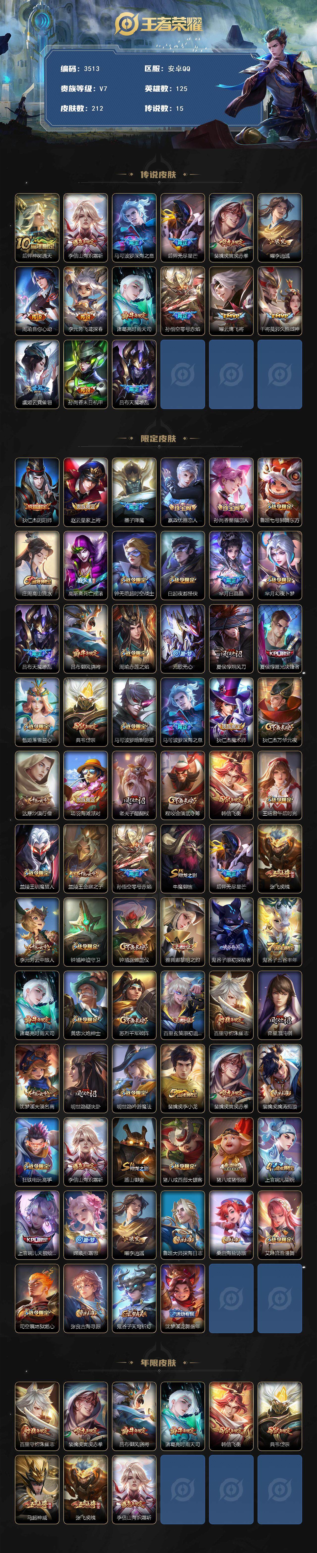 [14800967]安卓q-v7-最强王者段位-125英雄-212皮肤-15传说-58史诗 【传说皮肤】:后羿神树通天,李信山海炽霜斩,马可波罗深海之息,后羿无尽星芒,裴擒虎寅虎赤拳,曜李 ,周瑜音你心动,李元芳飞鸢探春,诸葛亮时雨天司,孙悟空零号赤焰,曜云鹰飞将,干将莫邪久胜战神,虞姬云霓雀翎,孙尚香末日机甲,吕布天魔缭乱 【限定皮肤】:狄仁杰阴阳师,赵云皇家上将,墨子降魔,嬴政优雅恋人,孙尚香蔷薇恋人,鲁班七号狮舞东方,庄周高山流水,高渐离死亡摇滚,钟无艳超时空战士,白起夜都怪侠,芈月白晶晶,芈月幻夜卜梦,吕布天魔缭乱,吕布御风骁将,周瑜赤莲之焰,元歌无心,夏侯惇朔风刀,夏侯惇匿光决锋者,甄姬落雪兰心,典韦岱宗,马可波罗暗影游猎,马可波罗深海之息,狄仁杰魔术师,狄仁杰万华元夜,达摩沙漠行僧,项羽海滩派对,老夫子醍醐杖,程咬金演武夺筹,韩信飞衡,王昭君午后时光,兰陵王驯魔猎人,兰陵王金庭之子,孙悟空零号赤焰,牛魔御旌,后羿无尽星芒,张飞虎魄,李元芳云中旅人,钟馗神迹守卫,钟馗驱傩正仪,雅典娜黎明之约,鬼谷子原初探秘者,鬼谷子五谷丰年,诸葛亮时雨天司,黄忠火炮绅士,苏烈千军破阵,百里玄策原初追逐者,百里守约朱雀志,弈星混沌棋,沈梦溪大漠名商,明世隐疑决卦,明世隐吟游魔法,裴擒虎李小龙,裴擒虎寅虎赤拳,裴擒虎擒涛扼浪,狂铁电玩高手,李信山海炽霜斩,盾山御銮,猪八戒西部大镖客,猪八戒猪悟能,上官婉儿梁祝,上官婉儿天狼绘梦者,嫦娥拒霜思,曜李 ,鲁班大师探海日志,桑启海盐诗旅,艾琳流音漫舞,司空震地狱燃心,张良古海寻踪,鬼谷子天穹祈灯,沈梦溪龙舞盛年 【年限皮肤】:百里守约朱雀志,裴擒虎寅虎赤拳,吕布御风骁将,诸葛亮时雨天司,韩信飞衡,典韦岱宗,马超神威,张飞虎魄,李信山海炽霜斩 【赛季限定】:夏侯惇朔风刀,狄仁杰万华元夜,达摩沙漠行僧,老夫子醍醐杖,程咬金演武夺筹,兰陵王金庭之子,张良古海寻踪,牛魔御旌,李元芳云中旅人,钟馗驱傩正仪,雅典娜黎明之约,鬼谷子原初探秘者,苏烈千军破阵,百里玄策原初追逐者,弈星混沌棋,沈梦溪大漠名商,明世隐疑决卦,裴擒虎擒涛扼浪,盾山御銮,鲁班大师探海日志,桑启海盐诗旅,鬼谷子天穹祈灯 【战令限定】:鲁班七号狮舞东方,钟无艳超时空战士,白起夜都怪侠,芈月幻夜卜梦,周瑜赤莲之焰,甄姬落雪兰心,马可波罗暗影游猎,王昭君午后时光,兰陵王驯魔猎人,艾琳流音漫舞