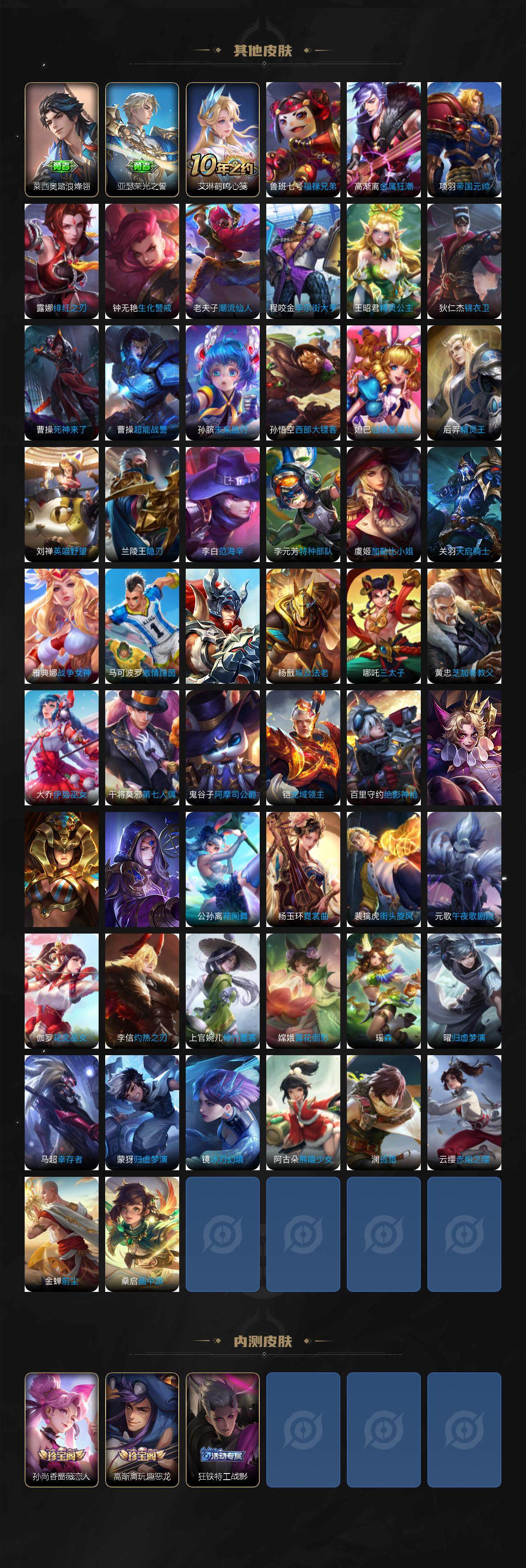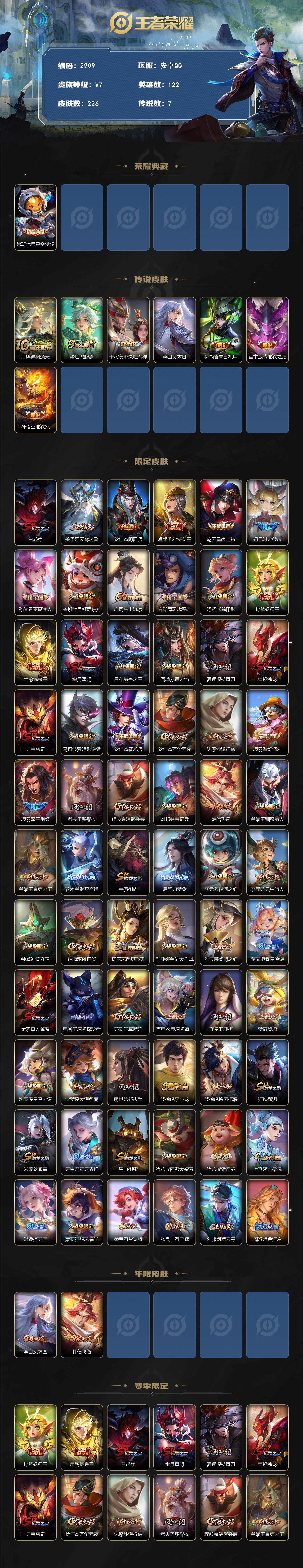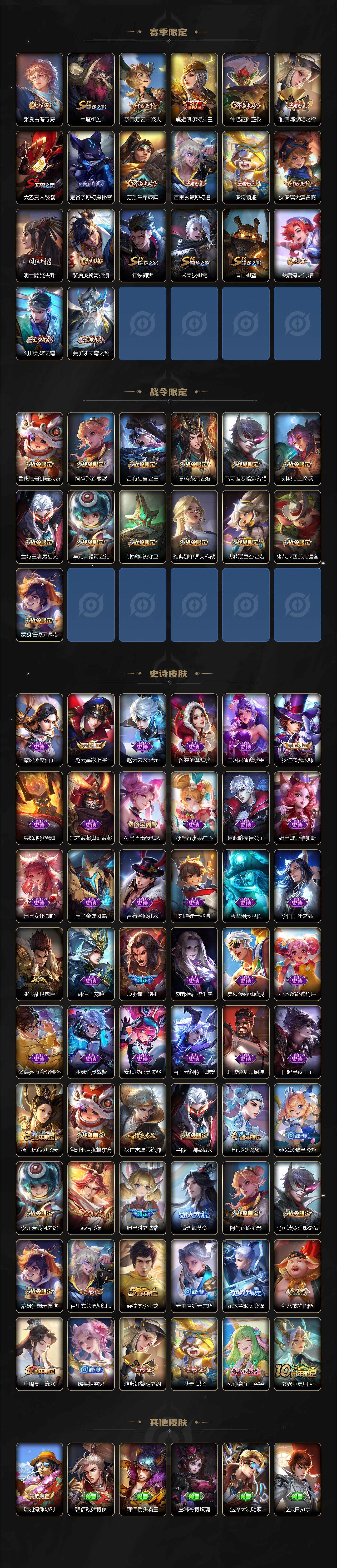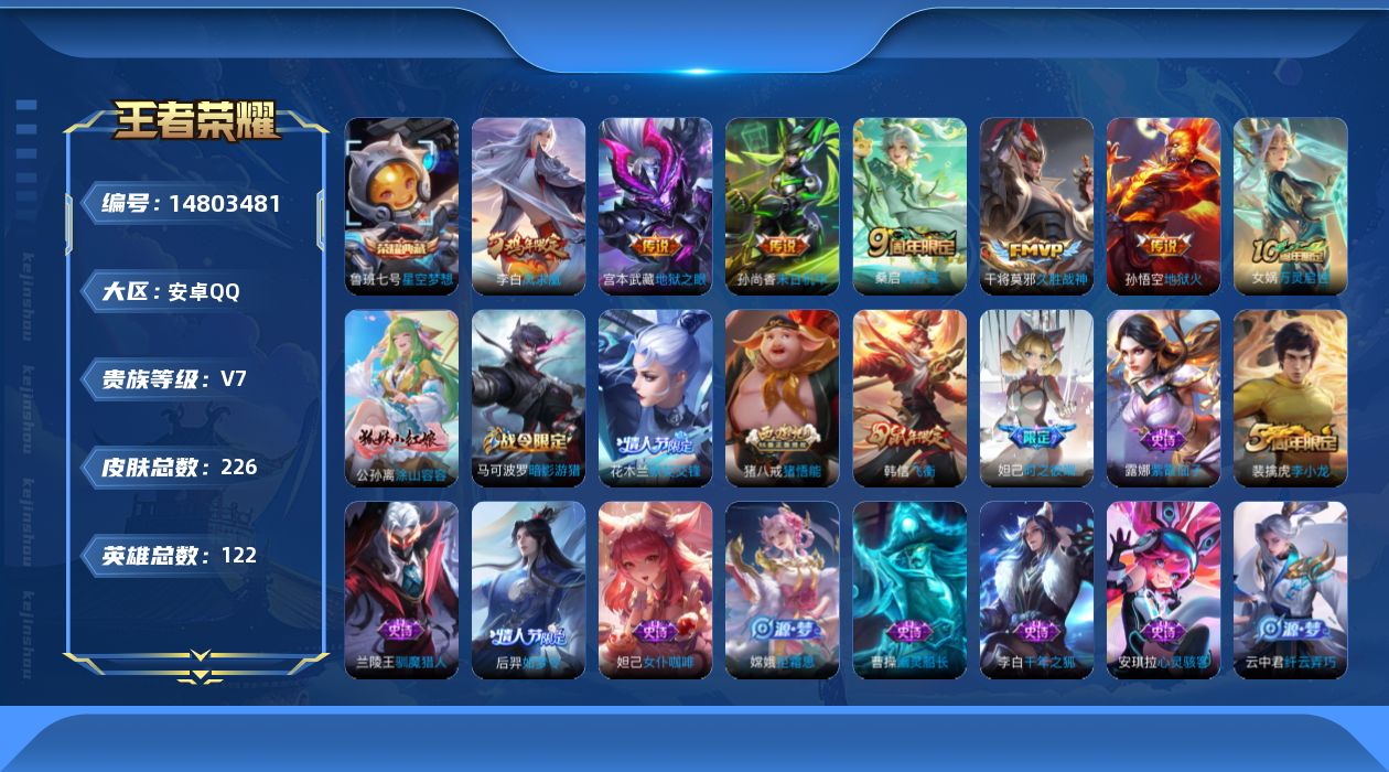 [14803481]安卓q-v7-最强王者段位-122英雄-226皮肤-1典藏-0珍品无双-0无双-0珍品传说-7传说-54史诗 【荣耀典藏】:鲁班七号星空梦想 【传说皮肤】:后羿神树通天,桑启鸣野蒿,干将莫邪久胜战神,李白凤求凰,孙尚香末日机甲,宫本武藏地狱之眼,孙悟空地狱火 【限定皮肤】:白起狰,姜子牙天穹之誓,狄仁杰阴阳师,虞姬凯尔特女王,赵云皇家上将,妲己时之彼端,孙尚香蔷薇恋人,鲁班七号狮舞东方,庄周高山流水,高渐离玩趣恶龙,阿轲迷踪丽影,孙膑妖精王,扁鹊炼金王,芈月重明,吕布猎兽之王,周瑜赤莲之焰,夏侯惇朔风刀,曹操烛龙,典韦穷奇,马可波罗暗影游猎,狄仁杰魔术师,狄仁杰万华元夜,达摩沙漠行僧,项羽海滩派对,项羽霸王别姬,老夫子醍醐杖,程咬金演武夺筹,刘邦夺宝奇兵,韩信飞衡,兰陵王驯魔猎人,兰陵王金庭之子,花木兰默契交锋,牛魔御旌,后羿如梦令,李元芳银河之约,李元芳云中旅人,钟馗神迹守卫,钟馗驱傩正仪,杨玉环遇见飞天,雅典娜单词大作战,雅典娜黎明之约,蔡文姬繁星吟游,太乙真人饕餮,鬼谷子原初探秘者,苏烈千军破阵,百里玄策原初追逐者,弈星混沌棋,梦奇顽趣,沈梦溪星空之诺,沈梦溪大漠名商,明世隐疑决卦,裴擒虎李小龙,裴擒虎擒涛扼浪,狂铁御狮,米莱狄御霄,云中君纤云弄巧,盾山御銮,猪八戒西部大镖客,猪八戒猪悟能,上官婉儿梁祝,嫦娥拒霜思,蒙犽狂想玩偶喵,桑启海盐诗旅,张良古海寻踪,刘邦剑破天穹,周瑜熔金海岸 【年限皮肤】:李白凤求凰,韩信飞衡 【赛季限定】:孙膑妖精王,扁鹊炼金王,白起狰,芈月重明,夏侯惇朔风刀,曹操烛龙,典韦穷奇,狄仁杰万华元夜,达摩沙漠行僧,老夫子醍醐杖,程咬金演武夺筹,兰陵王金庭之子,张良古海寻踪,牛魔御旌,李元芳云中旅人,虞姬凯尔特女王,钟馗驱傩正仪,雅典娜黎明之约,太乙真人饕餮,鬼谷子原初探秘者,苏烈千军破阵,百里玄策原初追逐者,弈星混沌棋,梦奇顽趣,沈梦溪大漠名商,明世隐疑决卦,裴擒虎擒涛扼浪,狂铁御狮,米莱狄御霄,盾山御銮,桑启海盐诗旅,刘邦剑破天穹,姜子牙天穹之誓 【战令限定】:鲁班七号狮舞东方,阿轲迷踪丽影,吕布猎兽之王,周瑜赤莲之焰,马可波罗暗影游猎,刘邦夺宝奇兵,兰陵王驯魔猎人,李元芳银河之约,钟馗神迹守卫,雅典娜单词大作战,沈梦溪星空之诺,猪八戒西部大镖客,蒙犽狂想玩偶喵 【史诗皮肤】:露娜紫霞仙子,赵云皇家上将,赵云未来纪元,貂蝉圣诞恋歌