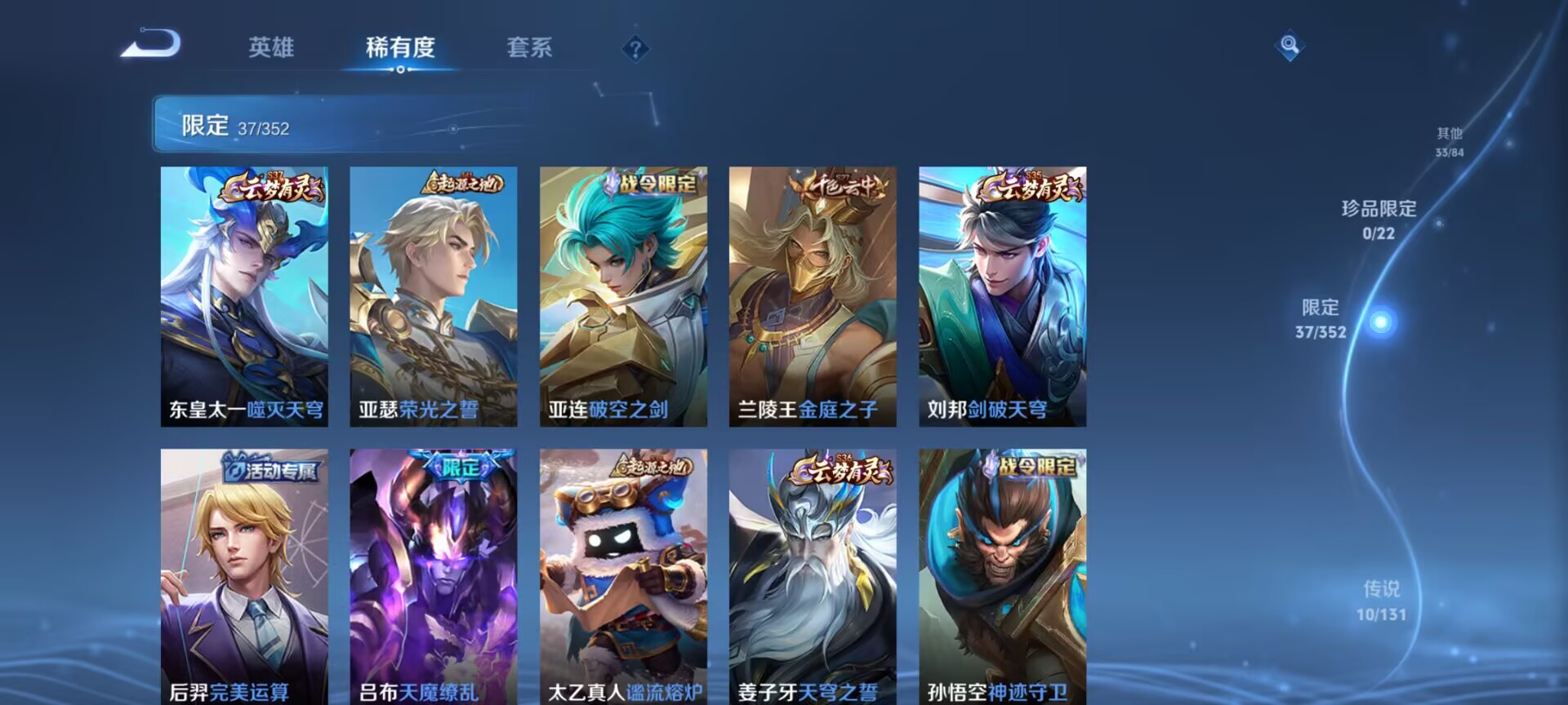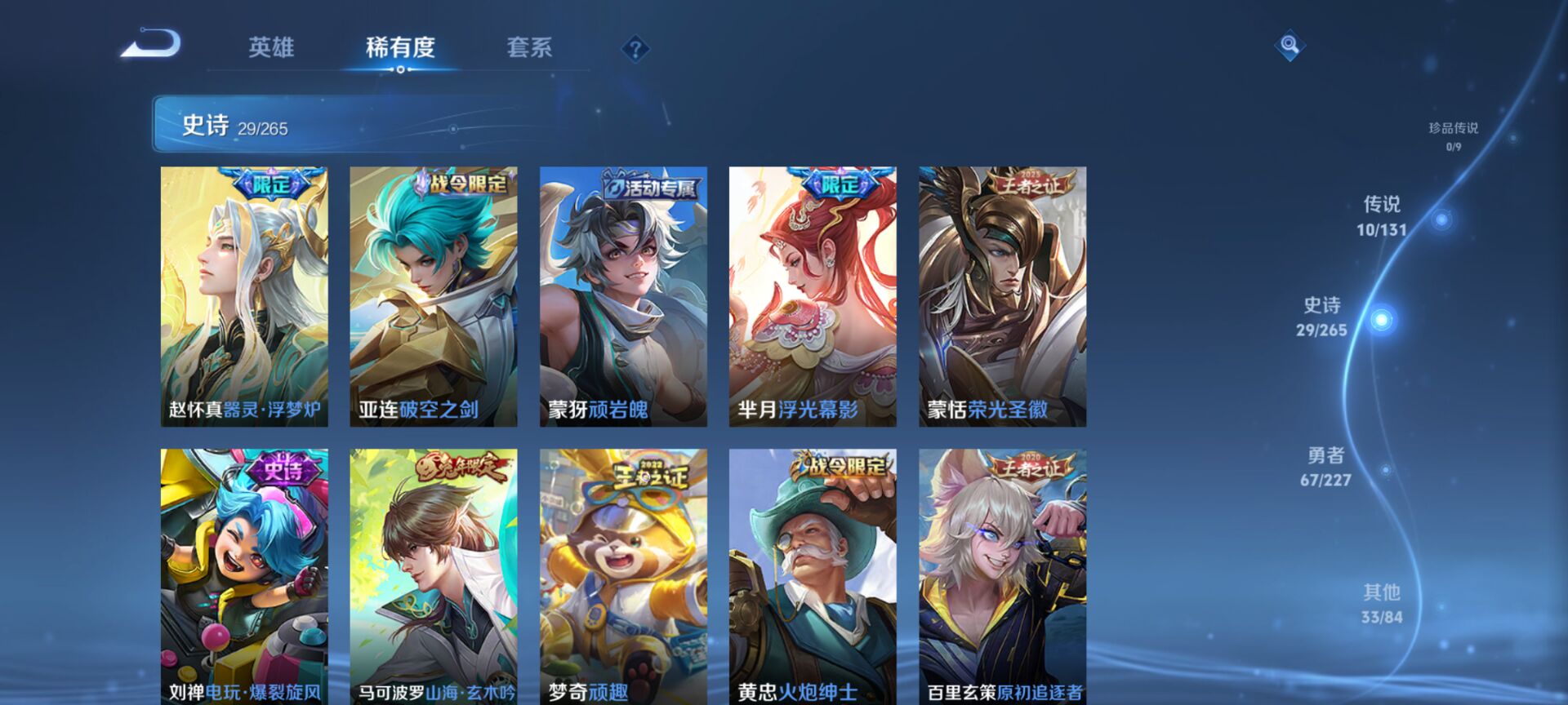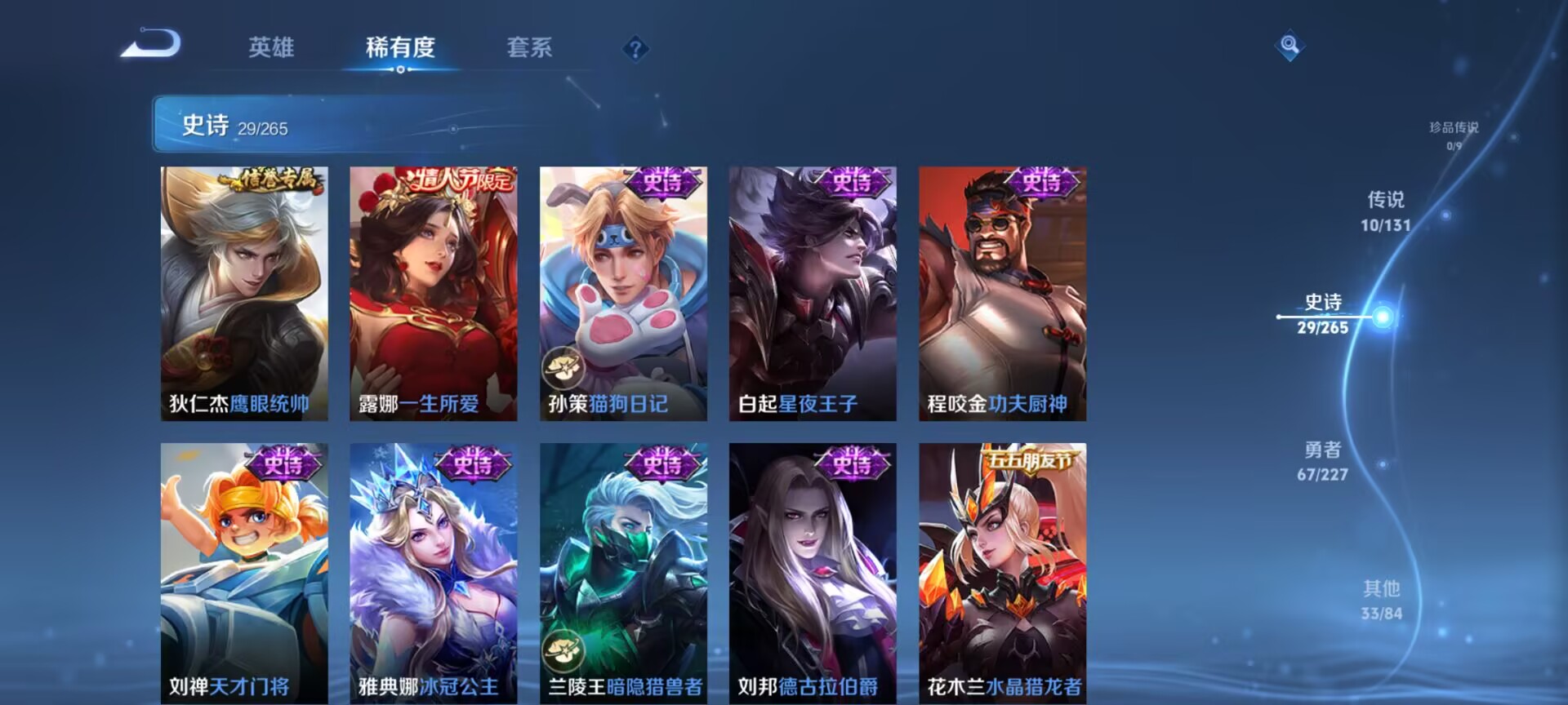 125英雄-139皮肤-【v7 传说10 星传说1幽冥之眼】安卓q-139皮肤-125英雄 【星传说】幽冥之眼 【传说皮肤】 鸣野蒿 无双飞将 黄金狮子座 久胜战神 地狱之眼 炽阳神光 一念神魔 天魔缭乱 乞巧织情 武陵仙君 【史诗皮肤】 破空之剑 器灵·浮梦炉 圣诞老人 一生所爱 山海·玄木吟 器灵·浮梦炉 敬我三分 浮光幕影 完美运算 荣光圣徽 顽岩魄 顽趣 功夫厨神 魅力维加斯 魔术师 鹰眼统帅