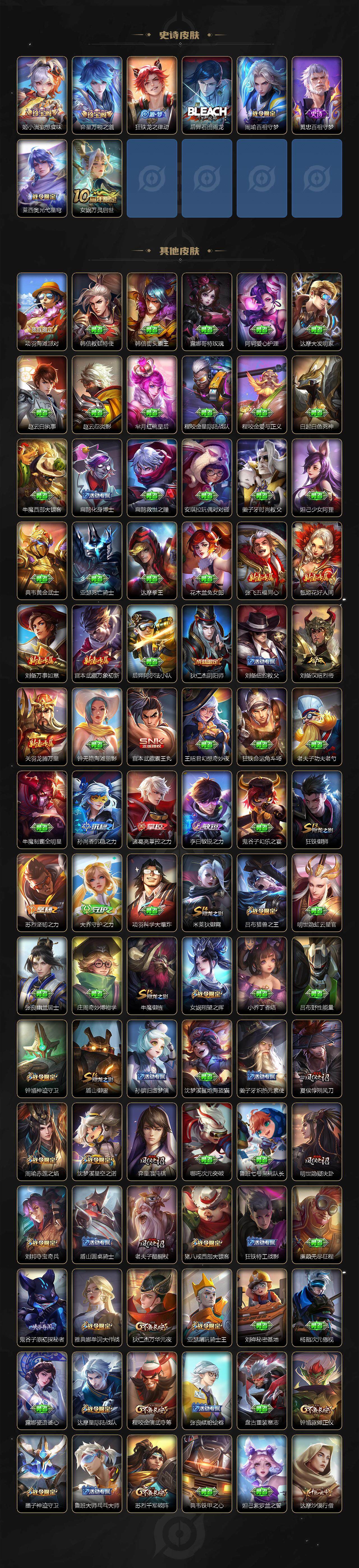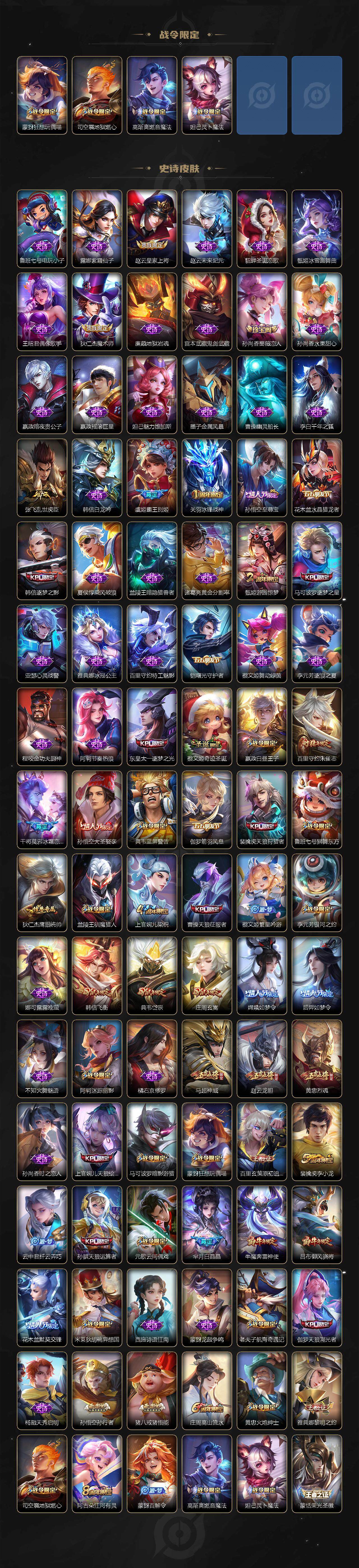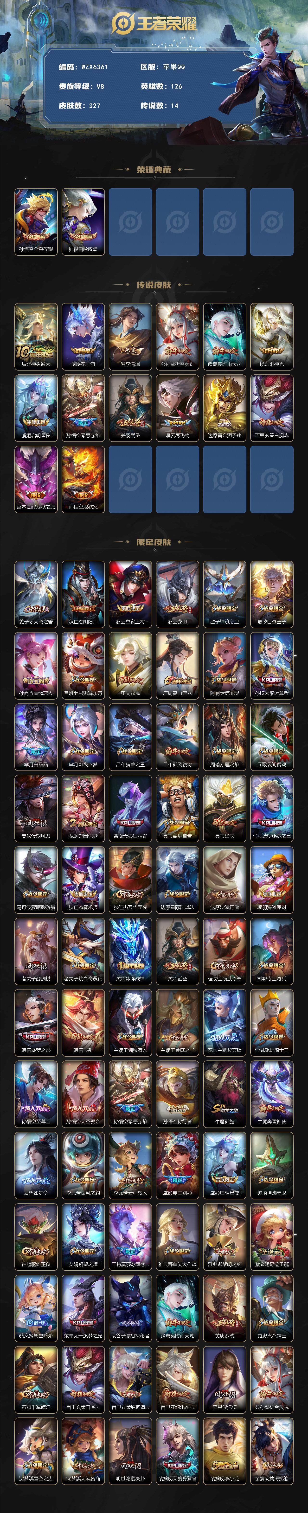 126英雄-327皮肤-【wzx6361】贵族8/皮肤327/典藏2/传说14/史诗103/英雄126/孙权全皮/猪八戒全皮/孙悟空-全息碎影/铠-银白咏叹调/后羿神树通天/澜-逐花归海/曜-李/公孙离-祈雪灵祝/诸葛亮-时雨天司/镜-炽阳神光/虞姬-启明星使/孙悟空-零号·赤焰/关羽-武圣/曜-云鹰飞将/达摩-黄金狮子座/百里玄策-白虎志/宫本武藏-地狱之眼/孙悟空-地狱火/姜子牙天穹之誓/狄仁杰-阴阳师/赵云