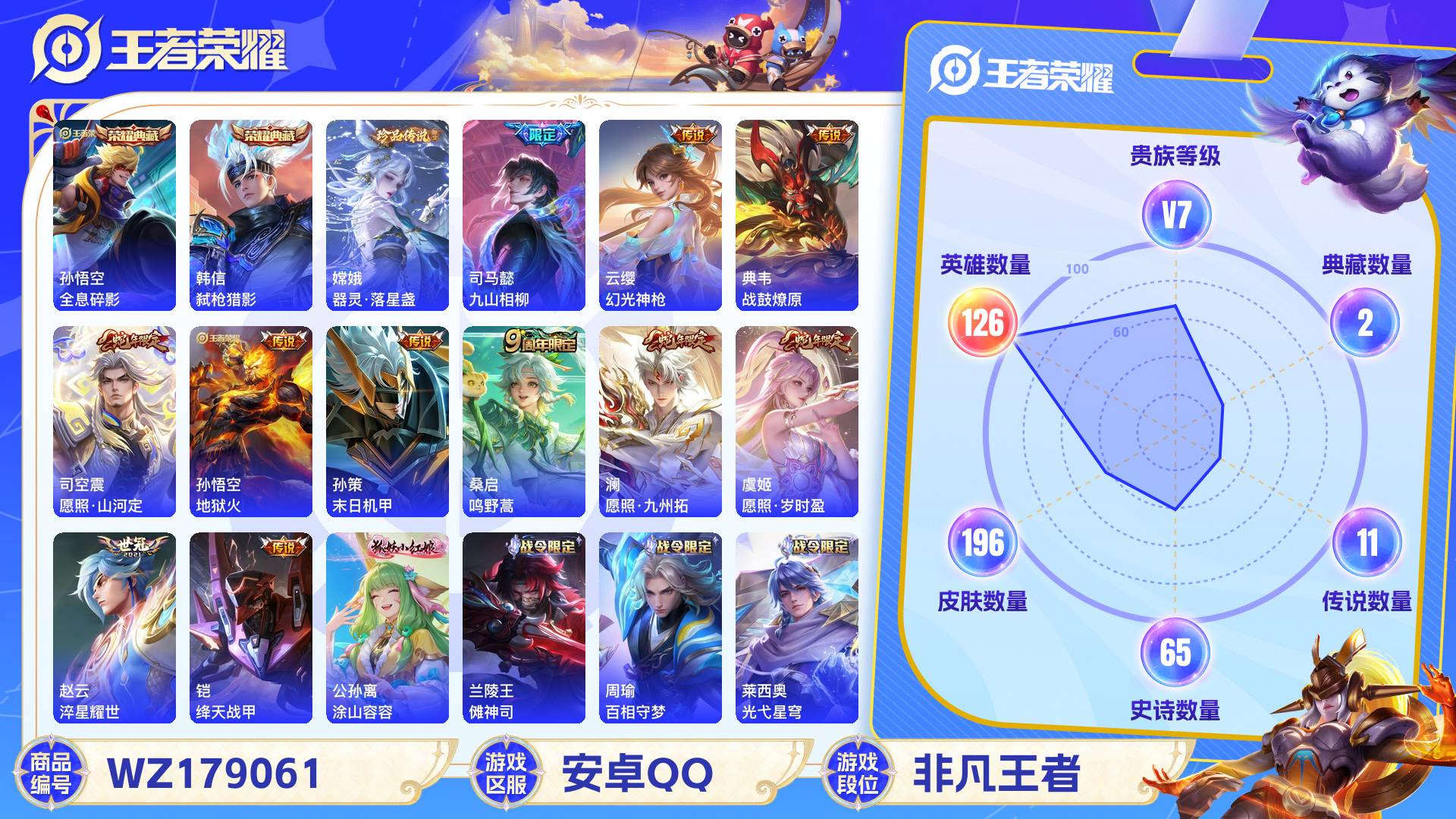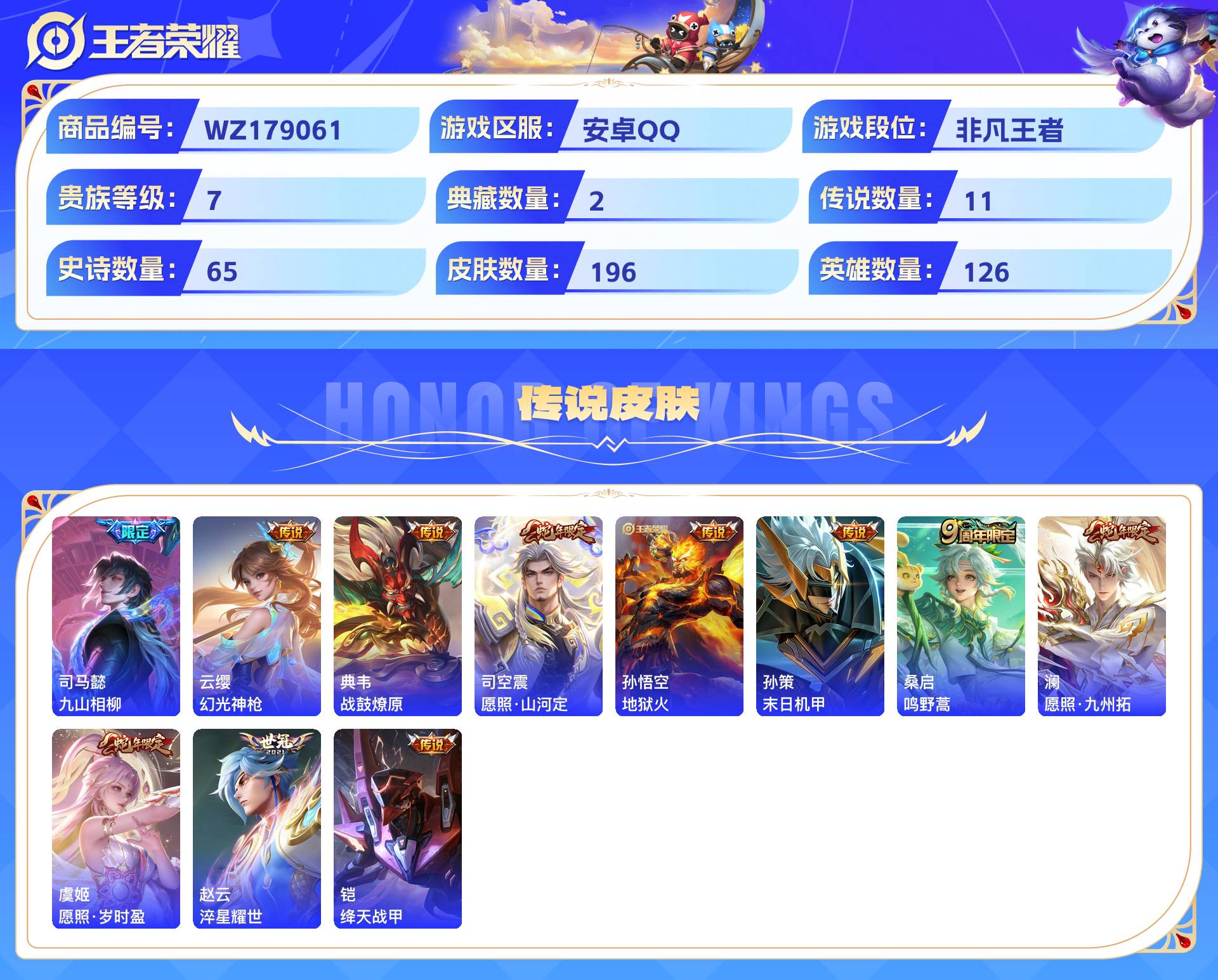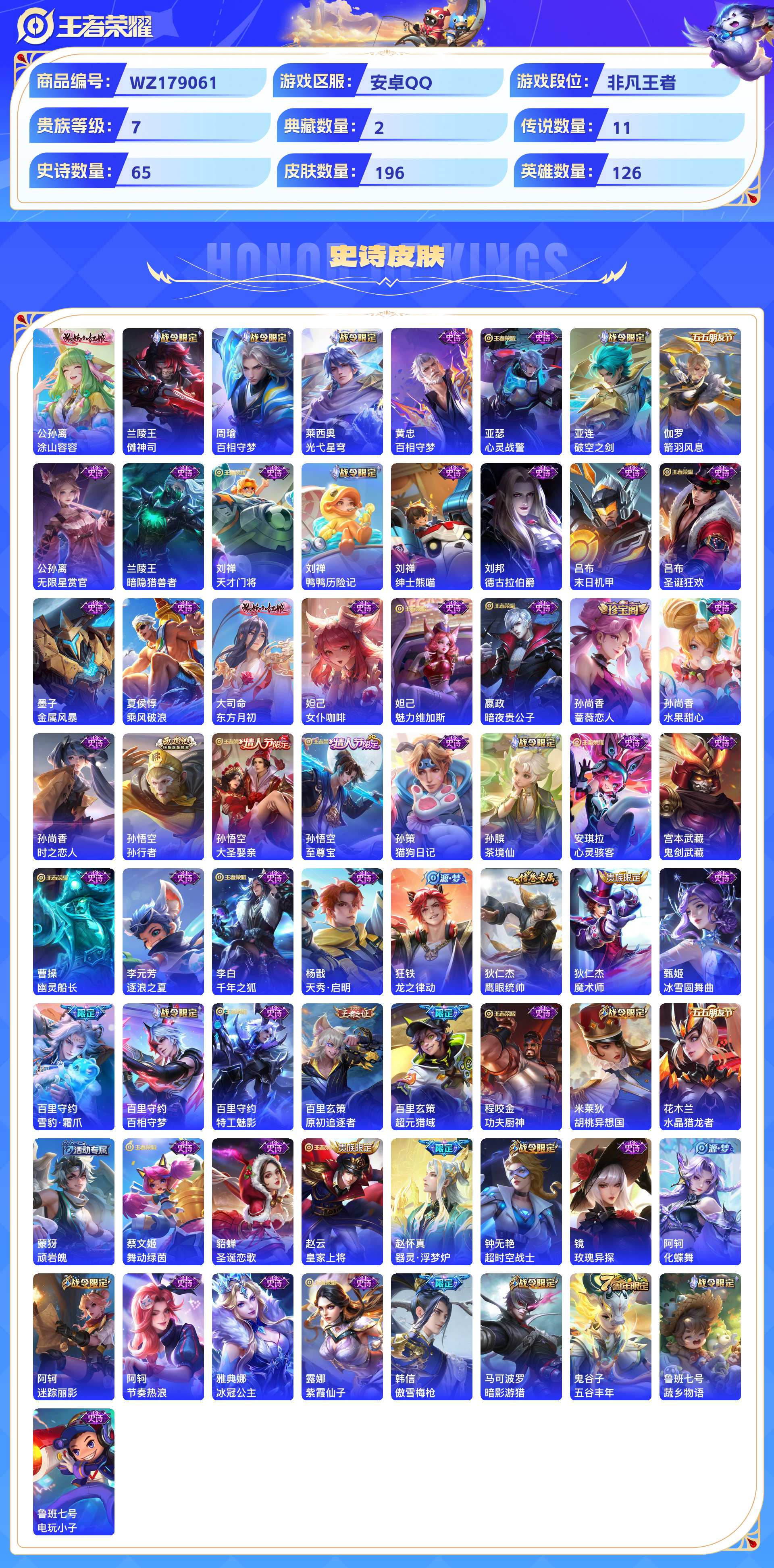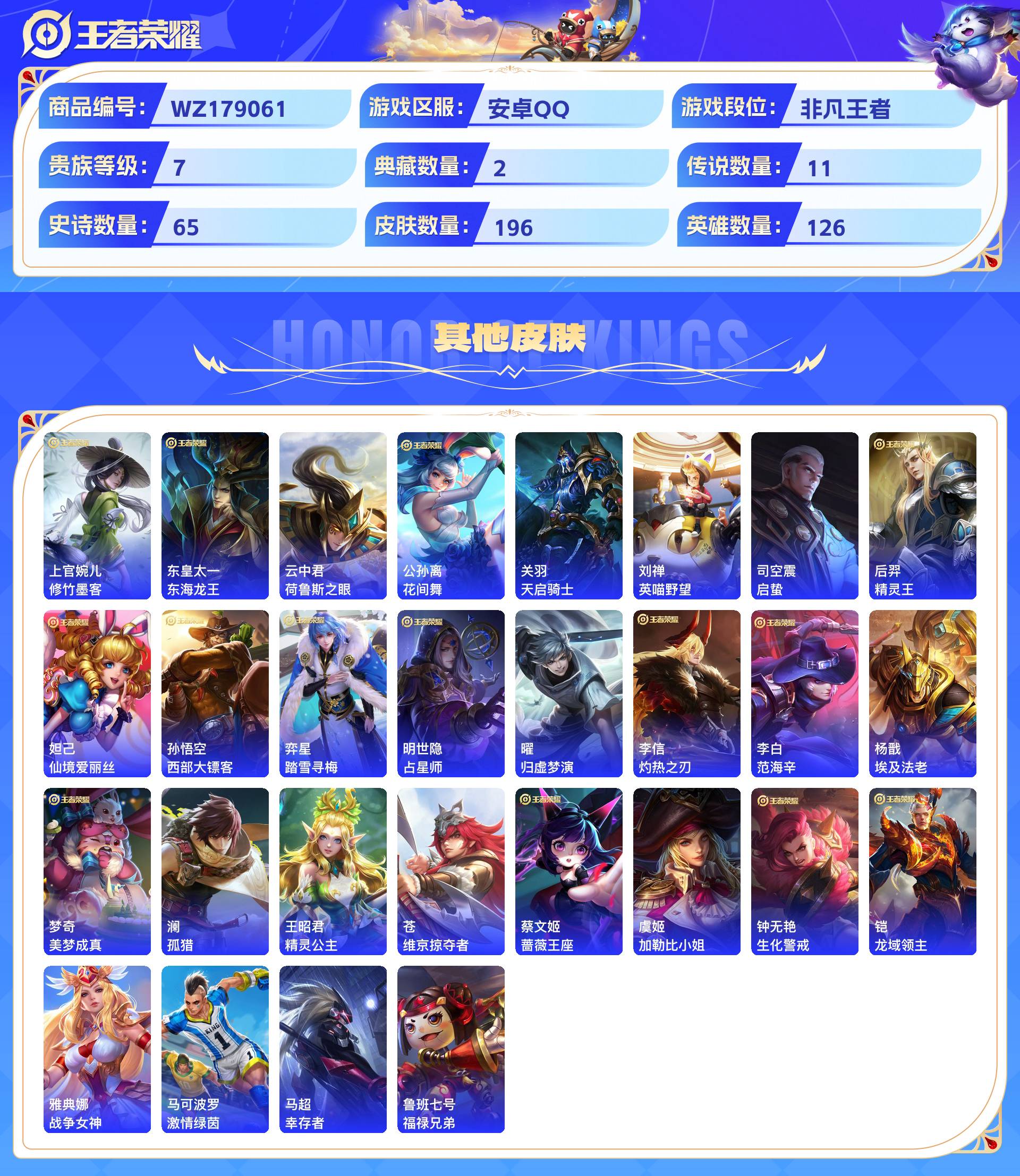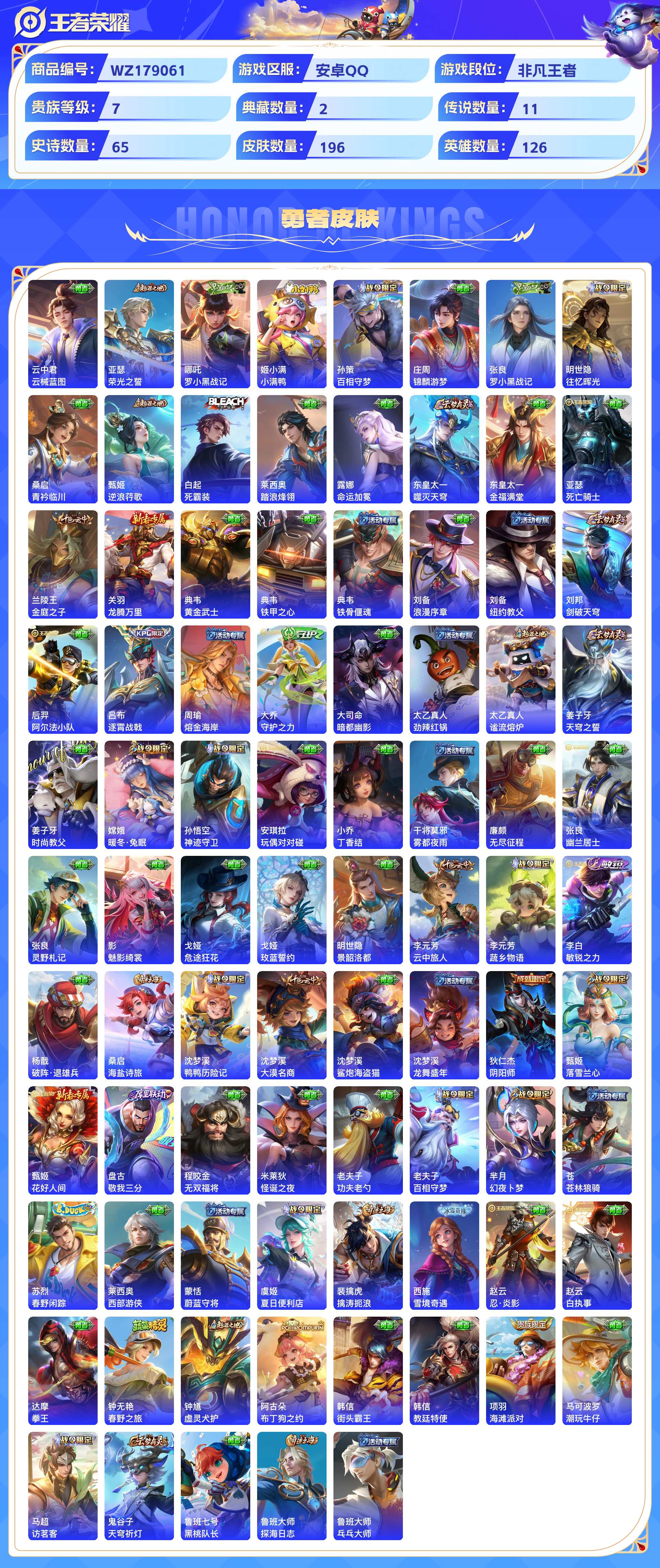 2320663-安卓qq 196皮 贵族7级 2典藏 1珍品传说 11传说 65史诗【荣耀典藏】全息碎影弑呛猎影【珍品传说】器灵·落星盏【传说皮肤】九山相柳幻光神呛战鼓燎原愿照·山河定地狱火末日机甲鸣野蒿愿照·九州拓愿照·岁时盈淬星耀世绛天战甲【史诗皮肤】涂山容容傩神司百相守梦光弋星穹百相守梦心灵战警破空之剑箭羽风息无限星赏官暗隐猎兽者天才门将鸭鸭
