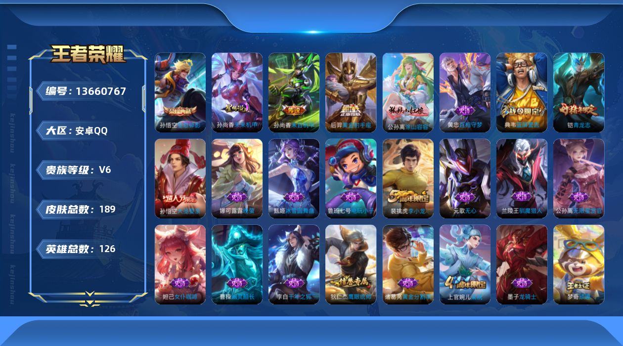 [13660767]可二次【店主推荐捡漏号!可直接换绑】:安卓q-v6-最强王者段位-126英雄-189皮肤-1典藏-1星元-2传说-42史诗 【英雄全皮】:影全皮 【荣耀典藏】:孙悟空全息碎影 【传说皮肤】:后羿黄金射手座,孙尚香末日机甲 【限定皮肤】:白起狰,蒙犽顽岩魄,狄仁杰阴阳师,赵云皇家上将,鲁班七号狮舞东方,高渐离玩趣恶龙,白起夜都怪侠,芈月重明,芈月幻夜卜梦,周瑜赤莲之焰,元歌无心,夏侯惇朔风刀,夏侯惇匿光决锋者,曹操烛龙,典韦穷奇,典韦蓝屏警告,狄仁杰魔术师,狄仁杰万华元夜,达摩沙漠行僧,项羽海滩派对,老夫子醍醐杖,程咬金演武夺筹,兰陵王驯魔猎人,兰陵王金庭之子,孙悟空大圣娶亲,牛魔御旌,李元芳云中旅人,钟馗神迹守卫,钟馗驱傩正仪,杨玉环遇见飞天,女娲朔望之晖,蔡文姬繁星吟游,鬼谷子原初探秘者,黄忠火炮绅士,铠青龙志,弈星混沌棋,梦奇顽趣,明世隐疑决卦,明世隐吟游魔法,裴擒虎李小龙,裴擒虎擒涛扼浪,狂铁御狮,米莱狄御霄,盾山御銮,上官婉儿梁祝,鲁班大师探海日志,桑启海盐诗旅,张良古海寻踪,鬼谷子天穹祈灯,刘邦剑破天穹,周瑜熔金海岸 【年限皮肤】:铠青龙志 【赛季限定】:白起狰,芈月重明,夏侯惇朔风刀,曹操烛龙,典韦穷奇,狄仁杰万华元夜,达摩沙漠行僧,老夫子醍醐杖,程咬金演武夺筹,兰陵王金庭之子,张良古海寻踪,牛魔御旌,李元芳云中旅人,钟馗驱傩正仪,鬼谷子原初探秘者,弈星混沌棋,梦奇顽趣,明世隐疑决卦,裴擒虎擒涛扼浪,狂铁御狮,米莱狄御霄,盾山御銮,鲁班大师探海日志,桑启海盐诗旅,鬼谷子天穹祈灯,刘邦剑破天穹 【战令限定】:鲁班七号狮舞东方,白起夜都怪侠,芈月幻夜卜梦,周瑜赤莲之焰,典韦蓝屏警告,兰陵王驯魔猎人,钟馗神迹守卫,女娲朔望之晖,黄忠火炮绅士,明世隐吟游魔法 【史诗皮肤】:鲁班七号电玩小子,赵云皇家上将,赵云未来纪元,甄姬冰雪圆舞曲,王昭君偶像歌手,狄仁杰魔术师,宫本武藏鬼剑武藏,孙尚香水果甜心,妲己魅力维加斯,妲己女仆咖啡,墨子龙骑士,曹操幽灵船长,李白千年之狐,韩信白龙吟,刘邦德古拉伯爵,兰陵王暗隐猎兽者,诸葛亮黄金分割率,亚瑟心灵战警,雅典娜冰冠公主,李元芳逐浪之夏,杨玉环遇见飞天,铠青龙志,孙悟空大圣娶亲,典韦蓝屏警告,鲁班七号狮舞东方,狄仁杰鹰眼统帅,公孙离无限星赏官,兰陵王驯魔猎人,上官婉儿梁祝,蔡文姬繁星吟游,娜可露露晚萤,裴擒虎李小龙,黄忠火炮