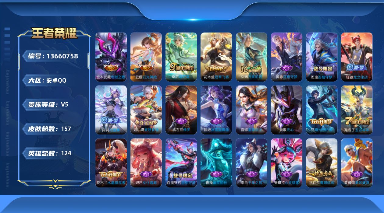 [13660758]可二次【店主推荐捡漏号!可直接换绑】:安卓q-v5-至尊星耀v段位-124英雄-157皮肤-4传说-42史诗 【传说皮肤】:云缨幻光神呛,桑启鸣野蒿,花木兰冠军飞将,宫本武藏地狱之眼 【限定皮肤】:姜子牙天穹之誓,杨戬破阵退雄兵,狄仁杰阴阳师,赵云皇家上将,孙尚香蔷薇恋人,元歌无心,狄仁杰万华元夜,达摩沙漠行僧,项羽海滩派对,程咬金演武夺筹,李元芳云中旅人,鬼谷子原初探秘者,鬼谷子五谷丰年,苏烈千军破阵,百里玄策原初追逐者,沈梦溪大漠名商,鲁班大师探海日志,桑启海盐诗旅,阿古朵江河有灵,张良古海寻踪,高渐离燃音魔法,妲己灵卜魔法,鬼谷子天穹祈灯,姬小满妄想食味,鲁班七号蔬乡物语,李元芳蔬乡物语,刘邦剑破天穹,程咬金群星魔术团,刘备异域游侠,周瑜熔金海岸 【赛季限定】:狄仁杰万华元夜,达摩沙漠行僧,程咬金演武夺筹,张良古海寻踪,李元芳云中旅人,鬼谷子原初探秘者,苏烈千军破阵,百里玄策原初追逐者,沈梦溪大漠名商,鲁班大师探海日志,桑启海盐诗旅,鬼谷子天穹祈灯,刘邦剑破天穹,姜子牙天穹之誓 【战令限定】:高渐离燃音魔法,妲己灵卜魔法,鲁班七号蔬乡物语,李元芳蔬乡物语 【史诗皮肤】:露娜紫霞仙子,赵云皇家上将,赵云未来纪元,甄姬冰雪圆舞曲,王昭君偶像歌手,宫本武藏鬼剑武藏,孙尚香蔷薇恋人,孙尚香水果甜心,嬴政暗夜贵公子,嬴政摇滚巨星,妲己魅力维加斯,妲己女仆咖啡,墨子金属风暴,曹操幽灵船长,李白千年之狐,张飞乱世虎臣,花木兰水晶猎龙者,夏侯惇乘风破浪,兰陵王暗隐猎兽者,诸葛亮黄金分割率,安琪拉心灵骇客,铠曙光守护者,程咬金功夫厨神,白起星夜王子,阿轲节奏热浪,伽罗箭羽风息,狄仁杰鹰眼统帅,橘右京修罗,百里玄策原初追逐者,杨戬天秀启明,鬼谷子五谷丰年,元歌无心,阿古朵江河有灵,妲己灵卜魔法,高渐离燃音魔法,姬小满妄想食味,鲁班七号蔬乡物语,百里守约百相守梦,阿轲化蝶舞,狂铁龙之律动,周瑜百相守梦,黄忠百相守梦,女娲万灵启世 【其他皮肤】:项羽海滩派对,韩信教廷特使,韩信街头霸王,露娜哥特玫瑰,赵云白执事,赵云忍炎影,芈月红桃皇后,牛魔西部大镖客,宫本武藏未来纪元,孙膑天使之翼,妲己少女阿狸,典韦黄金武士,亚瑟死亡骑士,达摩拳王,宫本武藏万象初新,狄仁杰阴阳师,刘备汉昭烈帝,关羽龙腾万里,钟无艳海滩丽影,王昭君幻想奇妙夜,狂铁命运角斗场,老夫子功夫老勺,孙尚香沉稳之力,诸葛亮