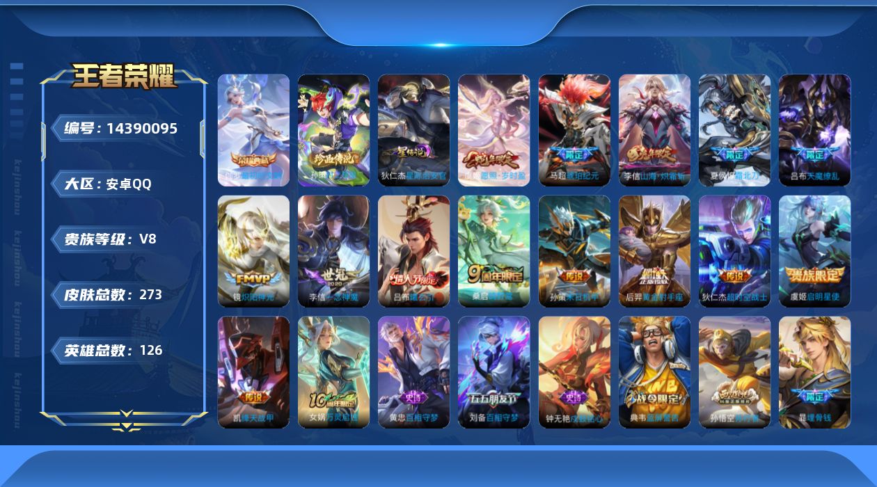 [14390095]【店主推荐捡漏号!可直接换绑】安卓q-v8-最强王者段位-126英雄-273皮肤-1典藏皮肤-1珍品传说-15传说-92史诗 【英雄全皮】:李信全皮,戈娅全皮,海诺全皮 【荣耀典藏】:伽罗最初的交响 【珍品传说】:孙策时之奇旅 【传说皮肤】:后羿神树通天,虞姬愿照岁时盈,桑启鸣野蒿,夏侯惇霜北刀,吕布曦玄引,马超琥珀纪元,李信山海炽霜斩,孙策末日机甲,铠绛天战甲,镜炽阳神光,虞姬启明星使,李信一念神魔,后羿黄金射手座,吕布天魔缭乱,狄仁杰超时空战士 【限定皮肤】:夏侯惇霜北刀,暃埋骨钱,蔡文姬夏日便利店,虞姬夏日便利店,姜子牙天穹之誓,狄仁杰阴阳师,赵云皇家上将,鲁班七号狮舞东方,庄周高山流水,高渐离玩趣恶龙,白起夜都怪侠,芈月幻夜卜梦,吕布天魔缭乱,元歌无心,典韦蓝屏警告,狄仁杰魔术师,达摩沙漠行僧,项羽海滩派对,关羽冰锋战神,韩信傲雪梅呛,兰陵王驯魔猎人,兰陵王金庭之子,花木兰默契交锋,孙悟空孙行者,刘备百相守梦,李元芳银河之约,李元芳云中旅人,虞姬启明星使,干将莫邪真爱魔法,雅典娜黎明之约,鬼谷子五谷丰年,黄忠火炮绅士,苏烈千军破阵,沈梦溪大漠名商,明世隐吟游魔法,裴擒虎李小龙,裴擒虎擒涛扼浪,狂铁电玩高手,李信山海炽霜斩,上官婉儿梁祝,嫦娥拒霜思,嫦娥暖冬兔眠,西施玲珑珍味,鲁班大师探海日志,桑启海盐诗旅,暃星界游侠,戈娅驭风魔法,艾琳流音漫舞,司空震地狱燃心,阿古朵江河有灵,张良古海寻踪,高渐离燃音魔法,妲己灵卜魔法,鬼谷子天穹祈灯,马超琥珀纪元,姬小满妄想食味,吕布曦玄引,沈梦溪龙舞盛年,鲁班七号蔬乡物语,李元芳蔬乡物语,刘邦剑破天穹,程咬金群星魔术团,关羽决胜骁骑,镜青焰无极,项羽苍威无极,海诺心动手记,芈月浮光幕影,周瑜熔金海岸 【年限皮肤】:李信山海炽霜斩 【赛季限定】:达摩沙漠行僧,兰陵王金庭之子,张良古海寻踪,李元芳云中旅人,雅典娜黎明之约,苏烈千军破阵,沈梦溪大漠名商,裴擒虎擒涛扼浪,鲁班大师探海日志,桑启海盐诗旅,鬼谷子天穹祈灯,刘邦剑破天穹,姜子牙天穹之誓 【战令限定】:蔡文姬夏日便利店,虞姬夏日便利店,鲁班七号狮舞东方,白起夜都怪侠,芈月幻夜卜梦,典韦蓝屏警告,兰陵王驯魔猎人,艾琳流音漫舞,李元芳银河之约,干将莫邪真爱魔法,黄忠火炮绅士,明世隐吟游魔法,狂铁电玩高手,嫦娥暖冬兔眠,西施玲珑珍味,司空震地狱燃心,暃星界游侠,戈娅驭风魔法