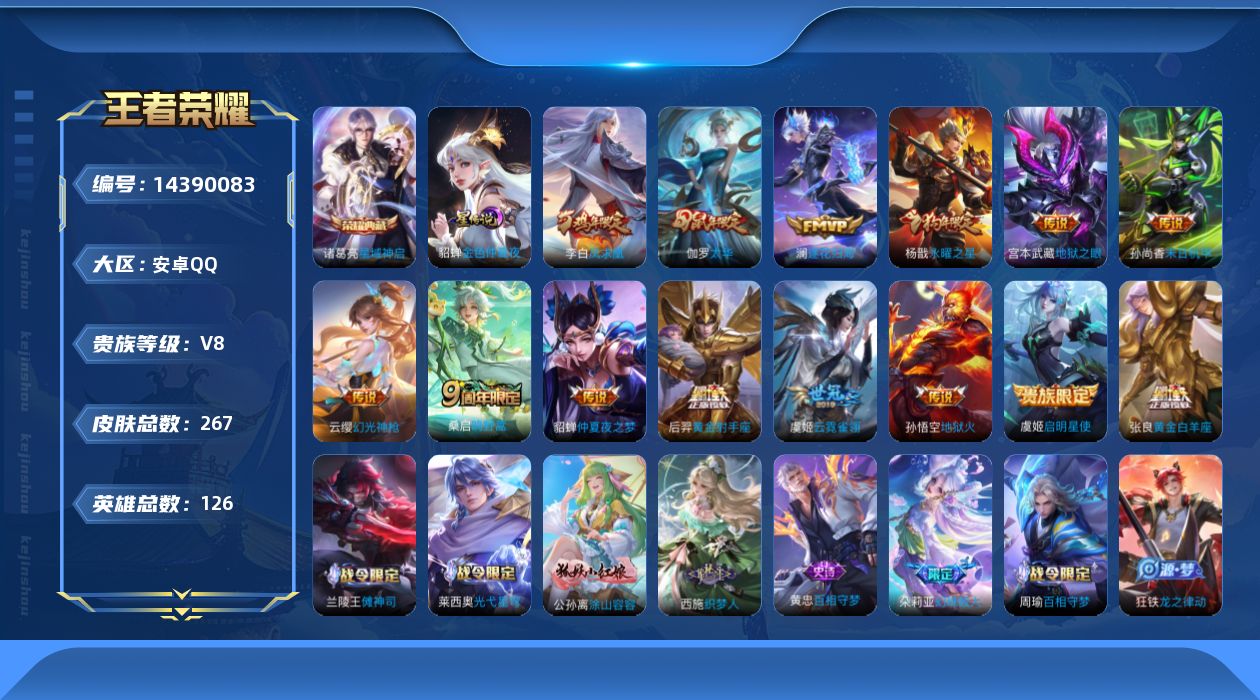 [14390083]【店主推荐捡漏号!可直接换绑】,安卓q-v8-最强王者段位-126英雄-267皮肤-1典藏皮肤-14传说-88史诗 【英雄全皮】:蒙恬全皮,空空儿全皮,影全皮 【荣耀典藏】:诸葛亮星域神启 【传说皮肤】:云缨幻光神呛,桑启鸣野蒿,澜逐花归海,虞姬启明星使,伽罗太华,张良黄金白羊座,虞姬云霓雀翎,后羿黄金射手座,杨戬永曜之星,貂蝉仲夏夜之梦,李白凤求凰,孙尚香末日机甲,宫本武藏地狱之眼,孙悟空地狱火 【限定皮肤】:蒙犽顽岩魄,姜子牙天穹之誓,狄仁杰阴阳师,赵云皇家上将,赵云引擎之心,妲己时之彼端,妲己时之奇旅,嬴政白昼王子,鲁班七号狮舞东方,芈月重明,吕布猎兽之王,周瑜赤莲之焰,元歌云间偶戏,夏侯惇朔风刀,曹操天狼征服者,典韦蓝屏警告,典韦岱宗,马可波罗暗影游猎,狄仁杰魔术师,狄仁杰万华元夜,达摩星际陆战队,项羽海滩派对,老夫子醍醐杖,安琪拉魔法小厨娘,程咬金演武夺筹,韩信飞衡,王昭君凤凰于飞,兰陵王驯魔猎人,花木兰瑞麟志,孙悟空至尊宝,孙悟空大圣娶亲,牛魔御旌,后羿辉光之辰,李元芳银河之约,虞姬启明星使,钟馗神迹守卫,钟馗驱傩正仪,杨戬永曜之星,女娲朔望之晖,干将莫邪胡桃夹子,蔡文姬繁星吟游,鬼谷子原初探秘者,铠青龙志,苏烈玄武志,百里守约朱雀志,弈星混沌棋,沈梦溪星空之诺,明世隐疑决卦,裴擒虎李小龙,裴擒虎擒涛扼浪,狂铁御狮,米莱狄御霄,瑶山海碧波行,云中君纤云弄巧,伽罗太华,盾山御銮,猪八戒西部大镖客,上官婉儿梁祝,嫦娥如梦令,鲁班大师探海日志,桑启海盐诗旅,蒙恬荣光圣徽,鬼谷子天穹祈灯,沈梦溪龙舞盛年,刘邦剑破天穹,镜青焰无极,项羽苍威无极,周瑜熔金海岸 【年限皮肤】:百里守约朱雀志,花木兰瑞麟志,铠青龙志,苏烈玄武志,王昭君凤凰于飞,李白凤求凰,杨戬永曜之星,后羿辉光之辰,伽罗太华,韩信飞衡,典韦岱宗,瑶山海碧波行 【赛季限定】:芈月重明,夏侯惇朔风刀,狄仁杰万华元夜,老夫子醍醐杖,程咬金演武夺筹,牛魔御旌,钟馗驱傩正仪,鬼谷子原初探秘者,弈星混沌棋,明世隐疑决卦,裴擒虎擒涛扼浪,狂铁御狮,米莱狄御霄,盾山御銮,鲁班大师探海日志,桑启海盐诗旅,鬼谷子天穹祈灯,蒙恬荣光圣徽,刘邦剑破天穹,姜子牙天穹之誓 【战令限定】:嬴政白昼王子,鲁班七号狮舞东方,吕布猎兽之王,周瑜赤莲之焰,元歌云间偶戏,典韦蓝屏警告,马可波罗暗影游猎,达摩星际陆战队,兰陵王驯魔猎人,李元