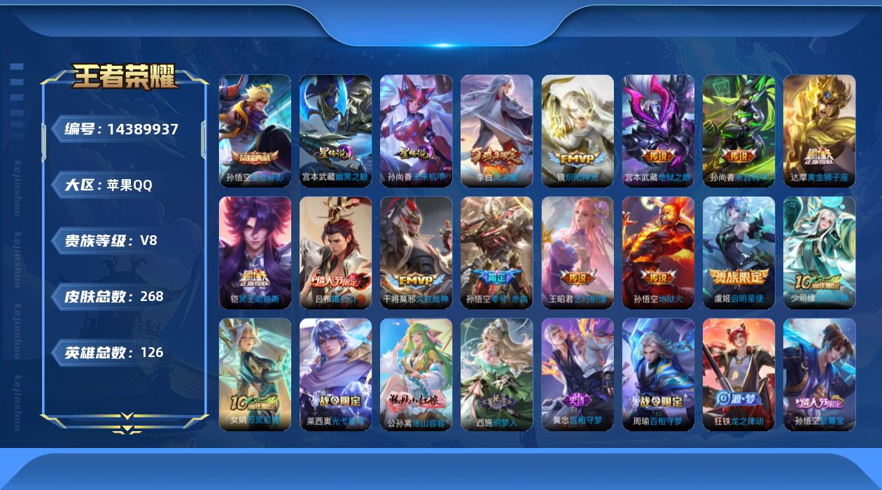[14389937]【店主推荐捡漏号!可直接换绑/8888省100孙悟空】:苹果q-v8-最强王者段位-126英雄-268皮肤-1典藏皮肤-12传说-2星元-71史诗 【英雄全皮】:孙权全皮,鬼谷子全皮 【荣耀典藏】:孙悟空全息碎影 【传说皮肤】:铠冥王哈迪斯,吕布曦玄引,王昭君乞巧织情,镜炽阳神光,虞姬启明星使,孙悟空零号赤焰,干将莫邪久胜战神,达摩黄金狮子座,李白凤求凰,孙尚香末日机甲,宫本武藏地狱之眼,孙悟空地狱火 【限定皮肤】:白起狰,铠冥王哈迪斯,大乔绒语心约,虞姬夏日便利店,姜子牙天穹之誓,狄仁杰阴阳师,虞姬凯尔特女王,赵云皇家上将,赵云引擎之心,赵云龙胆,嬴政白昼王子,高渐离死亡摇滚,阿轲迷踪丽影,扁鹊炼金王,芈月重明,芈月白晶晶,吕布猎兽之王,周瑜赤莲之焰,元歌云间偶戏,夏侯惇朔风刀,曹操烛龙,典韦穷奇,典韦蓝屏警告,狄仁杰魔术师,狄仁杰万华元夜,达摩沙漠行僧,项羽海滩派对,老夫子醍醐杖,程咬金演武夺筹,露娜一生所爱,刘邦夺宝奇兵,韩信飞衡,兰陵王驯魔猎人,兰陵王金庭之子,花木兰瑞麟志,亚瑟潮玩骑士王,孙悟空至尊宝,孙悟空大圣娶亲,孙悟空零号赤焰,牛魔御旌,后羿辉光之辰,后羿如梦令,李元芳银河之约,李元芳云中旅人,虞姬启明星使,钟馗驱傩正仪,杨玉环遇见飞天,女娲朔望之晖,干将莫邪冰霜恋舞曲,雅典娜单词大作战,太乙真人饕餮,鬼谷子原初探秘者,鬼谷子五谷丰年,黄忠烈魂,苏烈千军破阵,百里玄策原初追逐者,百里守约朱雀志,弈星混沌棋,梦奇顽趣,沈梦溪星空之诺,沈梦溪大漠名商,明世隐疑决卦,裴擒虎天狼狩猎者,裴擒虎李小龙,裴擒虎擒涛扼浪,狂铁御狮,米莱狄御霄,云中君纤云弄巧,盾山御銮,蒙犽狂想玩偶喵,桑启海盐诗旅,艾琳流音漫舞,鬼谷子天穹祈灯,吕布曦玄引,沈梦溪龙舞盛年,周瑜熔金海岸 【年限皮肤】:百里守约朱雀志,花木兰瑞麟志,李白凤求凰,后羿辉光之辰,韩信飞衡,黄忠烈魂,赵云龙胆 【赛季限定】:扁鹊炼金王,白起狰,芈月重明,夏侯惇朔风刀,曹操烛龙,典韦穷奇,狄仁杰万华元夜,达摩沙漠行僧,老夫子醍醐杖,程咬金演武夺筹,兰陵王金庭之子,牛魔御旌,李元芳云中旅人,虞姬凯尔特女王,钟馗驱傩正仪,太乙真人饕餮,鬼谷子原初探秘者,苏烈千军破阵,百里玄策原初追逐者,弈星混沌棋,梦奇顽趣,沈梦溪大漠名商,明世隐疑决卦,裴擒虎擒涛扼浪,狂铁御狮,米莱狄御霄,盾山御銮,桑启海盐诗旅,鬼谷子天穹祈