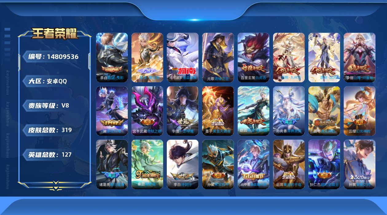 [14809536]可二次 贵族8-319皮-0珍品无双-典藏1-无双1-珍品传说1-传说25-全皮7-改名卡3-星传说幽冥火 幽冥之眼 星际治安官 安卓手q104区319皮1典藏25传说1无双1珍品传说v8 营地id422578854荣耀王者【珍品传说皮肤】:怪盗基德【无双皮肤】:器灵·螭龙剑【荣耀典藏】:鸣剑·曳影【优质限定皮肤】:至尊宝白虎志神威山海·炽霜斩【传说皮肤】:神树通天地