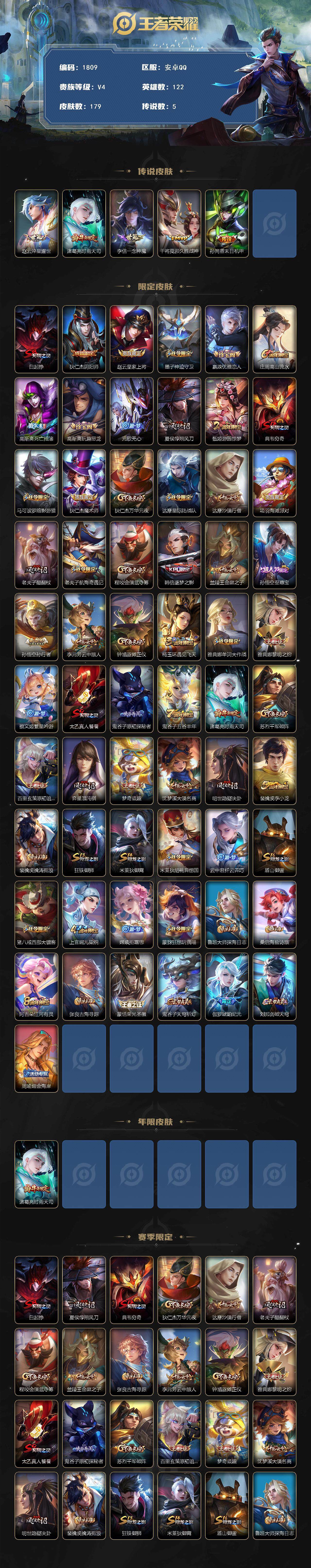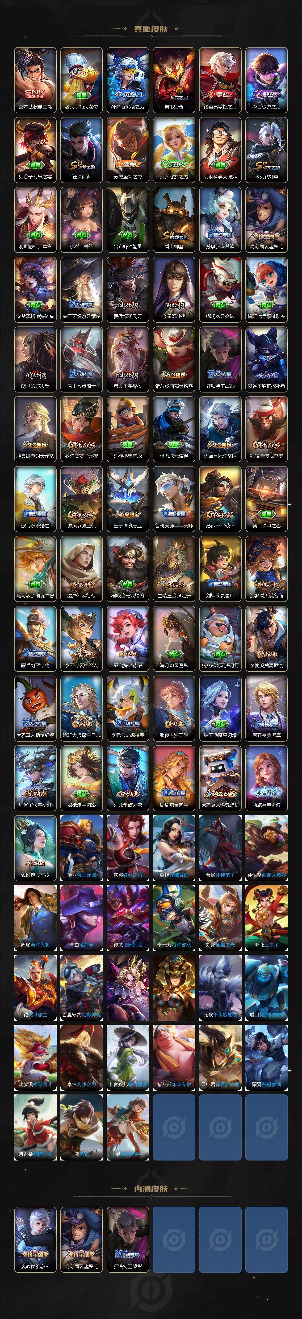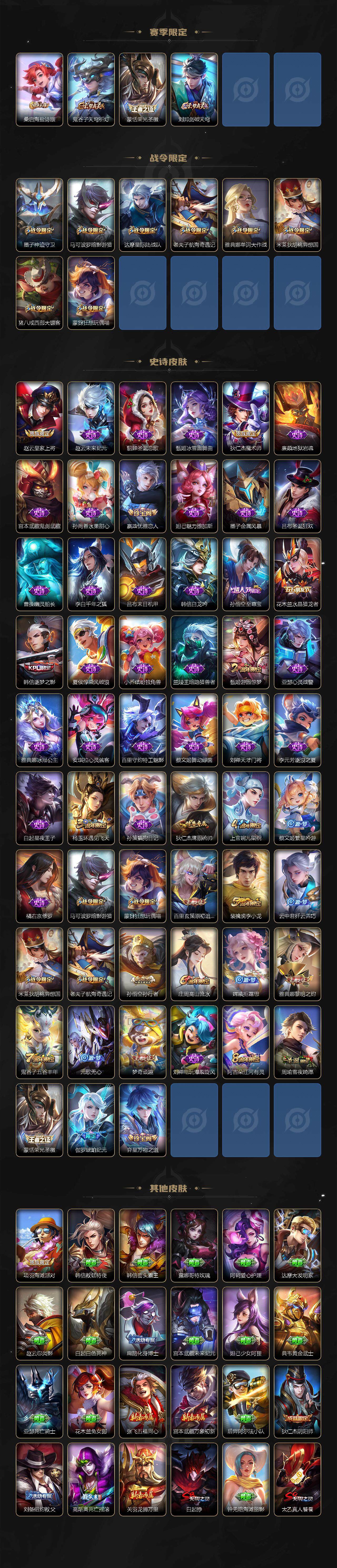 122英雄-179皮肤-贵族4/皮肤179/传说5/史诗57/英雄122/淬星耀世 赵云/时雨天司 诸葛亮/一念神魔 李信/久胜战神 干将莫邪/末日机甲 孙尚香/狰 白起/阴阳师 狄仁杰/皇家上将 赵云/神迹守卫 墨子/优雅恋人 嬴政/高山流水 庄周/死亡摇滚 高渐离/玩趣恶龙 高渐离/无心 元歌/朔风刀 夏侯惇/游园惊梦 甄姬/穷奇 典韦/暗影游猎 马可波罗/魔术师 狄仁杰/万华元夜 狄仁杰/星际陆战队 达摩/沙漠