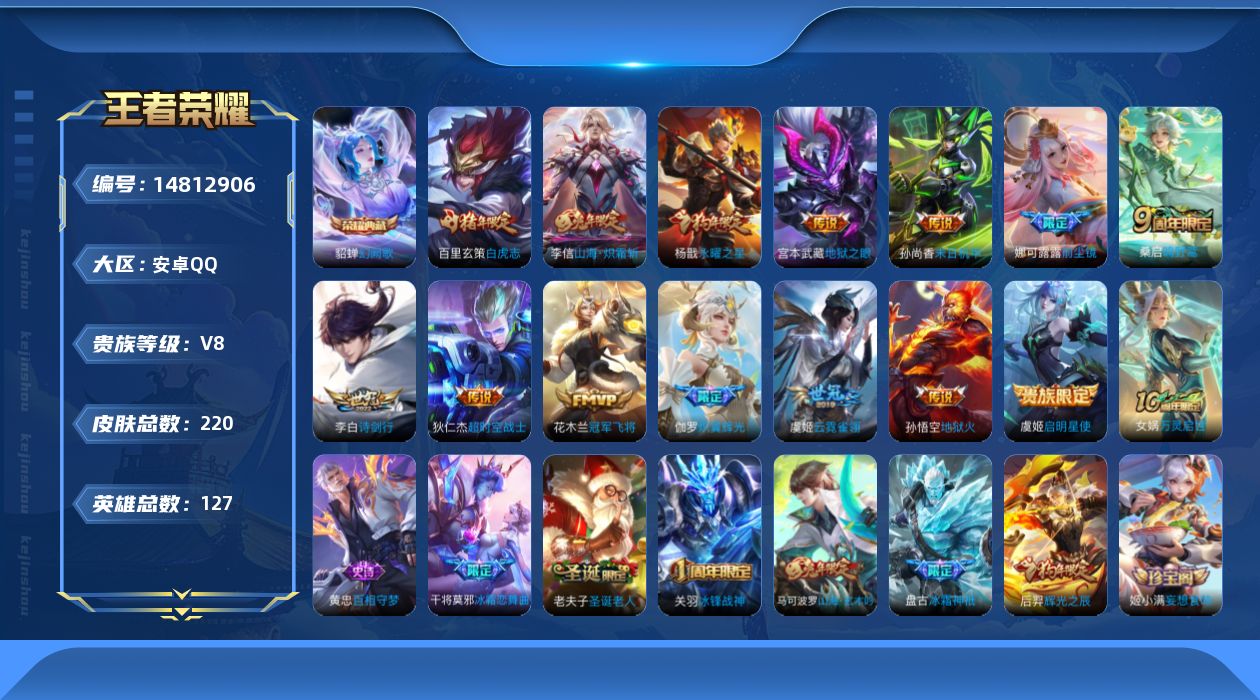 [14812906]v8 1典藏 14传说 127英雄 220皮肤 可修改实名 【英雄全皮】敖隐全皮 【稀有英雄】大司命敖隐小龙人夏洛特夏师傅金蝉唐僧戈娅赵云嬴政始皇帝韩信韩跳跳艾琳不知火舞娜可露露鸟人橘右京橘子 【荣耀水晶】幻阙歌貂蝉典藏 【传说皮】炽翼辉光娃娃菜牛角包山海·炽霜斩李信年限末日机甲-孙尚香绿蚂蚱地狱之眼冠军飞将超时空战士-狄仁杰地狱火云霓雀翎 【珍宝阁皮】妄想食味优雅恋人 【赛季/战令皮】醍醐杖s20大漠名商s28御銮s16烛龙s10穷奇s12御旌s15猎兽之王蜃楼王s4天穹之誓s36噬灭天穹s37擒涛扼浪s31探海日志s32狂想玩偶喵潮玩骑兵狰s8狮心王s3原初探秘者s21天穹祈灯s34古海寻踪s33海盐诗旅s30万华元夜s22白昼王子重明s11演武夺筹s23炼金王s6奇幻香踪单词大作战云中旅人s29混沌棋s18凯尔特女王s7御霄s14驱傩正仪s24御狮s13饕餮s9 【史诗皮】猫狗日记-大乔德古拉伯爵乘风破浪百相守梦-黄忠曙光守护者幽灵船长地狱岩魂乱世虎臣缤纷独角兽江河有灵水果甜心电玩小子小书包末日机甲-吕布紫霞仙子黄金分割率电玩·爆裂旋风天才门将鬼剑武藏水晶猎龙者千年之狐心灵骇客万灵启世摇滚巨星鹰眼统帅原初追逐者未来纪元-赵云黎明之约白龙吟特工魅影繁星吟游呼啦呼啦赏金猎手女仆咖啡魅力维加斯偶像歌手 【限定皮】圣诞老人冰霜恋舞曲辉光之辰遇见飞天李小龙梁祝诗剑行永曜之星逐梦之星山海·玄木吟马可年限鸣野蒿白虎志电光耗子冰霜神祇逐梦之影前尘镜冰锋战神 【普通皮】伊势巫女金属狂潮前尘时空谍影战争骑士圣殿之光芝加哥教父功夫老勺致命风华爱心护理次元突破热血海滩罗小黑战记-哪吒三太子花好人间鲨炮海盗猫逆浪荇歌冰雪圆舞曲极冰防御线圆桌骑士(盾山)纽约教父龙域领主汉昭烈帝海滩丽影聚星闪耀浪漫序章死神来了功夫炙烤超能战警花见巫女五福同心爱与