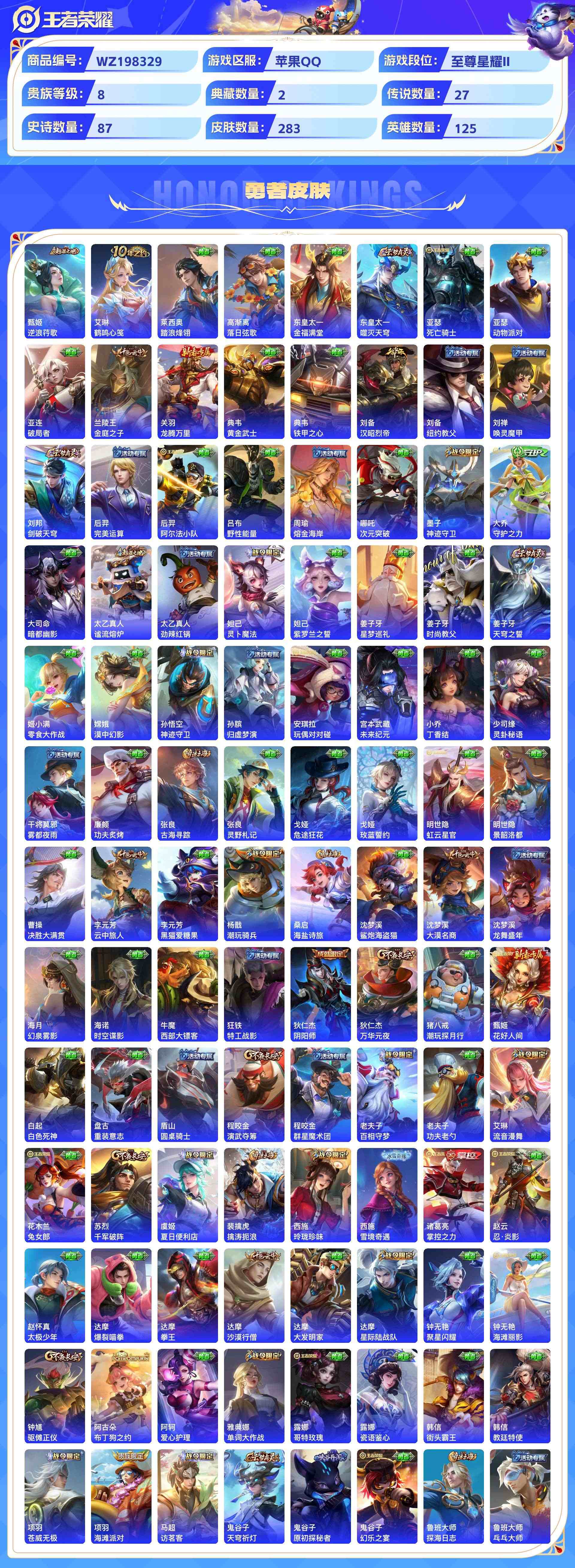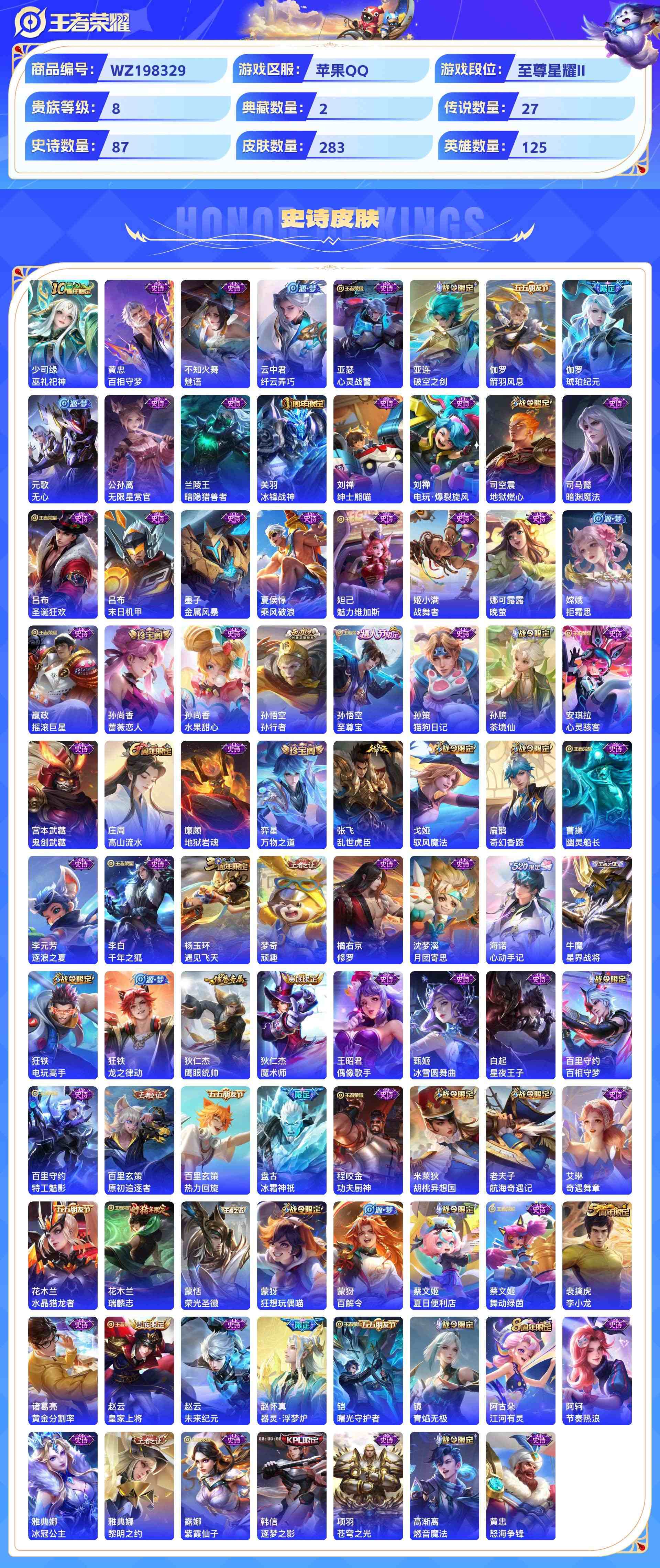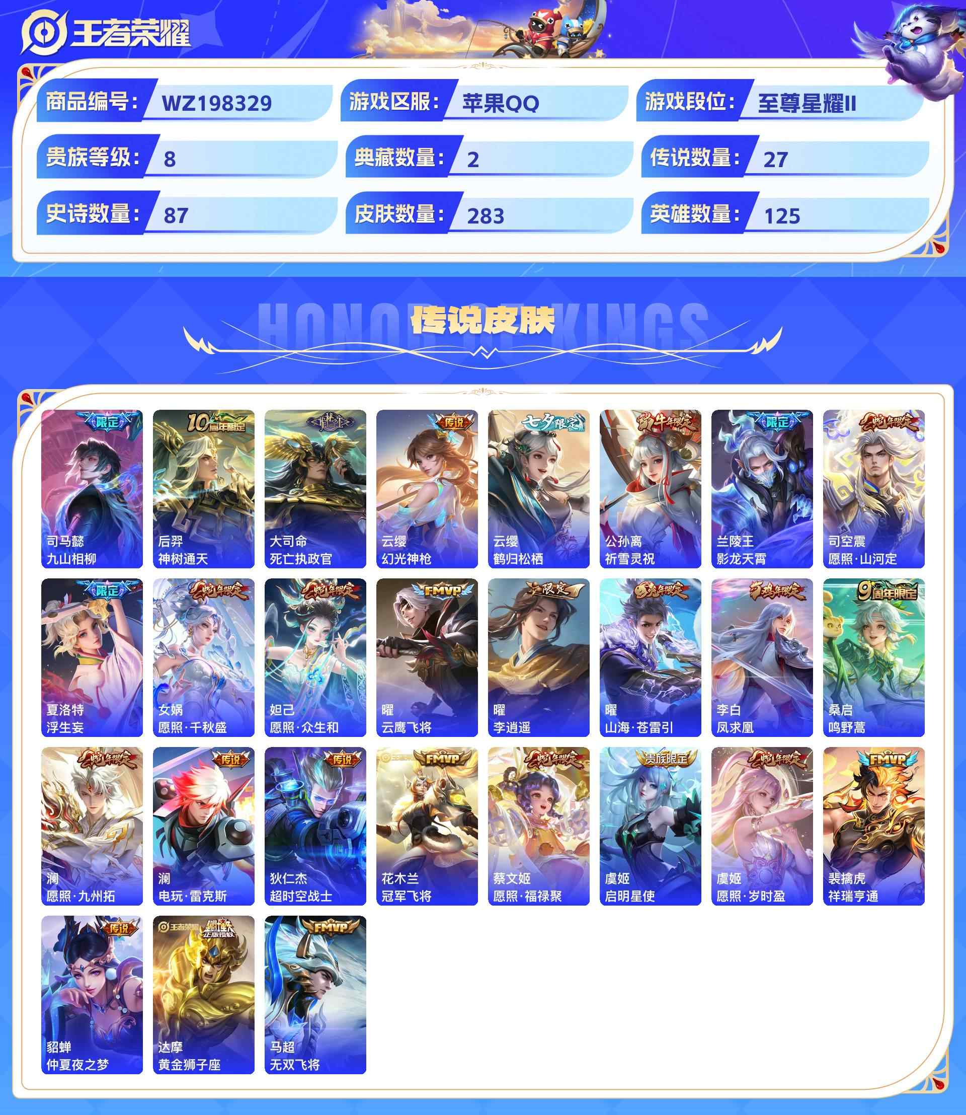 wz198329|精品金标号可二次苹果qq 贵族8级2金标(曜 云樱) 283皮 2典藏(银白咏叹调弑呛猎影) 4珍品传说(器灵·落星盏时之奇旅怪盗基德江户川柯南) 1无双(器灵·螭龙剑) 27传说(九山相柳神树通天死亡执政官幻光神呛鹤归松栖祈雪灵祝影龙天霄愿照·山河定浮生妄愿照·千秋盛愿照·众生和云鹰飞将李 ) 87史诗1星传说10个性按键2天幕
