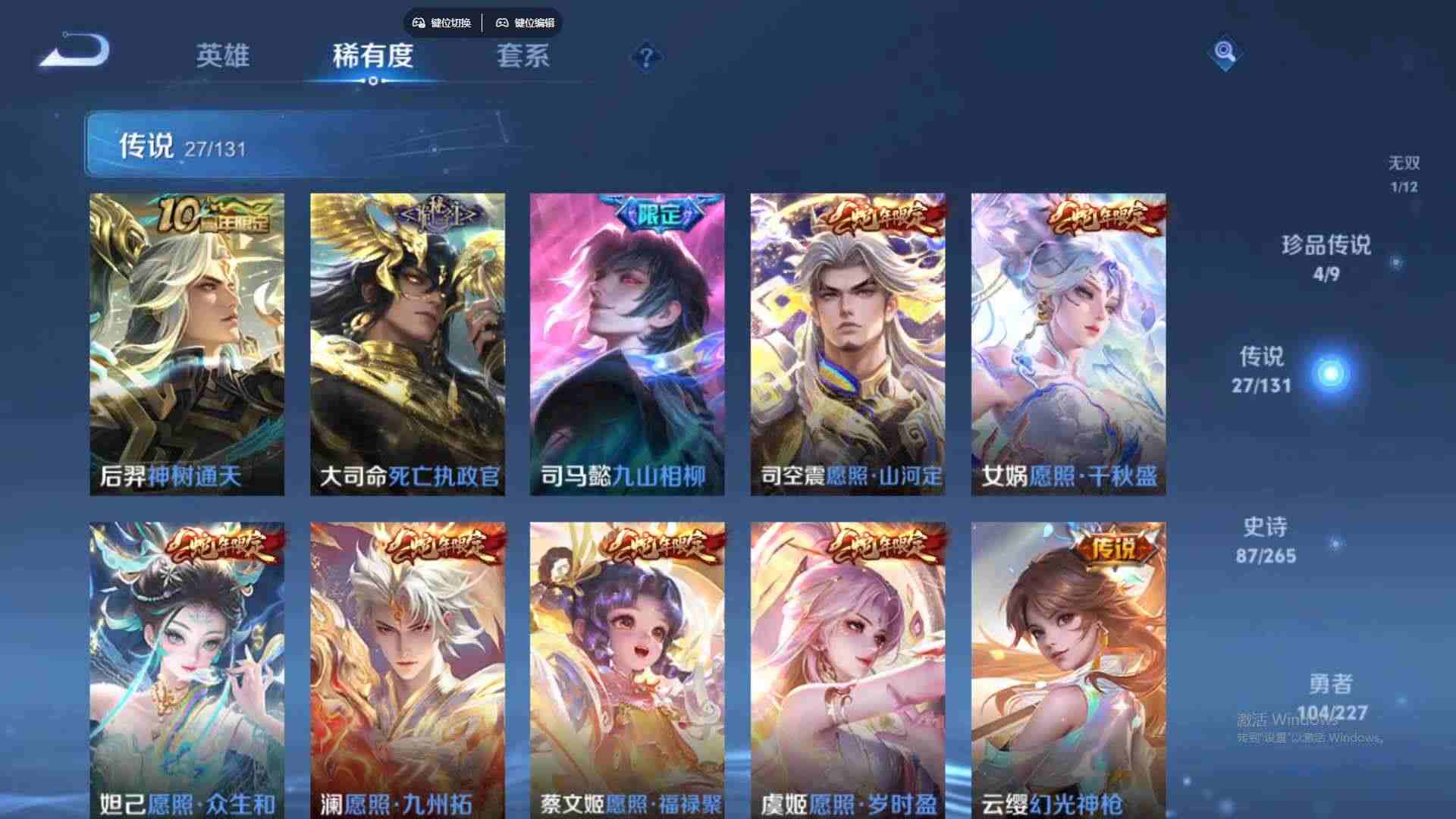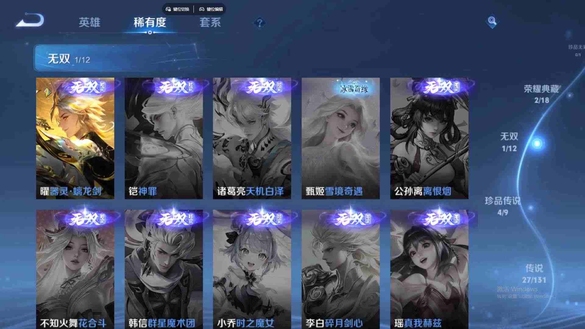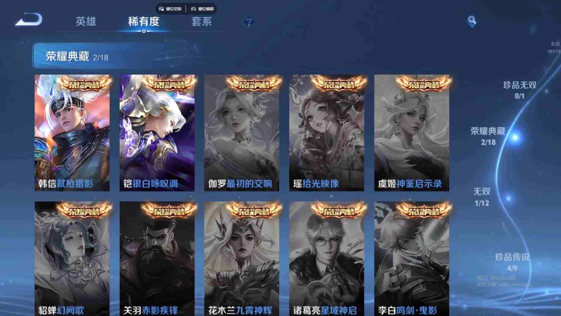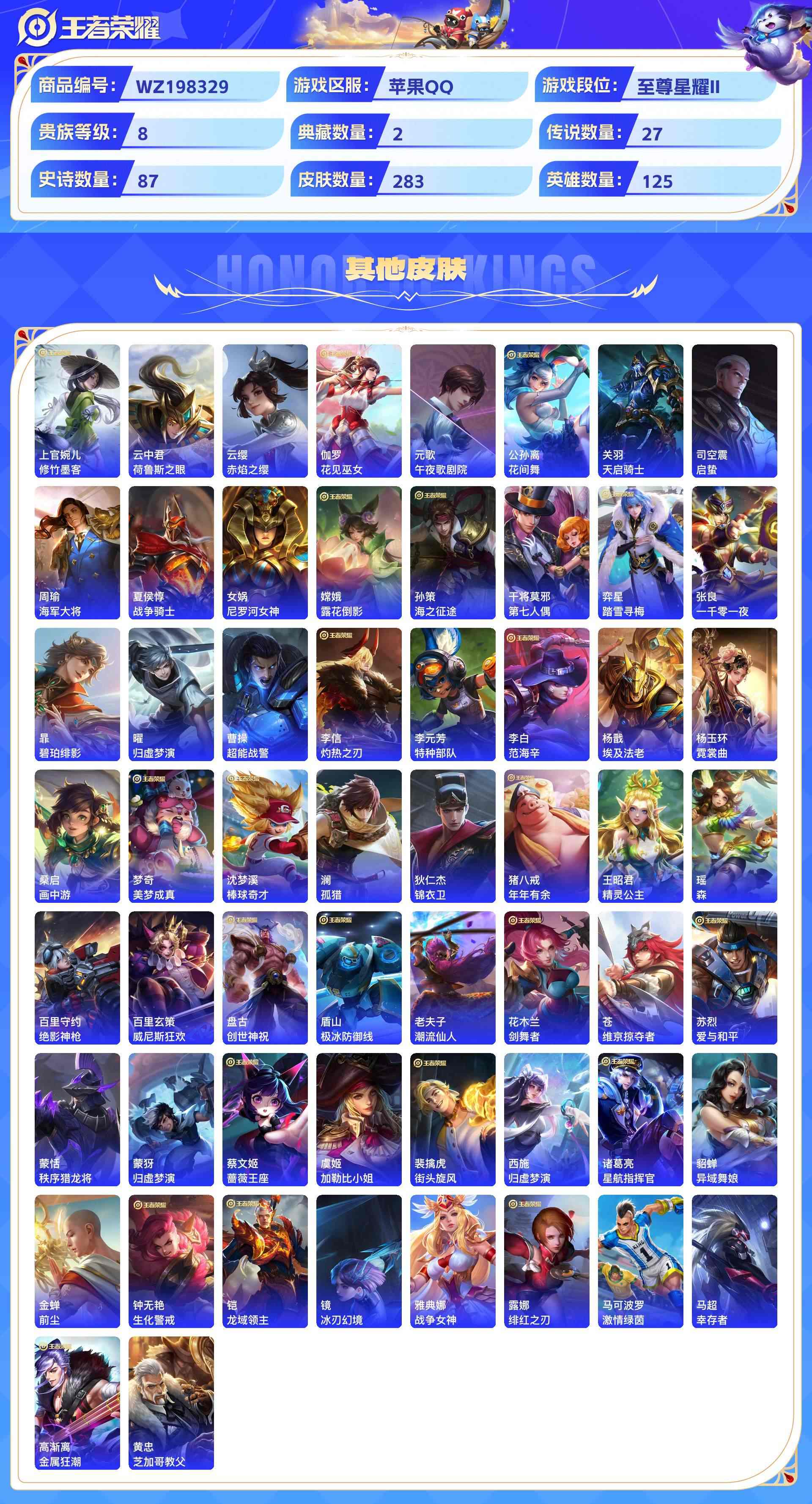 wz198329|精品金标号可二次苹果qq 贵族8级2金标(曜 云樱) 283皮 2典藏(银白咏叹调弑呛猎影) 4珍品传说(器灵·落星盏时之奇旅怪盗基德江户川柯南) 1无双(器灵·螭龙剑) 27传说(九山相柳神树通天死亡执政官幻光神呛鹤归松栖祈雪灵祝影龙天霄愿照·山河定浮生妄愿照·千秋盛愿照·众生和云鹰飞将李 ) 87史诗1星传说10个性按键2天幕