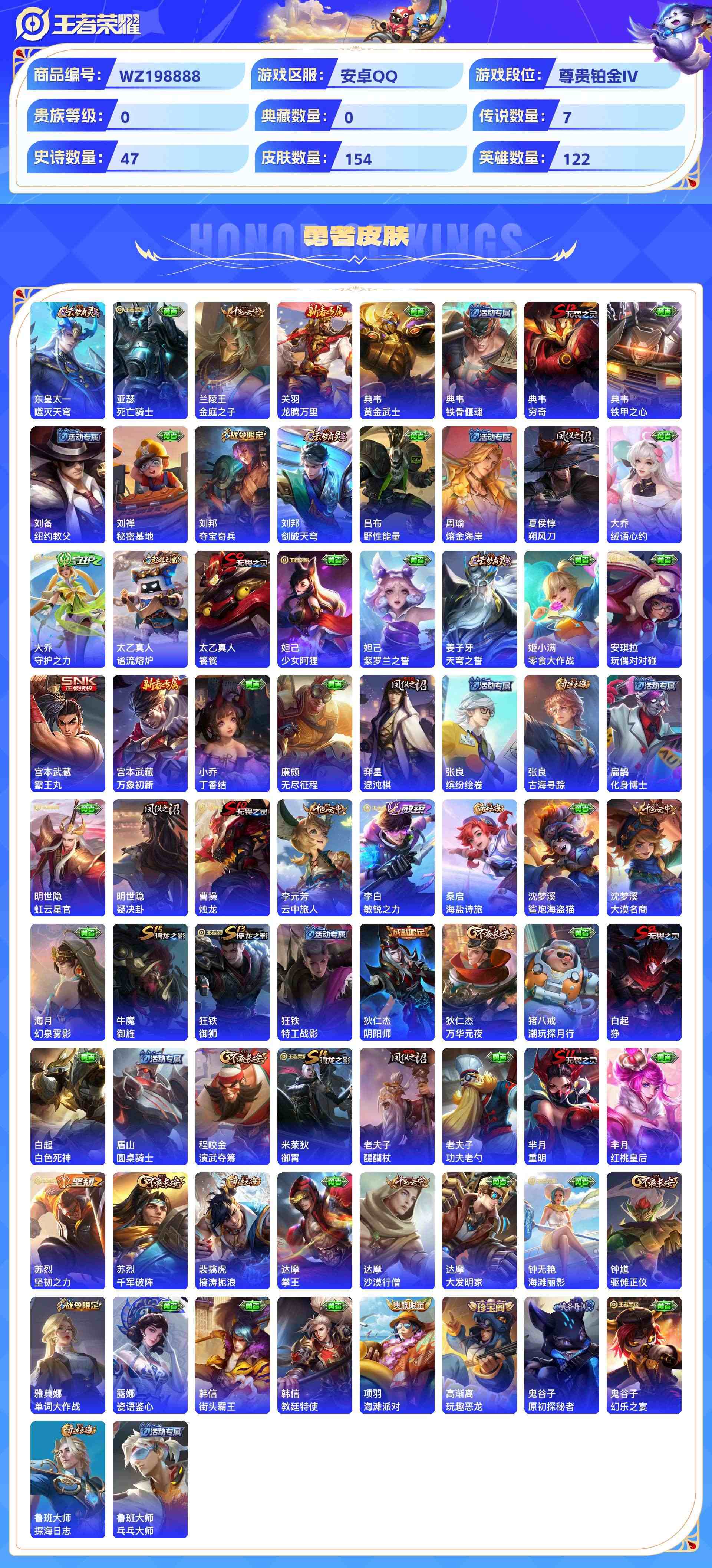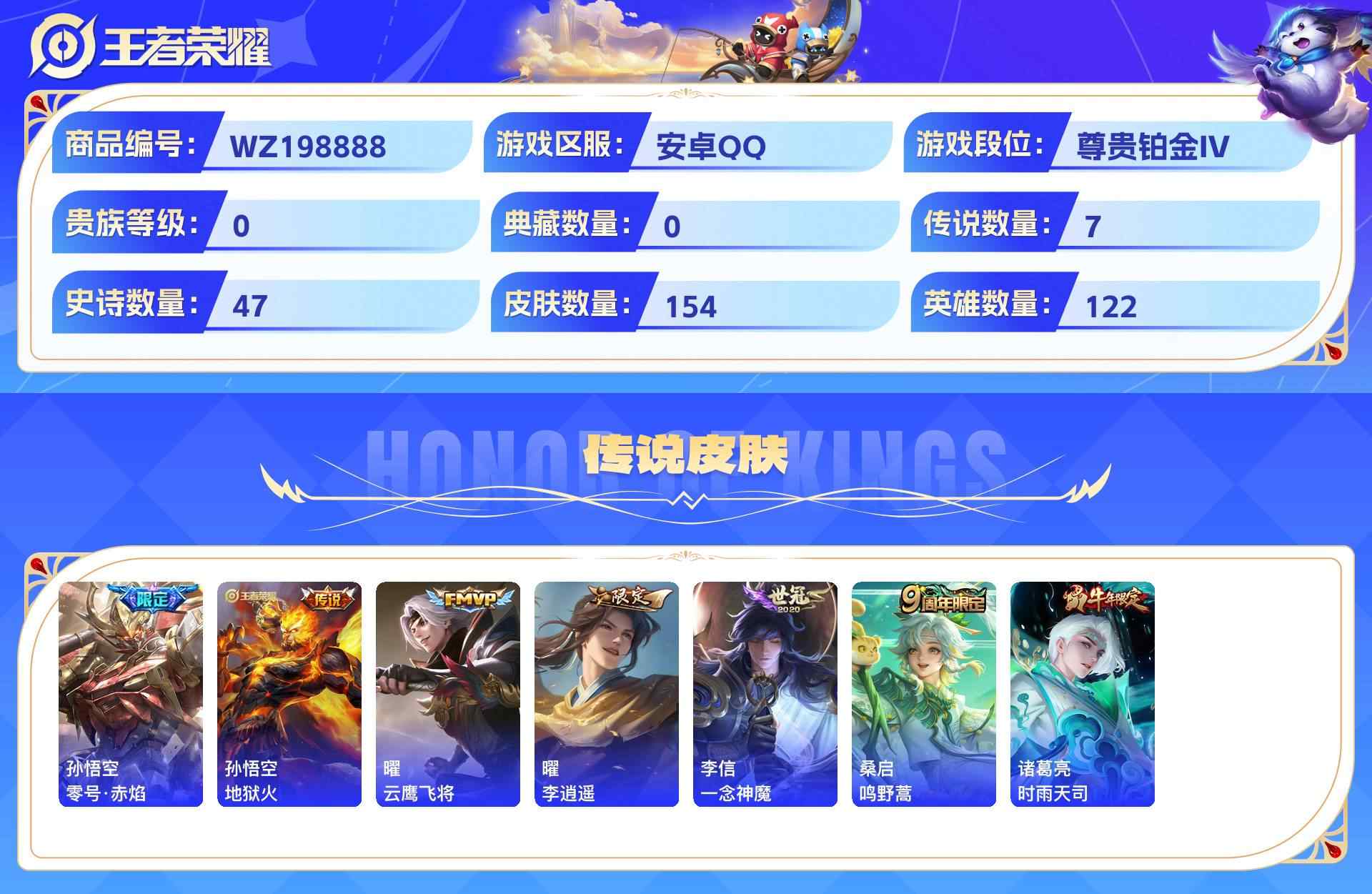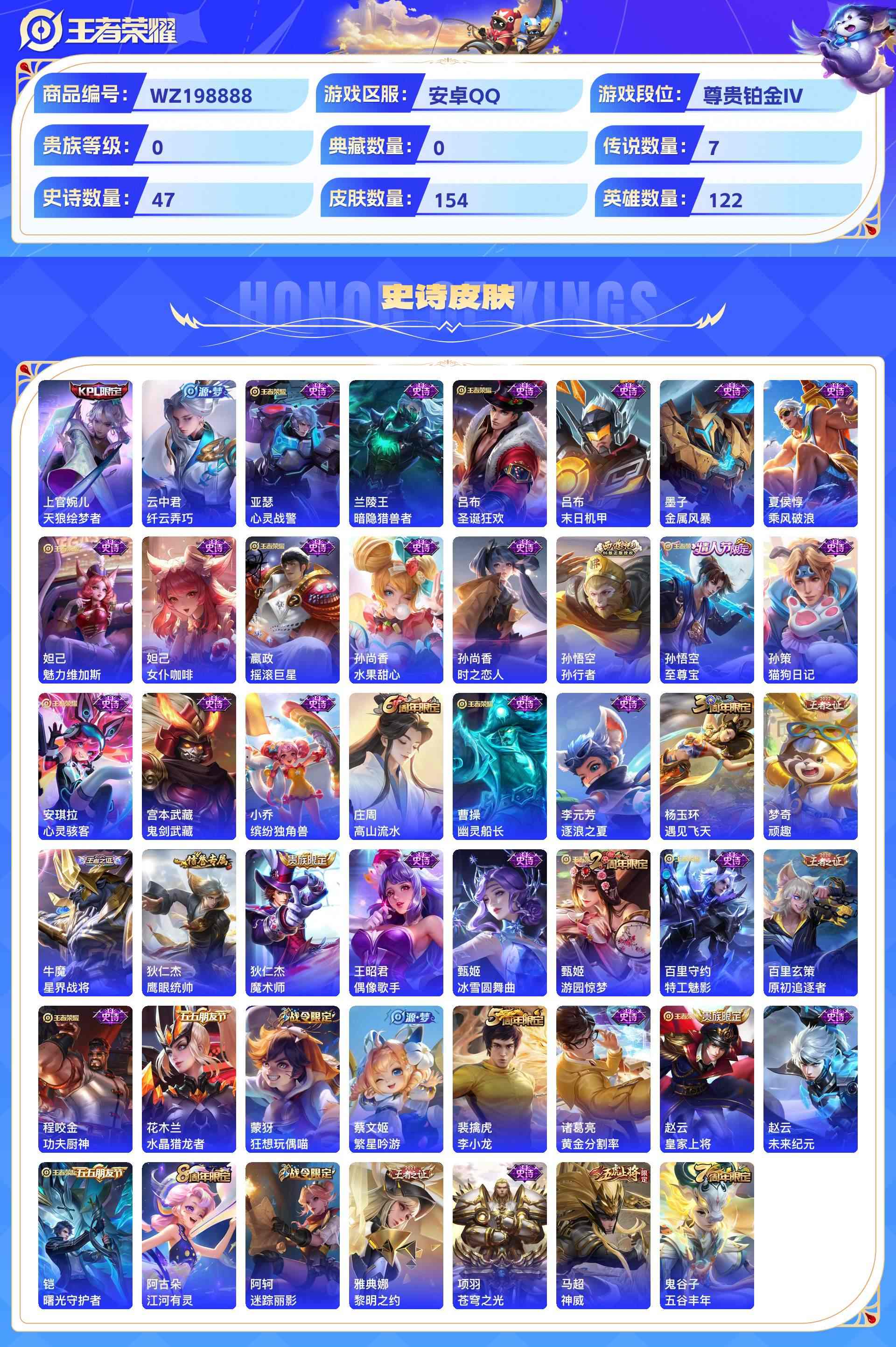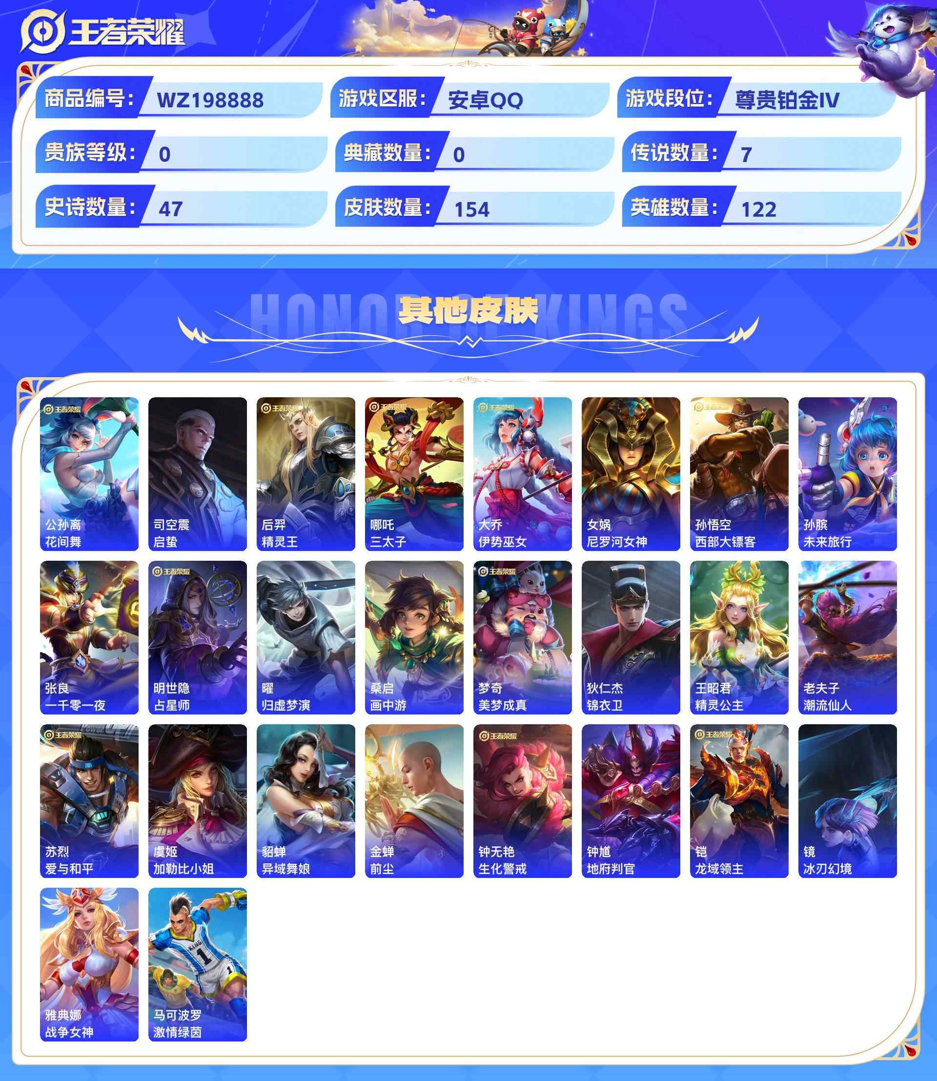 wz198888|精品小帅号可二次安卓qq 贵族7级 154皮 7传说(零号·赤焰地狱火云鹰飞将李 一念神魔鸣野蒿时雨天司) 47史诗(天狼绘梦者纤云弄巧心灵战警暗隐猎兽者圣诞狂欢末日机甲)1星传说1天幕