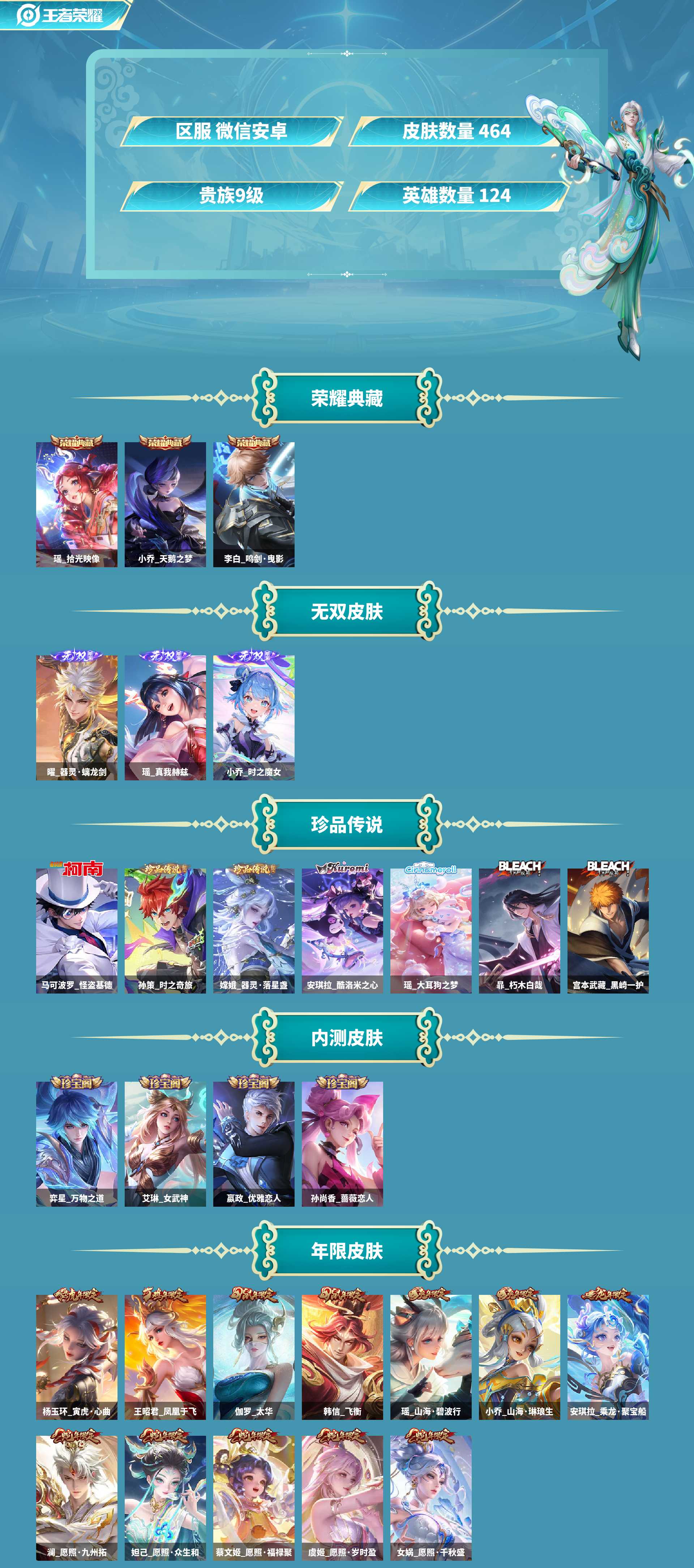 al638387 【特价安卓v区高质量小姐姐一手纯女号464皮金标瑶全皮瑶全皮小乔瑶拾光映像,李白鸣剑曳影,小乔天鹅之梦 无双皮肤:曜器灵螭龙剑,小乔时之魔女,瑶真我赫兹宫本武藏黑崎一护,暃朽木白哉,安琪拉酷洛米之心,瑶大耳狗之梦,嫦娥器灵落星盏,孙策时之奇旅,马可波罗怪盗基德传说皮肤:后裔神树通天,亚连落雪白狼,李信一念神魔,铠绛天战甲,西施续相思,花木兰冠军飞将,女娲愿照千秋盛,虞姬愿照岁时盈,澜愿照九州拓,王昭君乞巧织情,杨玉环星之鸣奏,云缨幻光神呛,妲己愿照众生和,蔡文姬愿照福禄聚,孙尚香末日机甲,夏洛特浮生妄,嬴政玄雷天君,马可波罗妄想实况,王昭君映山客,桑启鸣野蒿,蔡文姬花朝如约,孙膑小动物乐园,朵莉亚心动手记,镜炽阳神光,张良黄金白羊座,曜云鹰飞将,铠曙光守护者,周瑜音你心动,伽罗太华,虞姬启明星使,瑶时之祈愿,小乔山海琳琅生,貂蝉遇见胡旋,貂蝉猫影幻舞,小乔音你心动,大乔挚爱花嫁,西施游龙清影,貂蝉仲夏夜之梦】 皮肤数464 皮肤价值384408 无双皮肤数3 传说皮肤数38 珍品传说皮数7 史诗皮肤数145 英雄数127 营地id1898325334 贵族等级【文本】贵族9级 【贵族9级】 【是】 荣耀典藏3 无双皮肤3 珍品传说7 内测皮肤4 年限皮肤12 限定皮肤162 赛季限定32 史诗皮肤144 战令限定49 勇者皮肤184 其他皮肤81 荣耀典藏:瑶拾光映像,李白鸣剑曳影,小乔天鹅之梦; 无双皮肤:曜器灵螭龙剑,小乔时之魔女,瑶真我赫兹; 珍品传说:宫本武藏黑崎一护,暃朽木白哉,安琪拉酷洛米之心,瑶大耳狗之梦,嫦娥器灵落星盏,孙策时之奇旅,马可波罗怪盗基德; 内测皮肤:弈星万物之道,嬴政优雅恋人,孙尚香蔷薇恋人,艾琳女武神; 年限皮肤:杨玉环寅虎心曲,女娲愿照千秋盛,虞姬愿照岁时盈,澜愿照九州拓,妲己愿照众生和,蔡文姬愿照福禄聚,安琪拉乘龙聚宝船,伽罗太华,王昭君凤凰于飞,韩信飞衡,瑶山海碧波行,小乔山海琳琅生; 限定皮肤:百里玄策罗小黑战记,曹操逐霄之志,张良罗小黑战记,西施织梦人,鬼谷子克喵,弈星万物之道,朵莉亚幻珠鲛人,亚连落雪白狼,杨玉环寅虎心曲,宫本武藏黑崎一护,白起死霸装,暃朽木白哉,后羿石田雨龙,姬小满小满鸭,扁鹊灵蛊蚀心,安琪拉酷洛米之心,瑶大耳狗之梦,钟馗虚灵犬护,百里守约雪豹霜爪,狂铁龙之律动,苏烈春野闲踪,阿轲化蝶舞,西施续相思,后裔千劫归真,女娲愿照千秋盛,虞姬愿照岁时盈,澜愿照九州拓,嫦娥器灵落星盏,盘古冰霜神祇,杨玉环星之鸣奏,赵怀真器灵浮梦炉,妲己愿照众生和,蔡文姬愿照福禄聚,夏洛特浮生妄,孙策时之奇旅,马超访茗客,嬴政玄雷天君,孙膑茶境仙,太乙真人谧流熔炉,牛魔星界战将,马可波罗怪盗基德,百里守约百相守梦,老夫子百相守梦,马可波罗妄想实况,王昭君映山客,甄姬游园惊梦,桑启鸣野蒿,艾琳陌上桑,李白谪仙醉月,李元芳银河之约,东皇太一噬灭天穹,盘古敬我三分,亚连破空之剑,孙悟空神迹守卫,上官婉儿神器万象笔,兰陵王驯魔猎人,大司命东方月初,少司缘涂山红红,蒙犽顽岩魄,蔡文姬夏日便利店,嬴政优雅恋人,虞姬夏日便利店,姜子牙天穹之誓,朵莉亚心动手记,镜青焰无极,项羽苍威无极,女娲朔望之晖,安琪拉乘龙聚宝船,刘邦剑破天穹,鲁班七号蔬乡物语,李元芳蔬乡物语,沈梦溪龙舞盛年,伽罗琥珀纪元,高渐离燃音魔法,嫦娥漠中幻影,鬼谷子天穹祈灯,妲己灵卜魔法,蒙恬荣光圣徽,蒙犽百解令,西施至美乘鲤谣,司空震地狱燃心,阿古朵江河有灵,艾琳流音漫舞,貂蝉逐梦之音,张良古海寻踪,公孙离蜜橘之夏,伽罗太华,戈娅驭风魔法,虞姬启明