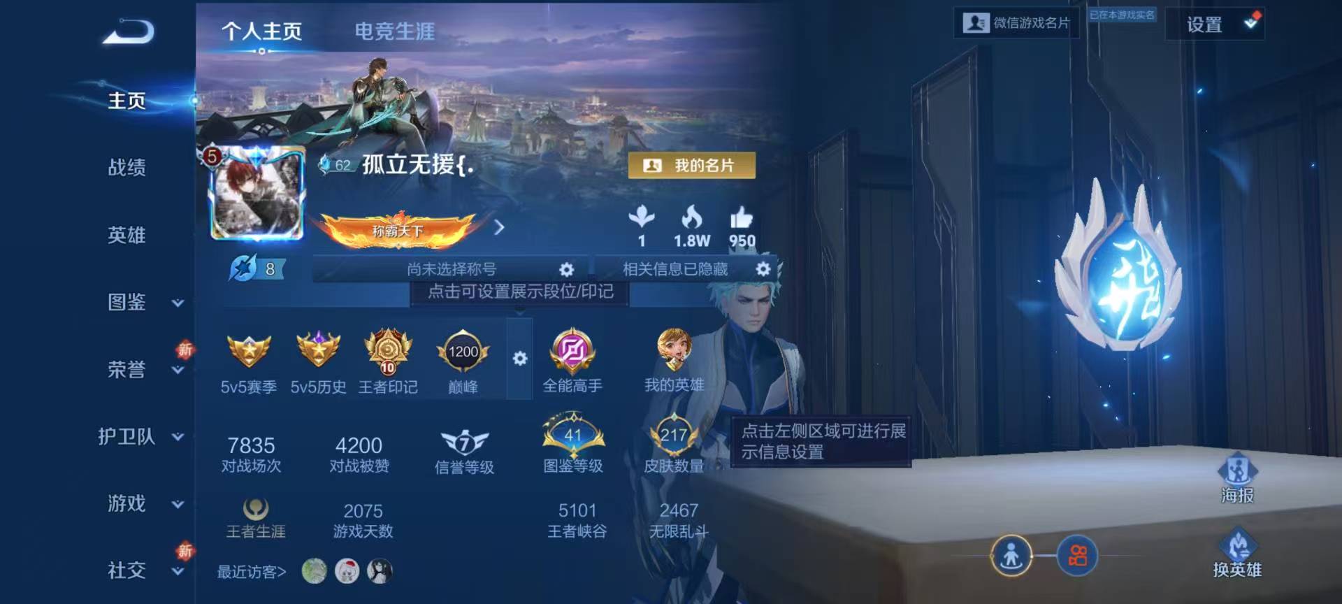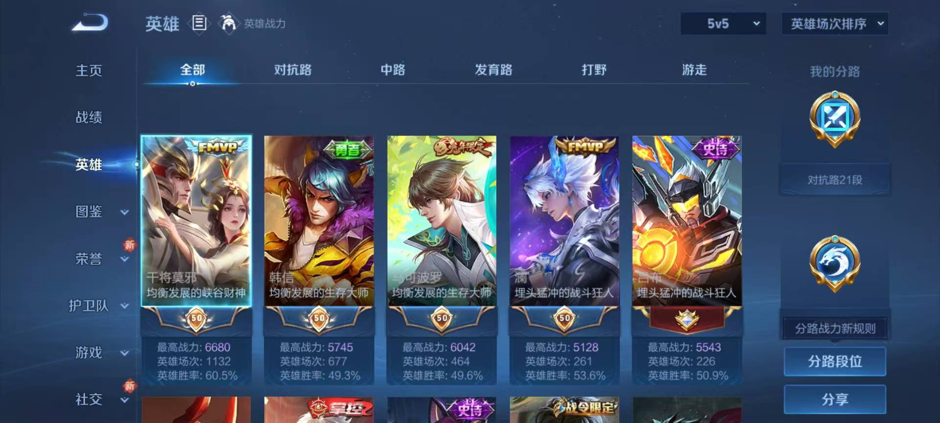 安卓微信/至尊星耀/217皮肤/126英雄/0典藏/0珍品无双/0无双/0珍品传说/4传说/52史诗/8稀有英雄【4 传说皮肤】逐花归海 澜无双飞将 马超久胜战神 干将莫邪音你闪耀 孙尚香【52 史诗皮肤】电玩小子 鲁班七号末日机甲 吕布紫霞仙子 露娜百解令 蒙犽高山流水 庄周妄想食味 姬小满德古拉伯爵 刘邦山海·玄木吟 马可波罗心灵战警 亚瑟五谷丰年