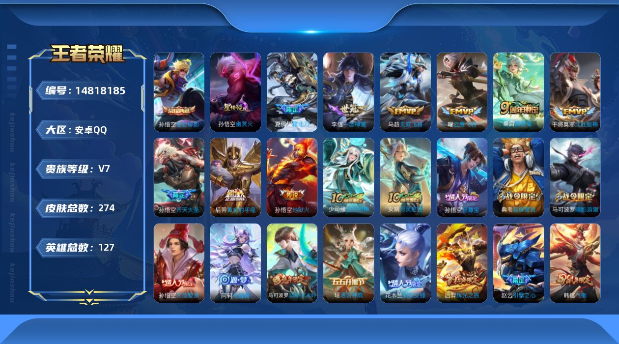 [14818185]【编号05039,可秒换绑】【店长推荐高质量猴子号!!!】幽冥火 安卓q-v7-最强王者段位-127英雄-274皮肤-1典藏皮肤-10传说-77史诗 【英雄全皮】:蒙恬全皮 【荣耀典藏】:孙悟空全息碎影 【传说皮肤】:后羿神树通天,桑启鸣野蒿,夏侯惇霜北刀,孙悟空齐天大圣,马超无双飞将,曜云鹰飞将,李信一念神魔,干将莫邪久胜战神,后羿黄金射手座,孙悟空地狱火 【限定皮肤】:白起狰,夏侯惇霜北刀,蔡文姬夏日便利店,大乔绒语心约,虞姬夏日便利店,姜子牙天穹之誓,杨戬破阵退雄兵,狄仁杰阴阳师,赵云皇家上将,赵云引擎之心,嬴政白昼王子,鲁班七号狮舞东方,高渐离玩趣恶龙,阿轲迷踪丽影,芈月重明,吕布猎兽之王,周瑜赤莲之焰,夏侯惇朔风刀,曹操烛龙,典韦穷奇,典韦蓝屏警告,马可波罗暗影游猎,马可波罗山海玄木吟,狄仁杰魔术师,狄仁杰万华元夜,项羽海滩派对,老夫子醍醐杖,程咬金演武夺筹,刘邦夺宝奇兵,韩信飞衡,兰陵王驯魔猎人,花木兰默契交锋,孙悟空美猴王,孙悟空至尊宝,孙悟空大圣娶亲,孙悟空齐天大圣,牛魔御旌,后羿辉光之辰,李元芳银河之约,李元芳云中旅人,钟馗神迹守卫,钟馗驱傩正仪,女娲朔望之晖,雅典娜单词大作战,雅典娜黎明之约,蔡文姬繁星吟游,太乙真人饕餮,鬼谷子原初探秘者,百里玄策原初追逐者,弈星混沌棋,沈梦溪星空之诺,明世隐疑决卦,裴擒虎天狼狩猎者,裴擒虎李小龙,裴擒虎擒涛扼浪,狂铁御狮,米莱狄御霄,云中君纤云弄巧,盾山御銮,猪八戒西部大镖客,上官婉儿梁祝,嫦娥拒霜思,嫦娥暖冬兔眠,西施玲珑珍味,蒙犽狂想玩偶喵,鲁班大师探海日志,桑启海盐诗旅,暃星界游侠,戈娅驭风魔法,张良古海寻踪,蒙犽百解令,蒙恬荣光圣徽,鬼谷子天穹祈灯,沈梦溪龙舞盛年,刘邦剑破天穹,关羽决胜骁骑,芈月浮光幕影,周瑜熔金海岸 【年限皮肤】:孙悟空美猴王,后羿辉光之辰,韩信飞衡,马可波罗山海玄木吟 【赛季限定】:白起狰,芈月重明,夏侯惇朔风刀,曹操烛龙,典韦穷奇,狄仁杰万华元夜,老夫子醍醐杖,程咬金演武夺筹,张良古海寻踪,牛魔御旌,李元芳云中旅人,钟馗驱傩正仪,雅典娜黎明之约,太乙真人饕餮,鬼谷子原初探秘者,百里玄策原初追逐者,弈星混沌棋,明世隐疑决卦,裴擒虎擒涛扼浪,狂铁御狮,米莱狄御霄,盾山御銮,鲁班大师探海日志,桑启海盐诗旅,鬼谷子天穹祈灯,蒙恬荣光圣徽,刘邦剑破天穹,姜子牙天穹之誓 【战令限定】:蔡文