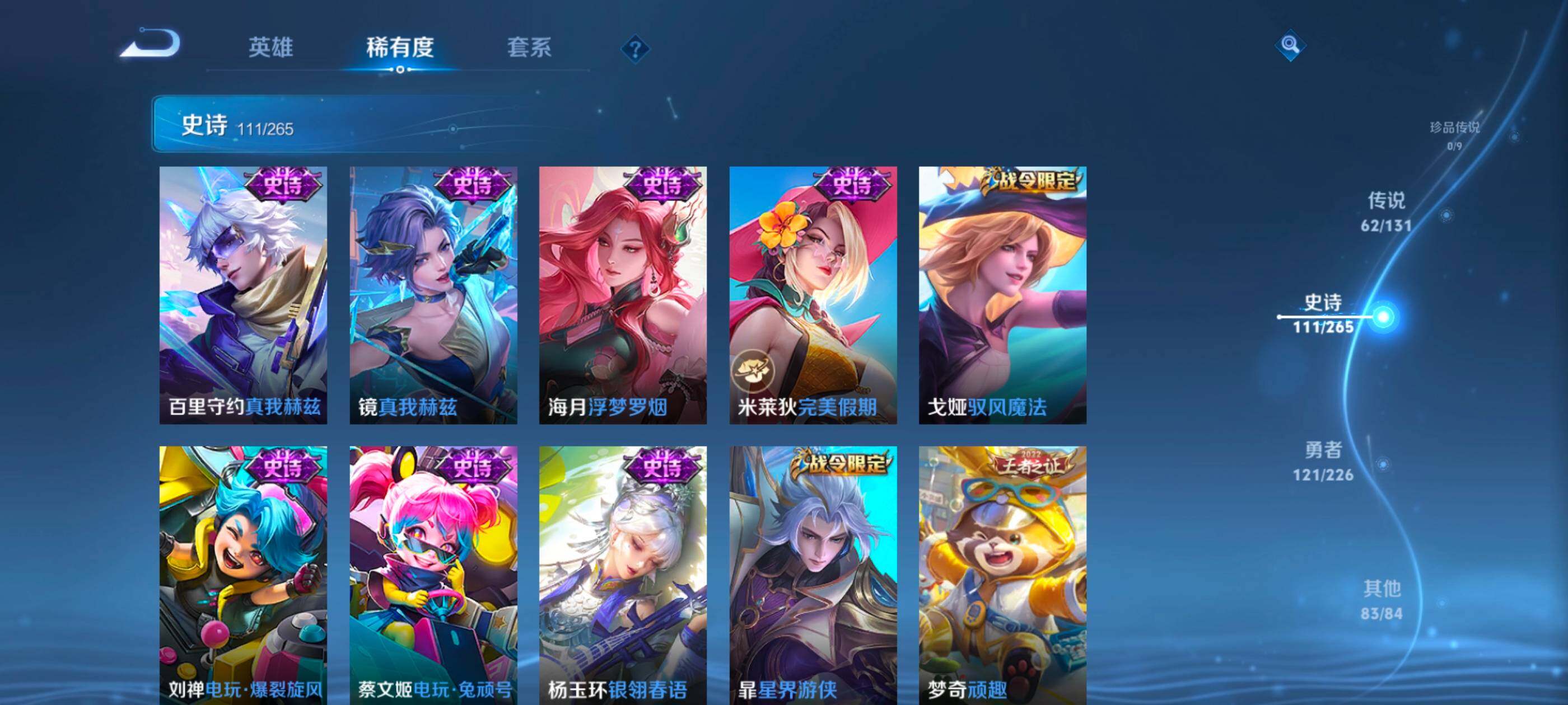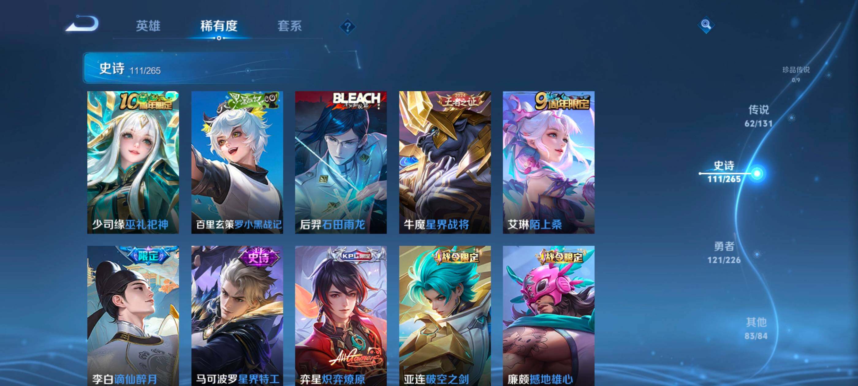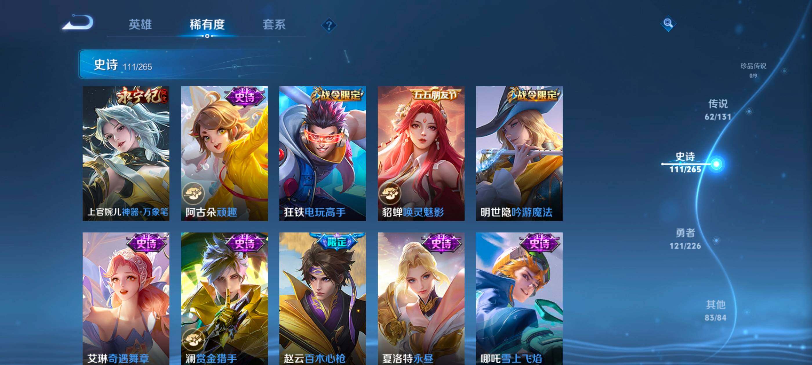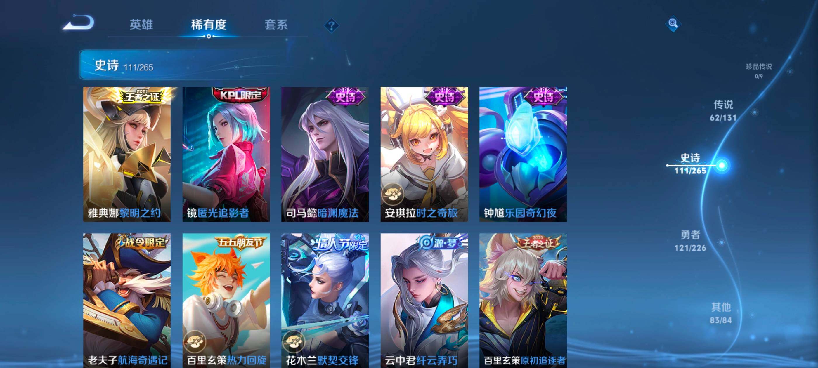 安卓wx-v10-最强王者段位-127英雄-390皮肤-10典藏-0珍品无双-3无双-0珍品传说-62传说-111史诗 【英雄全皮】:艾琳全皮,李信全皮,阿古朵全皮,空空儿全皮 【荣耀典藏】:武则天英雄,孙悟空全息碎影,武则天倪克斯神谕,小乔天鹅之梦,李白鸣剑曳影,花木兰九霄神辉,关羽赤影疾锋,铠银白咏叹调,貂蝉幻阙歌,韩信弑呛猎影,虞姬神鉴启示录 【无双皮肤】:武则天神器明辉仪,瑶真我赫兹,公孙离离恨烟 【传说皮肤】:后羿神树通天,桑启鸣野蒿,庄周牧神诗旅,夏侯惇霜北刀,亚连落雪白狼,典韦战鼓燎原,赵云乘龙铭钟鼎,澜逐花归海,艾琳觅芳踪,露娜霜月吟,孙膑小动物乐团,宫本武藏惊梅引,上官婉儿妄想奇谈,马可波罗妄想实况,东皇太一灼幽烈阳,诸葛亮鹤羽星尊,澜电玩雷克斯,公孙离记忆之芯,干将莫邪画中仙,花木兰燃星之曲,伽罗炽翼辉光,孙悟空齐天大圣,李信山海炽霜斩,吕布怒海麟威,李白诗剑行,百里守约碎云,孙尚香音你闪耀,马超无双飞将,孙策挚爱之约,露娜启示之音,蔡文姬花朝如约,孙策末日机甲,赵云淬星耀世,王昭君乞巧织情,西施游龙清影,曜李 ,周瑜音你心动,小乔音你心动,李元芳飞鸢探春,兰陵王默契交锋,铠绛天战甲,镜炽阳神光,虞姬启明星使,孙悟空零号赤焰,曜云鹰飞将,李信一念神魔,刘备时之恋人,伽罗太华,貂蝉猫影幻舞,张良黄金白羊座,干将莫邪久胜战神,虞姬云霓雀翎,达摩黄金狮子座,花木兰冠军飞将,梦奇胖达荣荣,后羿黄金射手座,貂蝉仲夏夜之梦,孙尚香末日机甲,宫本武藏地狱之眼,孙悟空地狱火,吕布天魔缭乱,狄仁杰超时空战士 【限定皮肤】:公孙离离恨烟,夏侯惇霜北刀,暃埋骨钱,蔡文姬夏日便利店,虞姬夏日便利店,姜子牙天穹之誓,李白谪仙醉月,狄仁杰阴阳师,赵云皇家上将,赵云百木心呛,墨子神迹守卫,妲己时之彼端,白起夜都怪侠,吕布天魔缭乱,吕布猎兽之王,夏侯惇朔风刀,甄姬游园惊梦,马可波罗暗影游猎,马可波罗妄想实况,狄仁杰魔术师,狄仁杰万华元夜,达摩沙漠行僧,项羽海滩派对,老夫子醍醐杖,老夫子航海奇遇记,程咬金演武夺筹,露娜启示之音,韩信飞衡,王昭君午后时光,兰陵王默契交锋,兰陵王金庭之子,花木兰默契交锋,花木兰燃星之曲,孙悟空至尊宝,孙悟空零号赤焰,孙悟空齐天大圣,牛魔御旌,李元芳银河之约,李元芳云中旅人,虞姬启明星使,钟馗驱傩正仪,女娲朔望之晖,干将莫邪冰霜恋舞曲,干将莫邪画中仙,雅典娜黎明之约,鬼谷子原初探秘者,诸葛亮鹤羽星尊,苏烈千军破阵,百里玄策原初追逐者,弈星混沌棋,梦奇顽趣,沈梦溪星空之诺,明世隐疑决卦,明世隐吟游魔法,裴擒虎天狼狩猎者,狂铁电玩高手,米莱狄御霄,云中君纤云弄巧,李信山海炽霜斩,伽罗太华,伽罗炽翼辉光,孙策挚爱之约,上官婉儿梁祝,上官婉儿天狼绘梦者,上官婉儿神器万象笔,上官婉儿妄想奇谈,嫦娥暖冬兔眠,曜李 ,西施玲珑珍味,鲁班大师探海日志,镜匿光追影者,桑启海盐诗旅,暃星界游侠,戈娅驭风魔法,艾琳女武神,艾琳流音漫舞,司空震地狱燃心,阿古朵江河有灵,张良古海寻踪,艾琳觅芳踪,蒙恬荣光圣徽,高渐离燃音魔法,妲己灵卜魔法,鬼谷子天穹祈灯,赵云乘龙铭钟鼎,亚连落雪白狼,沈梦溪龙舞盛年,刘备异域游侠,周瑜熔金海岸 【年限皮肤】:伽罗太华,韩信飞衡,李信山海炽霜斩,伽罗炽翼辉光,赵云乘龙铭钟鼎 【赛季限定】:夏侯惇朔风刀,狄仁杰万华元夜,达摩沙漠行僧,老夫子醍醐杖,程咬金演武夺筹,兰陵王金庭之子,张良古海寻踪,牛魔御旌,李元芳云中旅人,钟馗驱傩正仪,雅典娜黎明之约,鬼谷子原初探秘者,苏烈千军破阵,百里玄策原初追逐者,弈星混沌棋,梦奇顽趣,明世隐疑决卦,米莱狄御霄,鲁班大师探海日志,桑启海盐诗旅,鬼谷子天穹祈灯,蒙恬荣光圣徽,姜子牙天穹之誓 【战令限定】:墨子神迹守卫,蔡文姬夏日便利店,虞姬夏日便利店,白起夜都怪侠,吕布猎兽之王,马可波罗暗影游猎,老夫子航海奇遇记,王昭君午后时光,艾琳流音漫舞,李元芳银河之约,女娲朔望之晖,沈梦溪星空之诺,明世隐吟游魔法,狂铁电玩高手,嫦娥暖冬兔眠,西施玲珑珍味,司空震地狱燃心,暃星界游侠,戈娅驭风魔法,高渐离燃音魔法,妲己灵卜魔法 【史诗皮肤】:鲁班七号电玩小子,项羽苍穹之光,露娜紫霞仙子,阿轲暗夜猫娘,赵云皇家上将,赵云未来纪元,貂蝉圣诞恋歌,甄姬冰雪圆舞曲,王昭君偶像歌手,狄仁杰魔术师,廉颇地狱岩魂,宫本武藏鬼剑武藏,孙尚香水果甜心,嬴政暗夜贵公子,嬴政摇滚巨星,妲己魅力维加斯,妲己女仆咖啡,墨子龙骑士,墨子金属风暴,吕布圣诞狂欢,刘禅绅士熊喵,曹操幽灵船长,李白千年之狐,吕布末日机甲,张飞乱世虎臣,孙悟空至尊宝,花木兰水晶猎龙者,刘邦德古拉伯爵,夏侯惇乘风破浪,小乔缤纷独角兽,兰陵王暗隐猎兽者,诸葛亮黄金分割率,甄姬游园惊梦,亚瑟心灵战警,雅典娜冰冠公主,安琪拉心灵骇客,百里守约特工魅影,铠曙光守护者,蔡文姬舞动绿茵,刘禅天才门将,李元芳逐浪之夏,程咬金功夫厨神,白起星夜王子,阿轲节奏热浪,孙策猫狗日记,干将莫邪冰霜恋舞曲,伽罗箭羽风息,裴擒虎天狼狩猎者,狄仁杰鹰眼统帅,公孙离无限星赏官,上官婉儿梁祝,李元芳银河之约,娜可露露晚萤,韩信飞衡,妲己时之彼端,大乔白蛇,橘右京修罗,瑶遇见神鹿,孙尚香时之恋人,上官婉儿天狼绘梦者,马可波罗暗影游猎,百里玄策原初追逐者,云中君纤云弄巧,花木兰默契交锋,百里玄策热力回旋,老