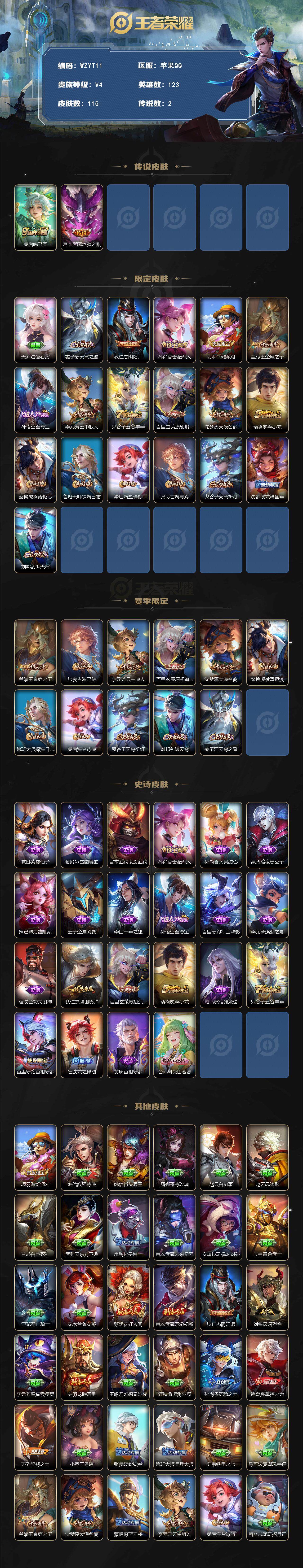【wzyt11】贵族4/皮肤115/传说2/史诗22/英雄123/桑启-鸣野蒿/宫本武藏-地狱之眼/大乔-绒语心约/姜子牙-天穹之誓/狄仁杰-阴阳师/孙尚香-蔷薇恋人/项羽-海滩派对/兰陵王-金庭之子/孙悟空-至尊宝/李元芳-云中旅人/鬼谷子-五谷丰年/百里玄策-原初追逐者/沈梦溪-大漠名商/裴擒虎-李小龙/裴擒虎-擒涛扼浪/鲁班大师-探海日志/桑启-海盐诗旅/张良-古海寻踪/鬼谷子-天穹祈灯