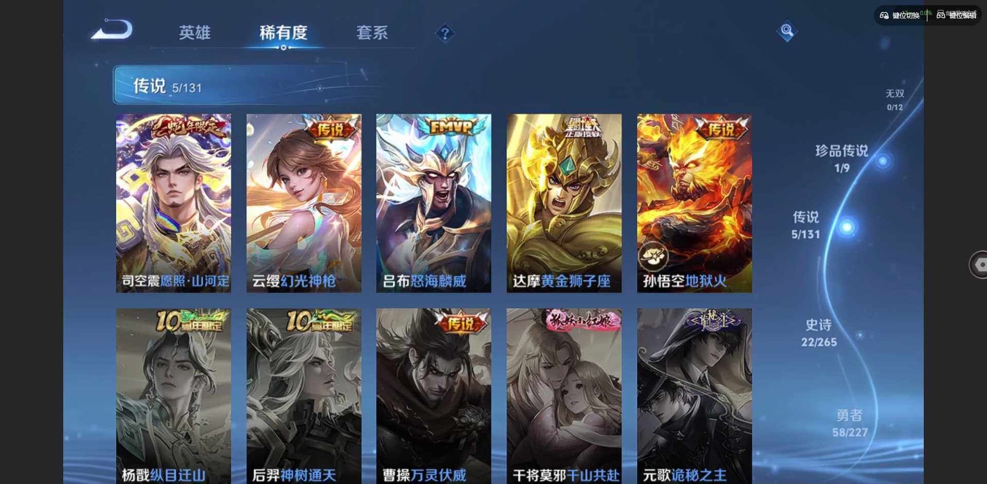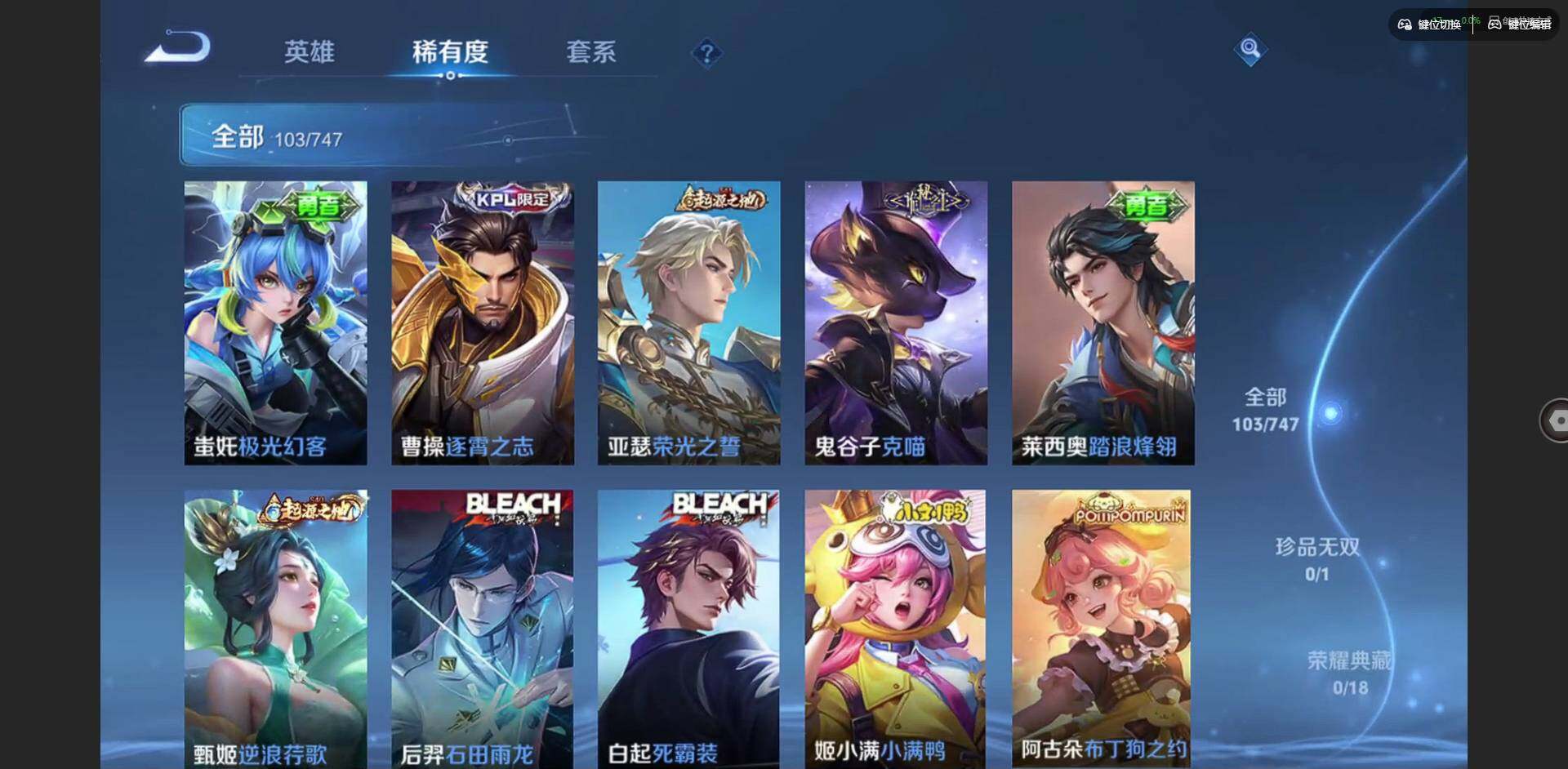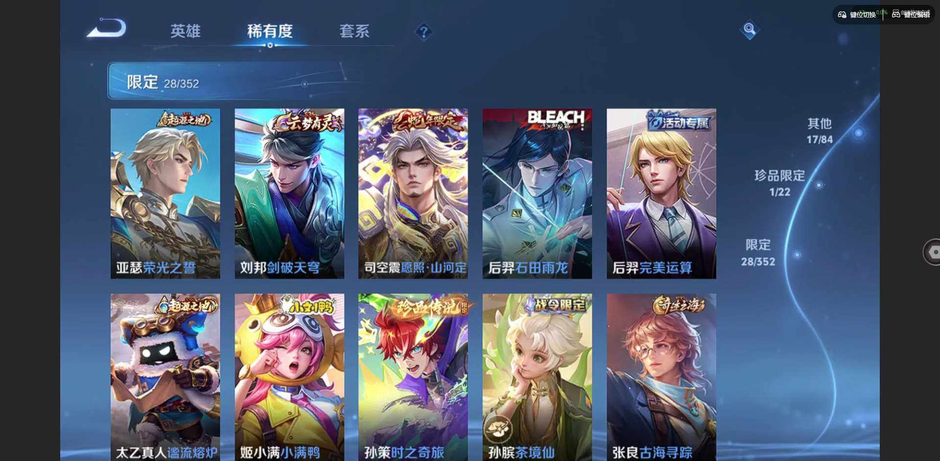 104英雄-103皮肤-实名: 可修改 贵族等级: v6 英雄数: 104 皮肤数: 103 珍品传说: 时之奇旅-孙策 传说皮: 黄金狮子座地狱火幻光神呛 限定皮: 怒海麟威愿照·山河定