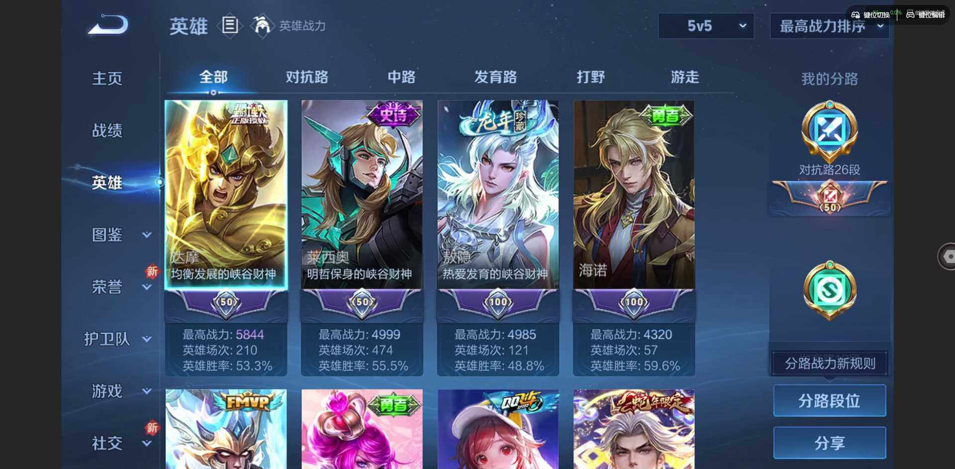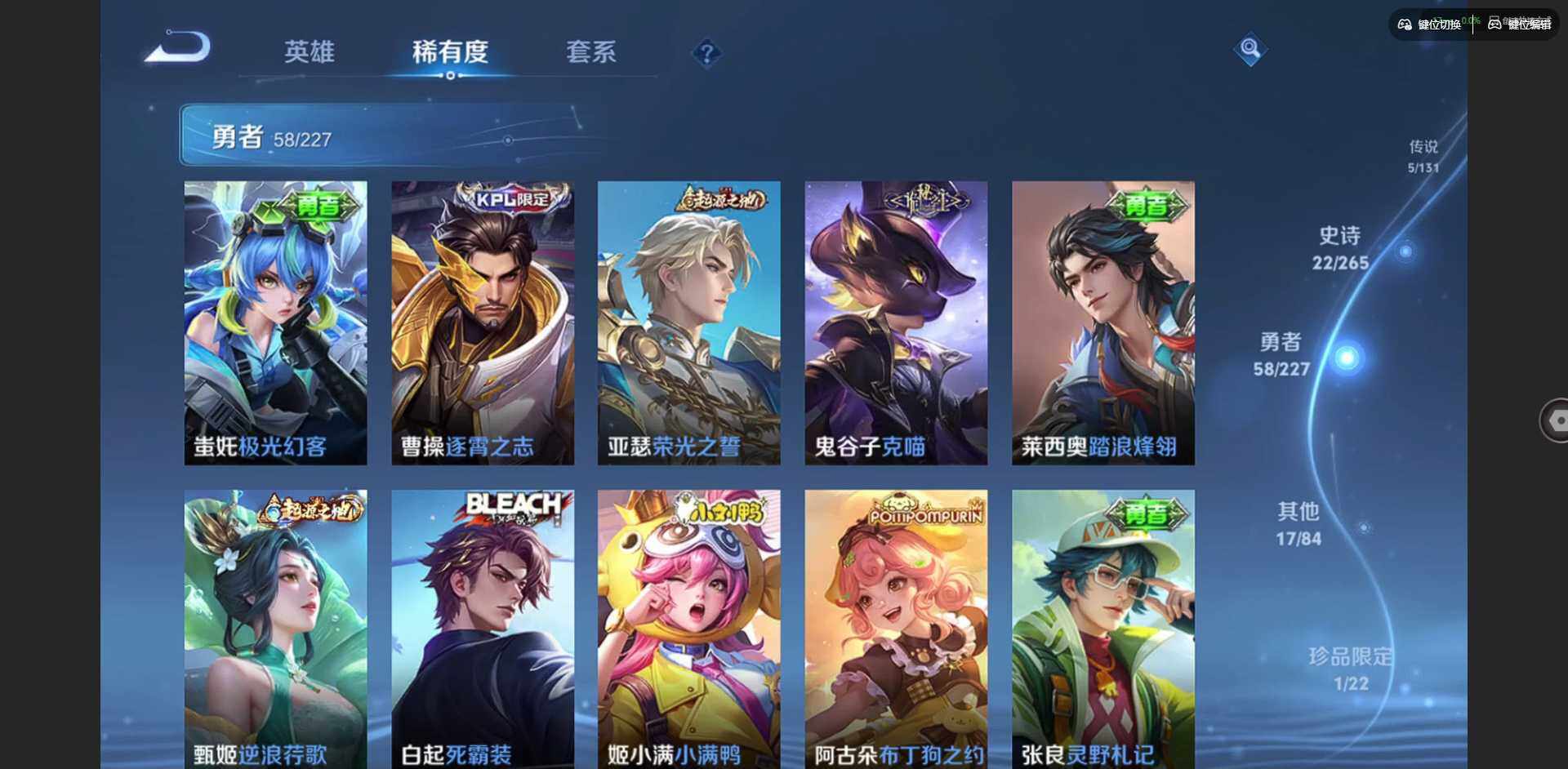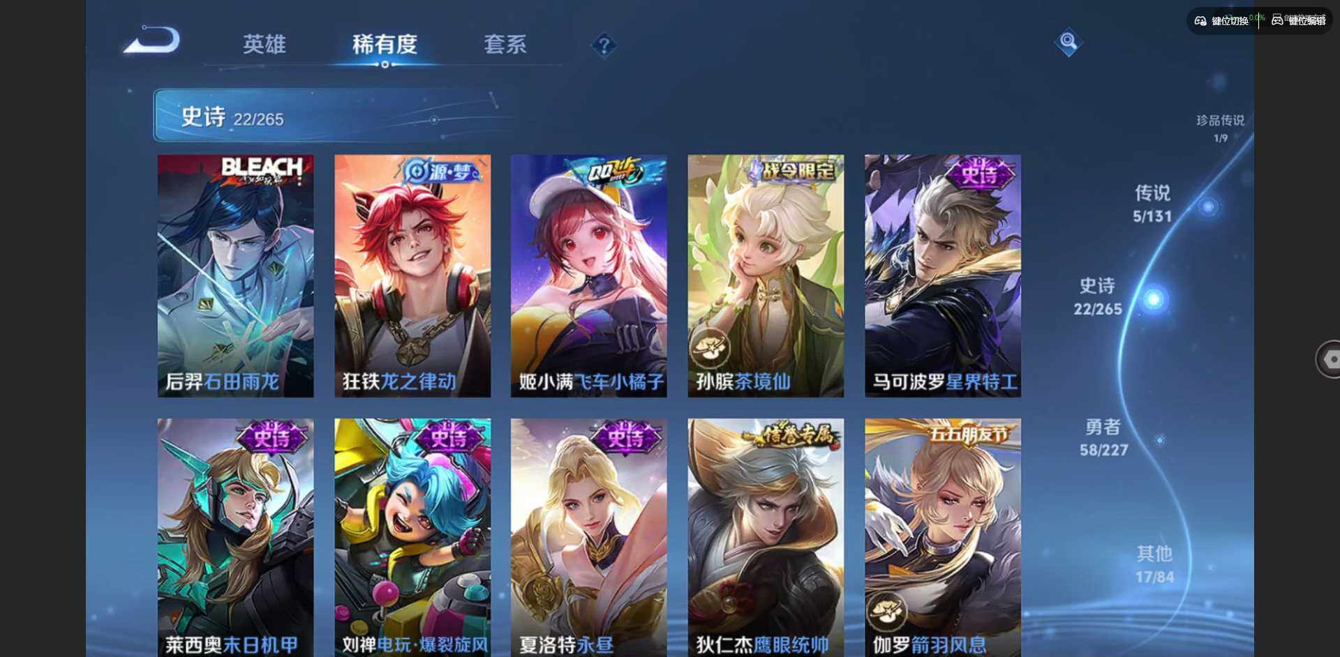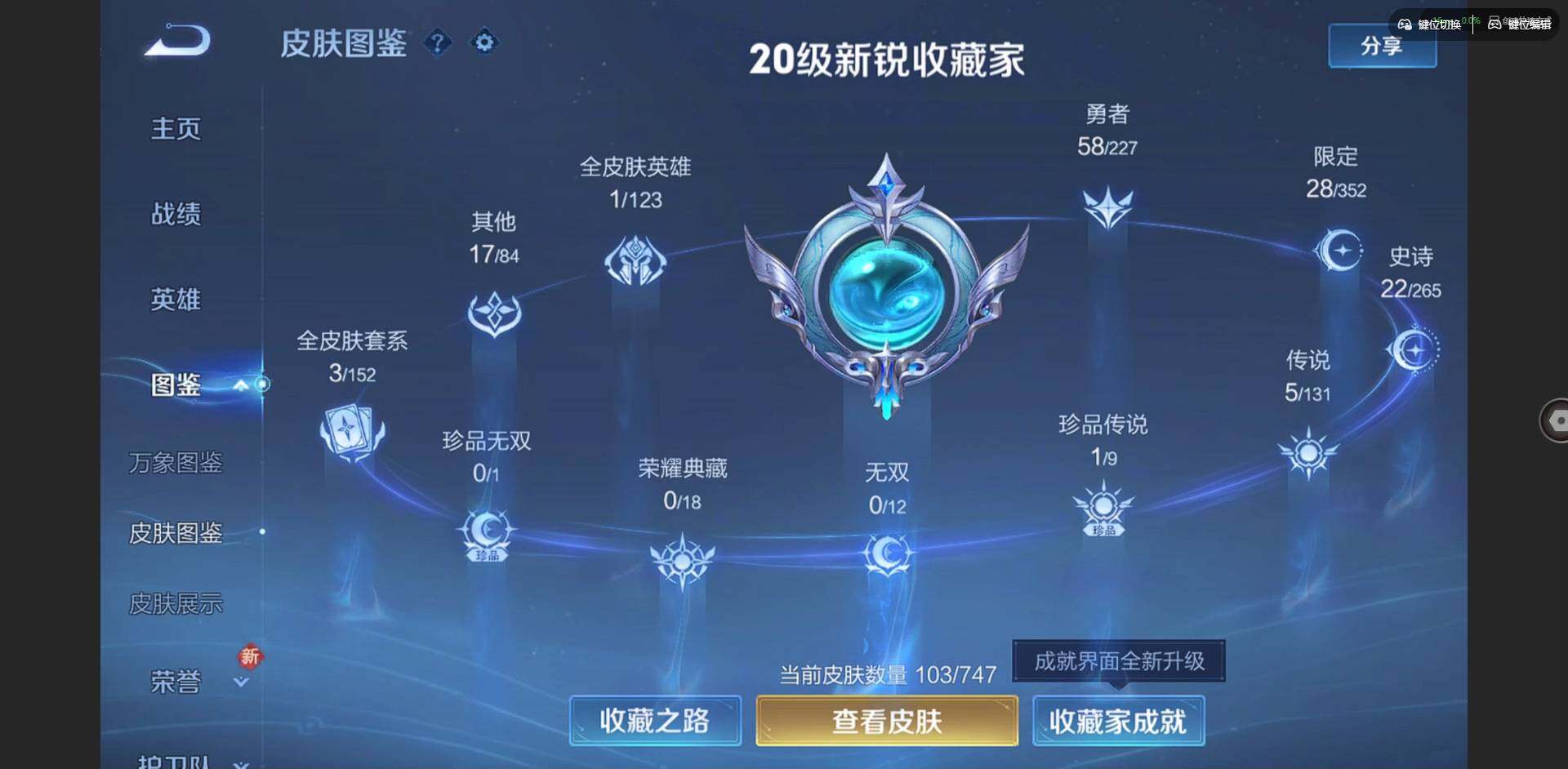104英雄-103皮肤-实名: 可修改 贵族等级: v6 英雄数: 104 皮肤数: 103 珍品传说: 时之奇旅-孙策 传说皮: 黄金狮子座地狱火幻光神呛 限定皮: 怒海麟威愿照·山河定