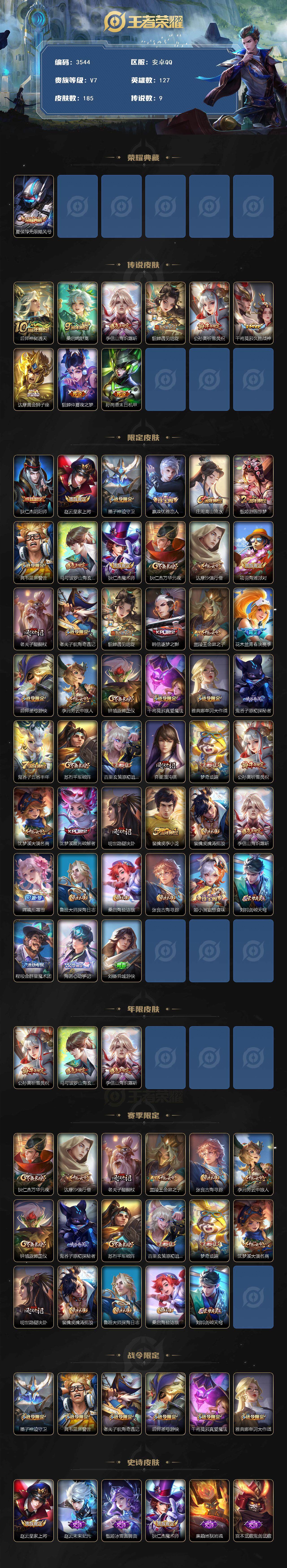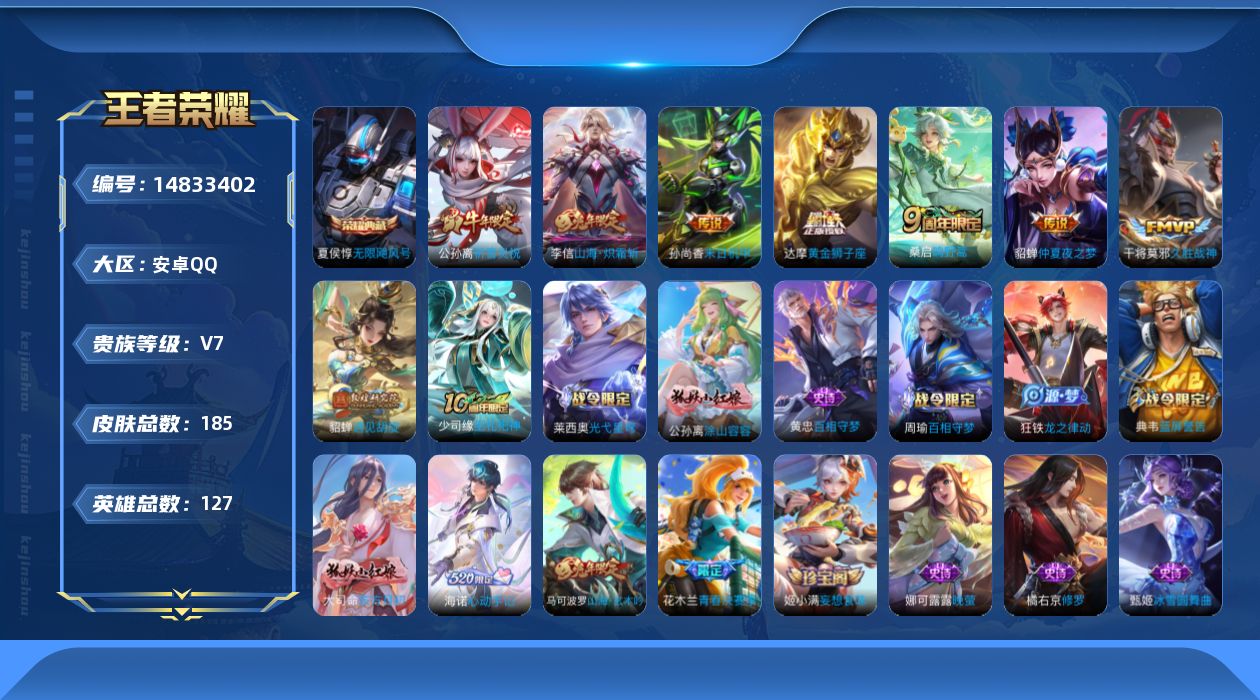 [14833402]安卓q-v7-最强王者段位-127英雄-185皮肤-1典藏皮肤-9传说-55史诗 【荣耀典藏】:夏侯惇无限飓风号 【传说皮肤】:后羿神树通天,桑启鸣野蒿,李信山海炽霜斩,貂蝉遇见胡旋,公孙离祈雪灵祝,干将莫邪久胜战神,达摩黄金狮子座,貂蝉仲夏夜之梦,孙尚香末日机甲 【限定皮肤】:狄仁杰阴阳师,赵云皇家上将,墨子神迹守卫,嬴政优雅恋人,庄周高山流水,甄姬游园惊梦,典韦蓝屏警告,马可波罗山海玄木吟,狄仁杰魔术师,狄仁杰万华元夜,达摩沙漠行僧,项羽海滩派对,老夫子醍醐杖,老夫子航海奇遇记,貂蝉遇见胡旋,韩信逐梦之影,兰陵王金庭之子,花木兰青春决赛季,后羿圣弓游侠,李元芳云中旅人,钟馗驱傩正仪,干将莫邪真爱魔法,雅典娜单词大作战,鬼谷子原初探秘者,鬼谷子五谷丰年,苏烈千军破阵,百里玄策原初追逐者,弈星混沌棋,梦奇顽趣,公孙离祈雪灵祝,沈梦溪大漠名商,沈梦溪匿光破解者,明世隐疑决卦,裴擒虎李小龙,裴擒虎擒涛扼浪,李信山海炽霜斩,嫦娥拒霜思,鲁班大师探海日志,桑启海盐诗旅,张良古海寻踪,姬小满妄想食味,刘邦剑破天穹,程咬金群星魔术团,海诺心动手记,刘备异域游侠 【年限皮肤】:公孙离祈雪灵祝,马可波罗山海玄木吟,李信山海炽霜斩 【赛季限定】:狄仁杰万华元夜,达摩沙漠行僧,老夫子醍醐杖,兰陵王金庭之子,张良古海寻踪,李元芳云中旅人,钟馗驱傩正仪,鬼谷子原初探秘者,苏烈千军破阵,百里玄策原初追逐者,弈星混沌棋,梦奇顽趣,沈梦溪大漠名商,明世隐疑决卦,裴擒虎擒涛扼浪,鲁班大师探海日志,桑启海盐诗旅,刘邦剑破天穹 【战令限定】:墨子神迹守卫,典韦蓝屏警告,老夫子航海奇遇记,后羿圣弓游侠,干将莫邪真爱魔法,雅典娜单词大作战 【史诗皮肤】:赵云皇家上将,赵云未来纪元,甄姬冰雪圆舞曲,狄仁杰魔术师,廉颇地狱岩魂,宫本武藏鬼剑武藏,孙尚香水果甜心,嬴政优雅恋人,墨子金属风暴,吕布圣诞狂欢,李白千年之狐,吕布末日机甲,韩信白龙吟,花木兰水晶猎龙者,刘邦德古拉伯爵,韩信逐梦之影,夏侯惇乘风破浪,小乔缤纷独角兽,兰陵王暗隐猎兽者,诸葛亮黄金分割率,甄姬游园惊梦,花木兰青春决赛季,蔡文姬舞动绿茵,刘禅天才门将,李元芳逐浪之夏,程咬金功夫厨神,典韦蓝屏警告,狄仁杰鹰眼统帅,公孙离无限星赏官,娜可露露晚萤,橘右京修罗,百里玄策原初追逐者,裴擒虎李小龙,老夫子航海奇遇记,干将莫邪真爱魔法,安琪拉时之奇旅,庄