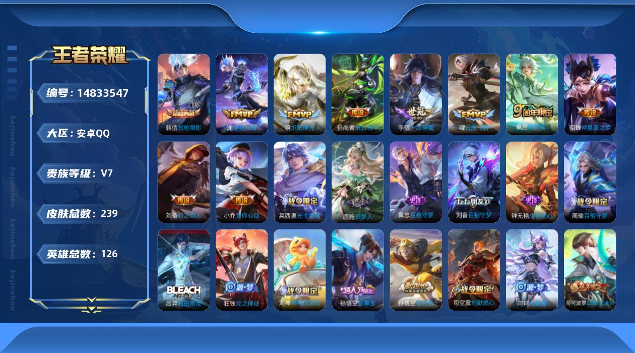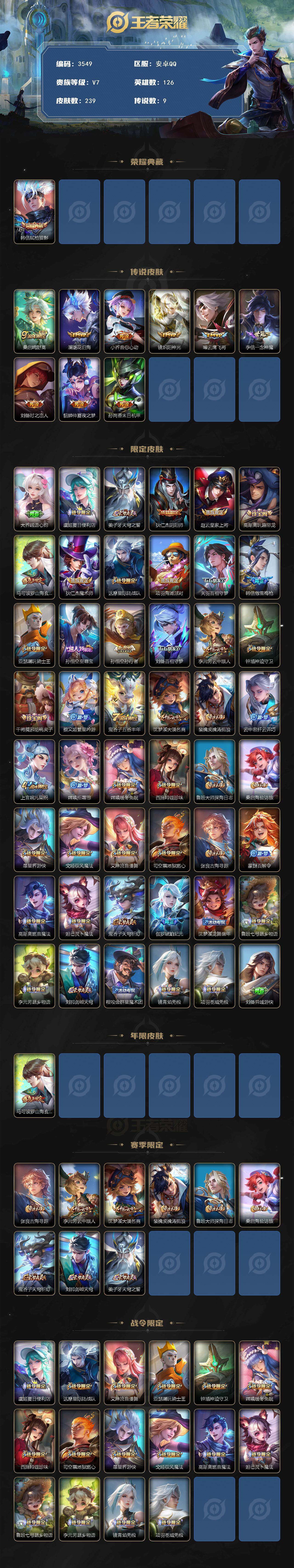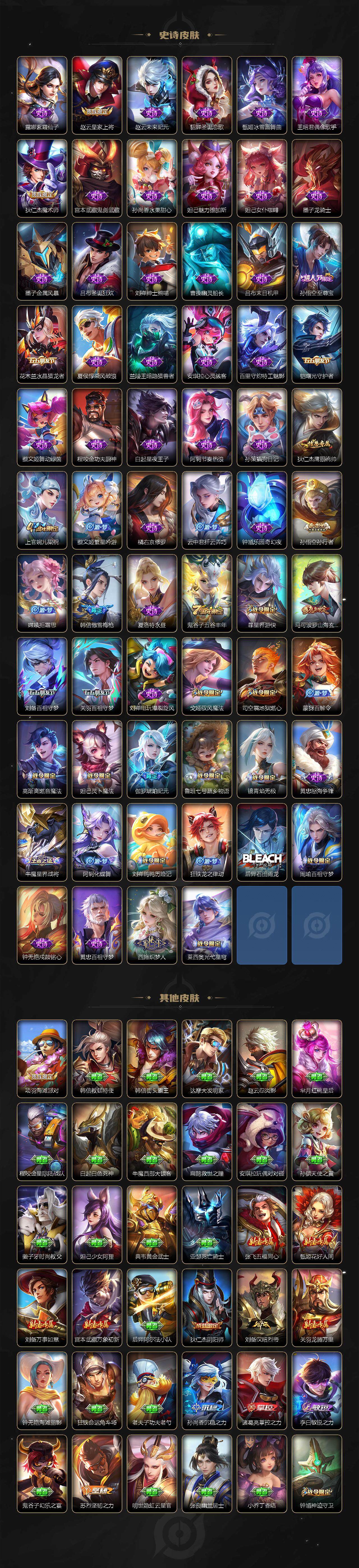 [14833547]安卓q-v7-最强王者段位-126英雄-239皮肤-1典藏皮肤-9传说-63史诗 【英雄全皮】:孙权全皮,空空儿全皮 【荣耀典藏】:韩信弑呛猎影 【传说皮肤】:桑启鸣野蒿,澜逐花归海,小乔音你心动,镜炽阳神光,曜云鹰飞将,李信一念神魔,刘备时之恋人,貂蝉仲夏夜之梦,孙尚香末日机甲 【限定皮肤】:大乔绒语心约,虞姬夏日便利店,姜子牙天穹之誓,狄仁杰阴阳师,赵云皇家上将,高渐离玩趣恶龙,马可波罗山海玄木吟,狄仁杰魔术师,达摩星际陆战队,项羽海滩派对,关羽百相守梦,韩信傲雪梅呛,亚瑟潮玩骑士王,孙悟空至尊宝,孙悟空孙行者,刘备百相守梦,李元芳云中旅人,钟馗神迹守卫,干将莫邪胡桃夹子,蔡文姬繁星吟游,鬼谷子五谷丰年,沈梦溪大漠名商,裴擒虎擒涛扼浪,云中君纤云弄巧,上官婉儿梁祝,嫦娥拒霜思,嫦娥暖冬兔眠,西施玲珑珍味,鲁班大师探海日志,桑启海盐诗旅,暃星界游侠,戈娅驭风魔法,艾琳流音漫舞,司空震地狱燃心,张良古海寻踪,蒙犽百解令,高渐离燃音魔法,妲己灵卜魔法,鬼谷子天穹祈灯,伽罗琥珀纪元,沈梦溪龙舞盛年,鲁班七号蔬乡物语,李元芳蔬乡物语,刘邦剑破天穹,程咬金群星魔术团,镜青焰无极,项羽苍威无极,刘备异域游侠 【年限皮肤】:马可波罗山海玄木吟 【赛季限定】:张良古海寻踪,李元芳云中旅人,沈梦溪大漠名商,裴擒虎擒涛扼浪,鲁班大师探海日志,桑启海盐诗旅,鬼谷子天穹祈灯,刘邦剑破天穹,姜子牙天穹之誓 【战令限定】:虞姬夏日便利店,达摩星际陆战队,艾琳流音漫舞,亚瑟潮玩骑士王,钟馗神迹守卫,嫦娥暖冬兔眠,西施玲珑珍味,司空震地狱燃心,暃星界游侠,戈娅驭风魔法,高渐离燃音魔法,妲己灵卜魔法,鲁班七号蔬乡物语,李元芳蔬乡物语,镜青焰无极,项羽苍威无极 【史诗皮肤】:露娜紫霞仙子,赵云皇家上将,赵云未来纪元,貂蝉圣诞恋歌,甄姬冰雪圆舞曲,王昭君偶像歌手,狄仁杰魔术师,宫本武藏鬼剑武藏,孙尚香水果甜心,妲己魅力维加斯,妲己女仆咖啡,墨子龙骑士,墨子金属风暴,吕布圣诞狂欢,刘禅绅士熊喵,曹操幽灵船长,吕布末日机甲,孙悟空至尊宝,花木兰水晶猎龙者,夏侯惇乘风破浪,兰陵王暗隐猎兽者,安琪拉心灵骇客,百里守约特工魅影,铠曙光守护者,蔡文姬舞动绿茵,程咬金功夫厨神,白起星夜王子,阿轲节奏热浪,孙策猫狗日记,狄仁杰鹰眼统帅,上官婉儿梁祝,蔡文姬繁星吟游,橘右京修罗,云中君纤云弄巧,钟馗乐园奇幻夜,孙悟空