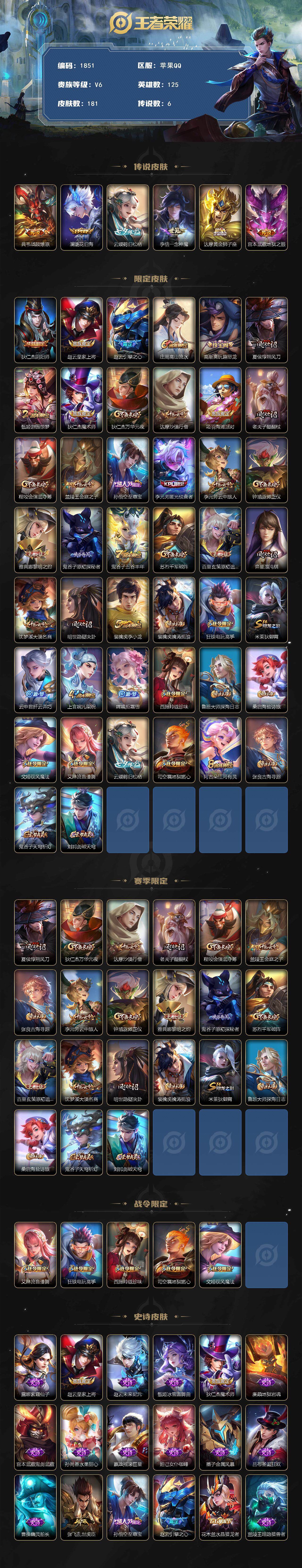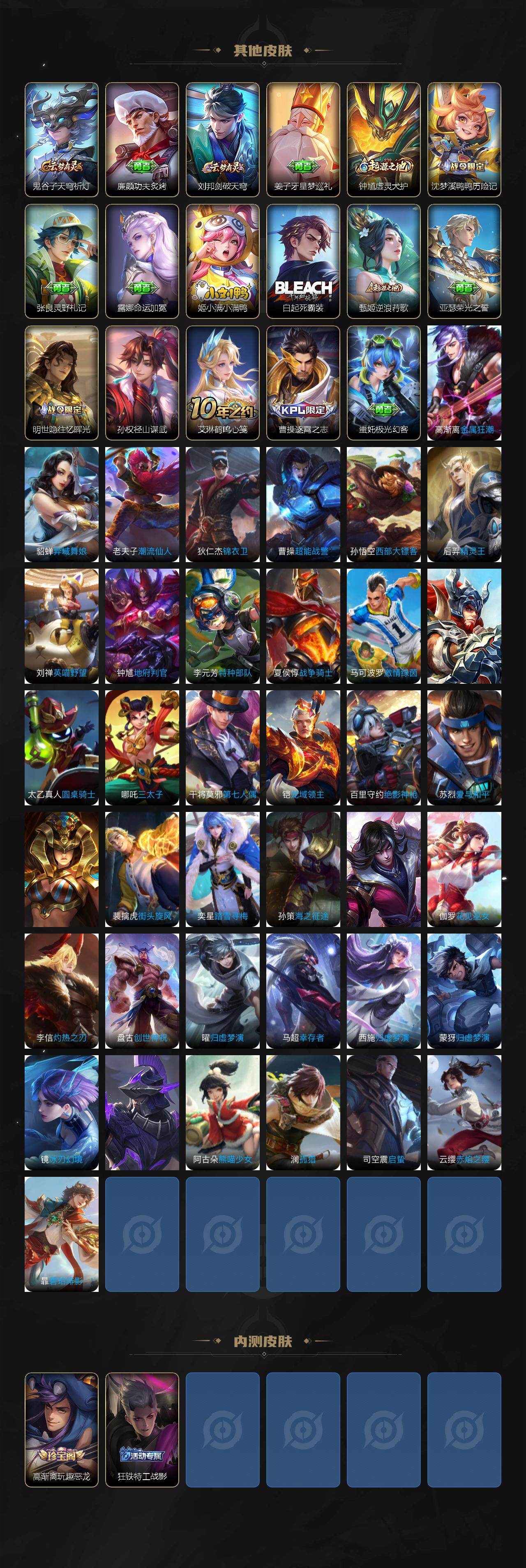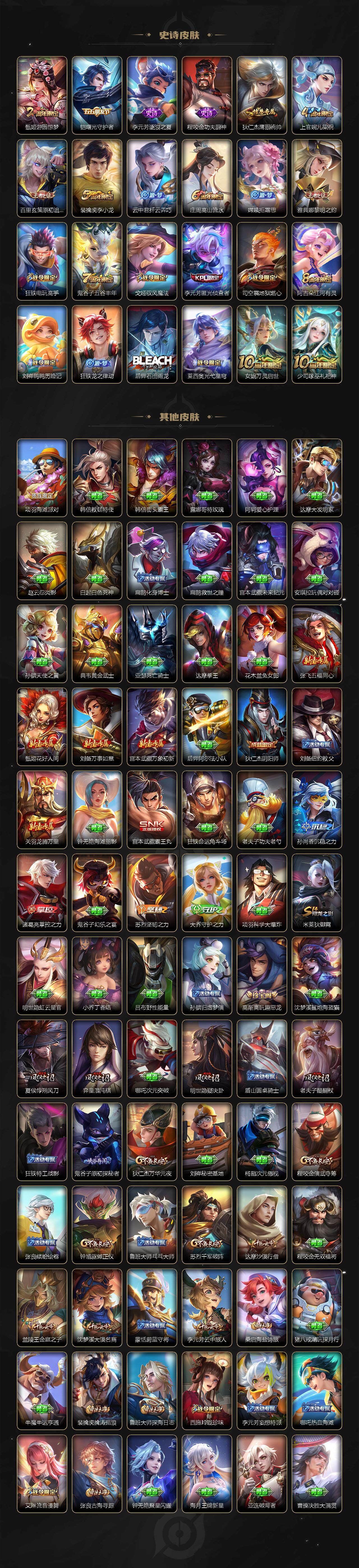 125英雄-181皮肤-贵族6/皮肤181/传说6/史诗42/英雄125/孙权全皮/战鼓燎原 典韦/逐花归海 澜/鹤归松栖 云缨/一念神魔 李信/黄金狮子座 达摩/地狱之眼 宫本武藏/阴阳师 狄仁杰/皇家上将 赵云/引擎之心 赵云/高山流水 庄周/玩趣恶龙 高渐离/朔风刀 夏侯惇/游园惊梦 甄姬/魔术师 狄仁杰/万华元夜 狄仁杰/沙漠行僧 达摩/海滩派对 项羽/醍醐杖 老夫子/演武夺筹 程咬金/金庭之子 兰陵王/至尊