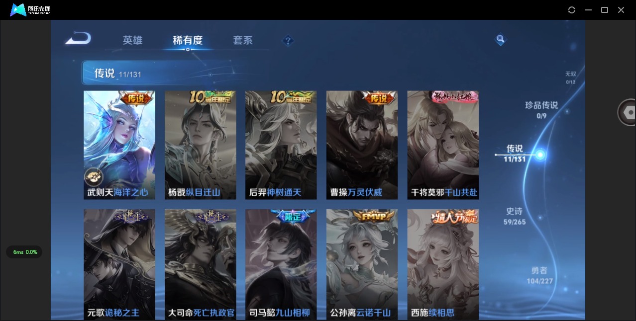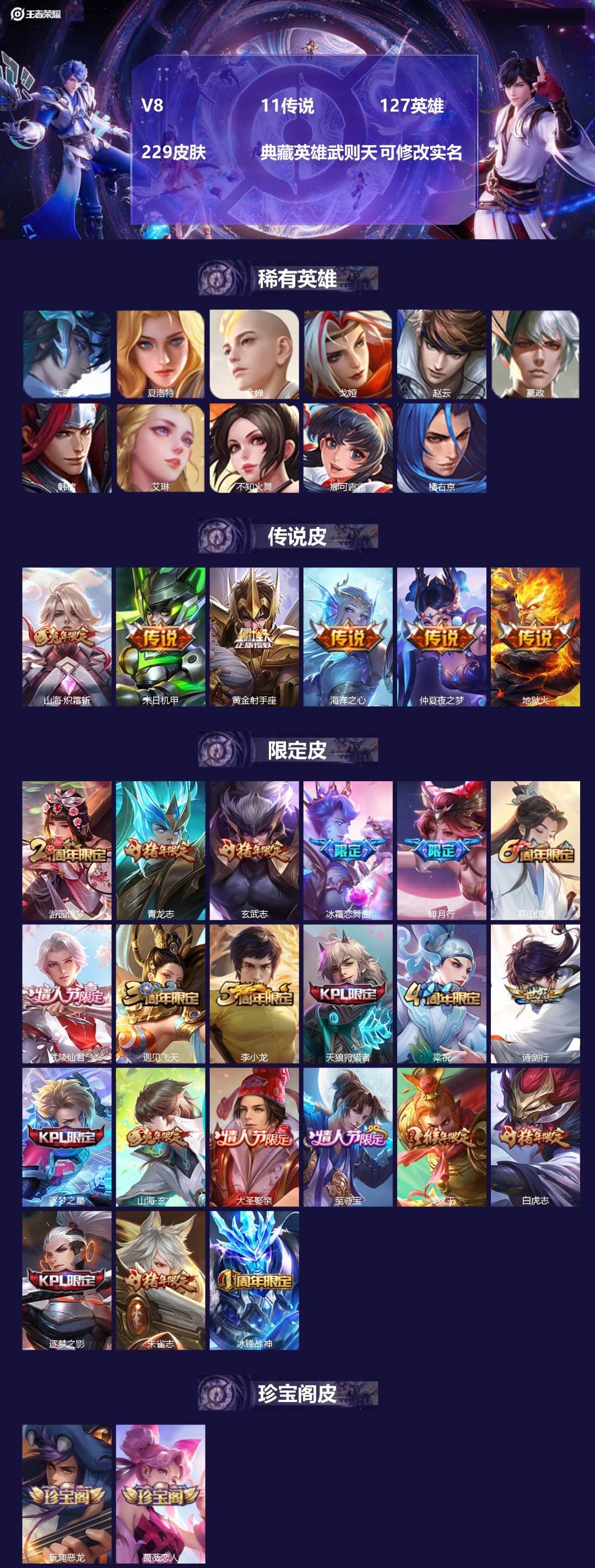 v8 11传说 127英雄 229皮肤 典藏英雄武则天 可修改实名 【稀有英雄】:大司命嬴政始皇帝韩信韩跳跳夏洛特夏师傅艾琳橘右京橘子娜可露露鸟人不知火舞赵云金蝉唐僧戈娅 【传说皮】:山海·炽霜斩李信年限黄金射手座地狱火仲夏夜之梦大飞蛾海
