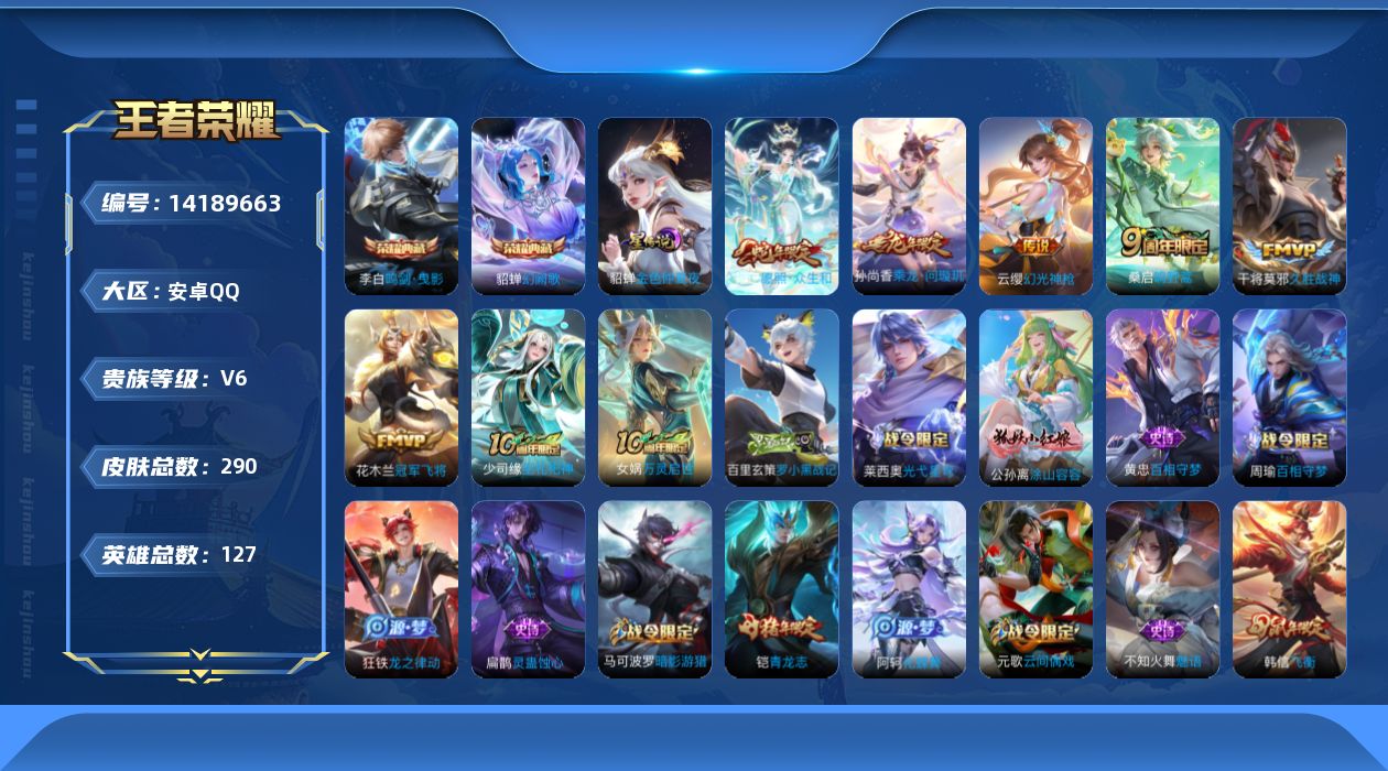 [14189663]【店主推荐捡漏号!可直接换绑】安卓q-v6-最强王者段位-127英雄-290皮肤-2典藏-1星元-7传说-83史诗 【英雄全皮】:孙权全皮,蒙恬全皮,影全皮 【荣耀典藏】:李白鸣剑曳影,貂蝉幻阙歌 【传说皮肤】:后羿神树通天,妲己愿照众生和,云缨幻光神呛,桑启鸣野蒿,孙尚香乘龙问璇玑,干将莫邪久胜战神,花木兰冠军飞将 【限定皮肤】:蔡文姬夏日便利店,大乔绒语心约,虞姬夏日便利店,姜子牙天穹之誓,狄仁杰阴阳师,虞姬凯尔特女王,赵云皇家上将,墨子神迹守卫,孙尚香蔷薇恋人,阿轲迷踪丽影,扁鹊炼金王,芈月重明,元歌云间偶戏,元歌无心,夏侯惇朔风刀,甄姬游园惊梦,曹操烛龙,典韦穷奇,马可波罗暗影游猎,狄仁杰魔术师,狄仁杰万华元夜,达摩星际陆战队,达摩沙漠行僧,项羽海滩派对,老夫子醍醐杖,老夫子航海奇遇记,程咬金演武夺筹,韩信飞衡,亚瑟潮玩骑士王,牛魔御旌,李元芳云中旅人,钟馗驱傩正仪,杨玉环遇见飞天,干将莫邪胡桃夹子,雅典娜黎明之约,太乙真人饕餮,鬼谷子原初探秘者,鬼谷子五谷丰年,铠青龙志,百里玄策原初追逐者,弈星混沌棋,沈梦溪大漠名商,明世隐疑决卦,裴擒虎李小龙,裴擒虎擒涛扼浪,狂铁御狮,米莱狄御霄,米莱狄胡桃异想国,云中君纤云弄巧,伽罗天狼溯光者,盾山御銮,上官婉儿梁祝,嫦娥拒霜思,鲁班大师探海日志,桑启海盐诗旅,艾琳女武神,艾琳流音漫舞,阿古朵江河有灵,张良古海寻踪,蒙犽百解令,蒙恬荣光圣徽,鬼谷子天穹祈灯,孙尚香乘龙问璇玑,沈梦溪龙舞盛年,刘邦剑破天穹,程咬金群星魔术团,镜青焰无极,项羽苍威无极,周瑜熔金海岸 【年限皮肤】:铠青龙志,韩信飞衡,孙尚香乘龙问璇玑 【赛季限定】:扁鹊炼金王,芈月重明,夏侯惇朔风刀,曹操烛龙,典韦穷奇,狄仁杰万华元夜,达摩沙漠行僧,老夫子醍醐杖,程咬金演武夺筹,张良古海寻踪,牛魔御旌,李元芳云中旅人,虞姬凯尔特女王,钟馗驱傩正仪,雅典娜黎明之约,太乙真人饕餮,鬼谷子原初探秘者,百里玄策原初追逐者,弈星混沌棋,沈梦溪大漠名商,明世隐疑决卦,裴擒虎擒涛扼浪,狂铁御狮,米莱狄御霄,盾山御銮,鲁班大师探海日志,桑启海盐诗旅,鬼谷子天穹祈灯,蒙恬荣光圣徽,刘邦剑破天穹,姜子牙天穹之誓 【战令限定】:墨子神迹守卫,蔡文姬夏日便利店,虞姬夏日便利店,阿轲迷踪丽影,元歌云间偶戏,马可波罗暗影游猎,达摩星际陆战队,老夫子航海奇遇记,艾琳流音漫舞,亚瑟潮玩骑