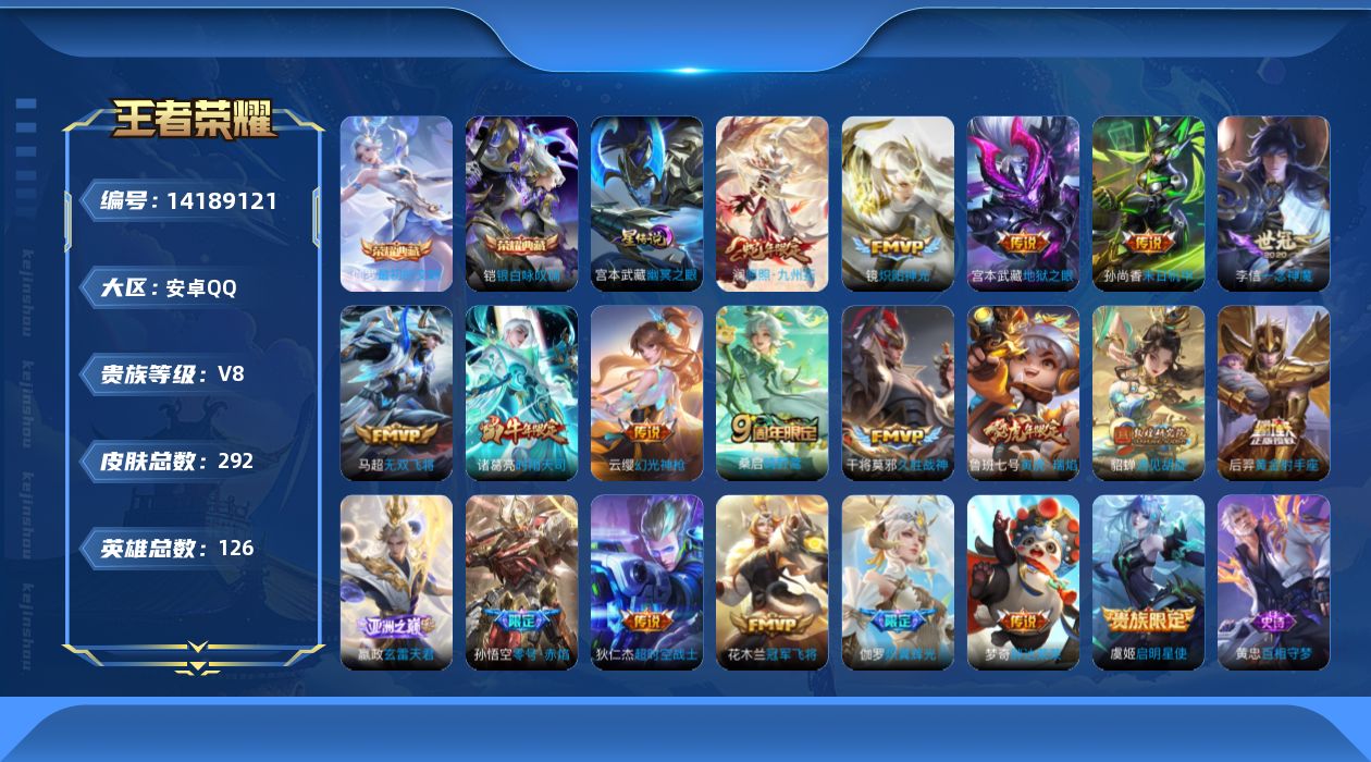 [14189121]【店主推荐捡漏号!可直接换绑】安卓q-v8-最强王者段位-126英雄-292皮肤-2典藏皮肤-21传说-89史诗-1星元 【英雄全皮】:孙权全皮,蒙恬全皮,影全皮 【荣耀典藏】:铠银白咏叹调,伽罗最初的交响 【传说皮肤】:后羿神树通天,澜愿照九州拓,云缨幻光神呛,嬴政玄雷天君,桑启鸣野蒿,伽罗炽翼辉光,马超无双飞将,鲁班七号寅虎瑞焰,貂蝉遇见胡旋,诸葛亮时雨天司,镜炽阳神光,虞姬启明星使,孙悟空零号赤焰,李信一念神魔,干将莫邪久胜战神,花木兰冠军飞将,梦奇胖达荣荣,后羿黄金射手座,孙尚香末日机甲,宫本武藏地狱之眼,狄仁杰超时空战士 【限定皮肤】:蒙犽顽岩魄,蔡文姬夏日便利店,大乔绒语心约,虞姬夏日便利店,姜子牙天穹之誓,杨戬破阵退雄兵,狄仁杰阴阳师,赵云皇家上将,墨子神迹守卫,嬴政优雅恋人,孙尚香蔷薇恋人,鲁班七号寅虎瑞焰,庄周高山流水,高渐离死亡摇滚,芈月重明,吕布御风骁将,元歌无心,夏侯惇朔风刀,甄姬游园惊梦,曹操烛龙,马可波罗山海玄木吟,狄仁杰魔术师,狄仁杰万华元夜,达摩星际陆战队,达摩沙漠行僧,项羽海滩派对,老夫子醍醐杖,老夫子航海奇遇记,关羽冰锋战神,貂蝉遇见胡旋,程咬金演武夺筹,兰陵王金庭之子,花木兰青春决赛季,花木兰默契交锋,孙悟空至尊宝,孙悟空零号赤焰,后羿圣弓游侠,李元芳云中旅人,虞姬启明星使,钟馗驱傩正仪,杨玉环遇见飞天,杨玉环寅虎心曲,干将莫邪真爱魔法,雅典娜黎明之约,蔡文姬繁星吟游,太乙真人饕餮,太乙真人华丽摇滚,鬼谷子原初探秘者,鬼谷子五谷丰年,诸葛亮时雨天司,铠青龙志,苏烈千军破阵,百里玄策原初追逐者,百里守约朱雀志,弈星混沌棋,梦奇顽趣,沈梦溪大漠名商,明世隐疑决卦,裴擒虎李小龙,裴擒虎擒涛扼浪,米莱狄御霄,米莱狄胡桃异想国,云中君纤云弄巧,伽罗天狼溯光者,伽罗炽翼辉光,上官婉儿天狼绘梦者,上官婉儿神器万象笔,嫦娥拒霜思,嫦娥暖冬兔眠,鲁班大师探海日志,桑启海盐诗旅,暃星界游侠,司空震地狱燃心,张良古海寻踪,蒙恬荣光圣徽,鬼谷子天穹祈灯,沈梦溪龙舞盛年,刘邦剑破天穹,程咬金群星魔术团,镜青焰无极,项羽苍威无极,周瑜熔金海岸 【年限皮肤】:百里守约朱雀志,铠青龙志,鲁班七号寅虎瑞焰,杨玉环寅虎心曲,吕布御风骁将,诸葛亮时雨天司,马可波罗山海玄木吟,伽罗炽翼辉光 【赛季限定】:芈月重明,夏侯惇朔风刀,曹操烛龙,狄仁杰万华元夜,达摩沙漠行僧