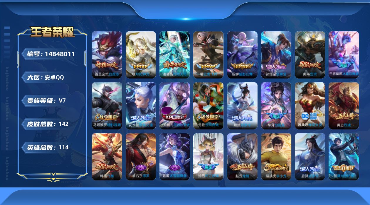 [14848011]v7 5传说 114英雄 142皮肤 可修改实名 【稀有英雄】:大司命嬴政始皇帝韩信韩跳跳夏洛特夏师傅艾琳橘右京橘子娜可露露鸟人不知火舞赵云戈娅 【传说皮】:猫影幻舞云鹰飞将小将军炽阳神光 【珍宝阁皮】:优雅恋人 【赛季/战令皮】:狮心王s3蜃楼王s4妖精王s5炼金王s6狰s8朔风刀s17混沌棋s18疑决卦s19醍醐杖s20原初探秘者s21万华元夜s22演武夺筹s23驱傩正仪s24千军破阵s25星空之诺银河之约夺宝奇兵迷踪丽影西部大镖客-猪八戒暗影游猎游乐娃子单词大作战狂想玩偶喵潮玩骑士王云间偶戏 【史诗皮】:黄金分割率千年之狐修罗水果甜心德古拉伯爵幽灵船长鬼剑武藏地狱岩魂纤云弄巧繁星吟游呼啦呼啦乘风破浪曙光守护者金属风暴圣诞狂欢圣诞恋歌鹰眼统帅魅力维加斯未来纪元-赵云 【限定皮】:至尊宝白虎志电光耗子时之彼端白晶晶时雨天司水龙头飞衡韩信年限高山流水梁祝龙胆烈魂岱宗典韦年限天狼绘梦者李小龙如梦令-嫦娥如梦令-后羿霸王别姬-项羽霸王别姬-虞姬默契交锋-花木兰冰霜恋舞曲神奇女侠 【普通皮】:街头霸王逆浪荇歌危途狂花尼罗河女神完美运算万事如意归虚梦演-蒙犽海滩丽影海滩派对皇家上将魔术师沉稳之力坚韧之力霸王丸化身博士炽热元素使缤纷绘卷纽约教父圆桌骑士(盾山)乓乓大师黄金武士次元突破大发明家功夫老勺哥特玫瑰教廷特使阴阳师死亡骑士少女阿狸无尽征程丁香结黑桃队长冰雪圆舞曲科学大爆炸玩偶对对碰爱与正义瓷语鉴心幻想奇妙夜阿尔法小队黑猫爱糖果次元傲视幻乐之宴露花倒影修竹墨客灼热之刃幸存者冰刃幻境花见巫女第七人偶地府判官埃及法老福禄兄弟维京掠夺者万圣前夜异域舞娘激情绿茵赤焰之缨秩序猎龙将森创世神祝年年有余海之征途午夜歌剧院街头旋风花间舞占星师绝影神呛阿摩司公爵致命风华天启骑士范海辛隐刃木偶奇遇记西部大镖客-孙悟空精灵公主时尚教父