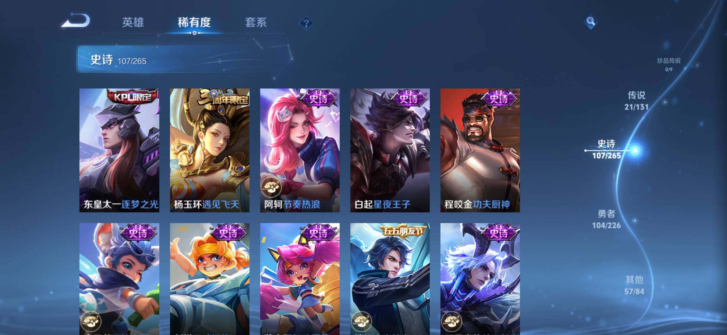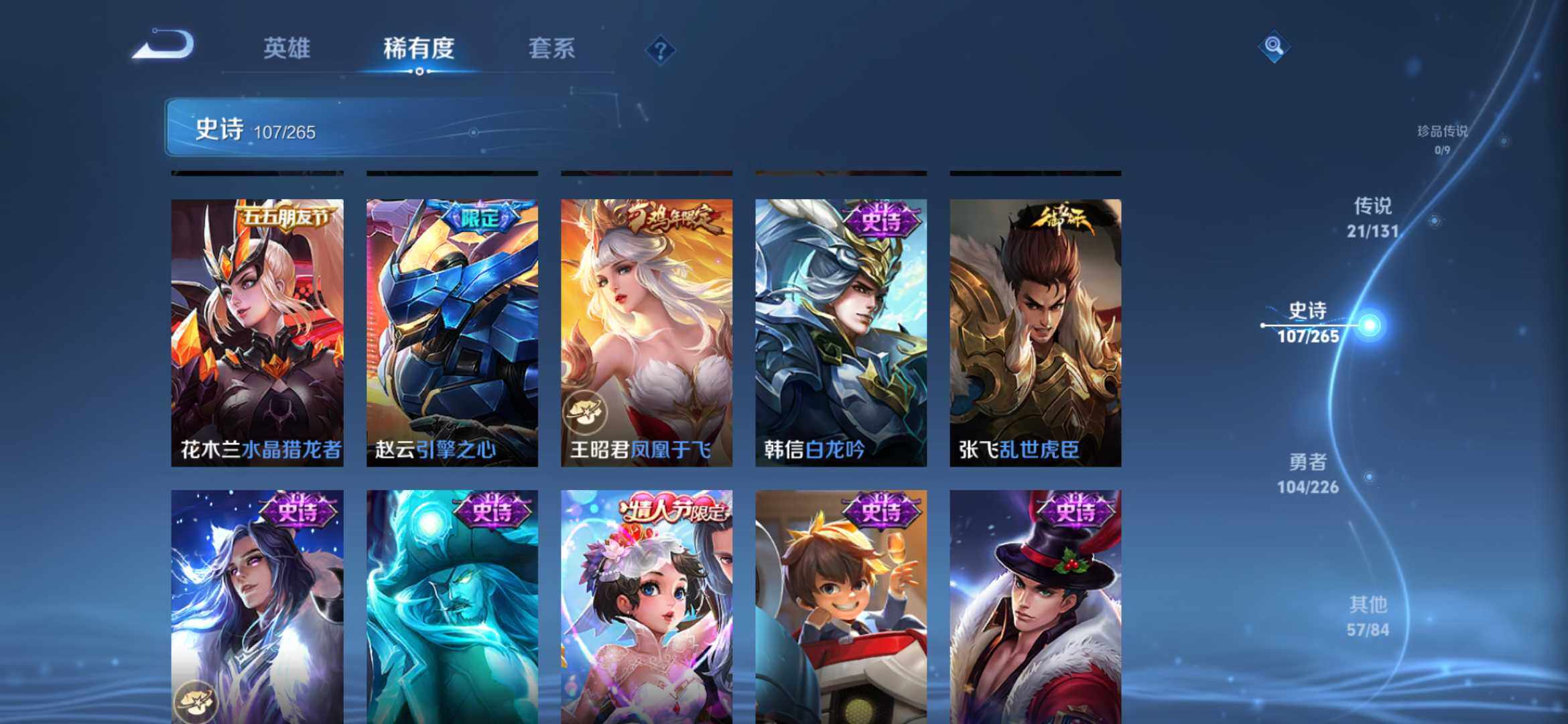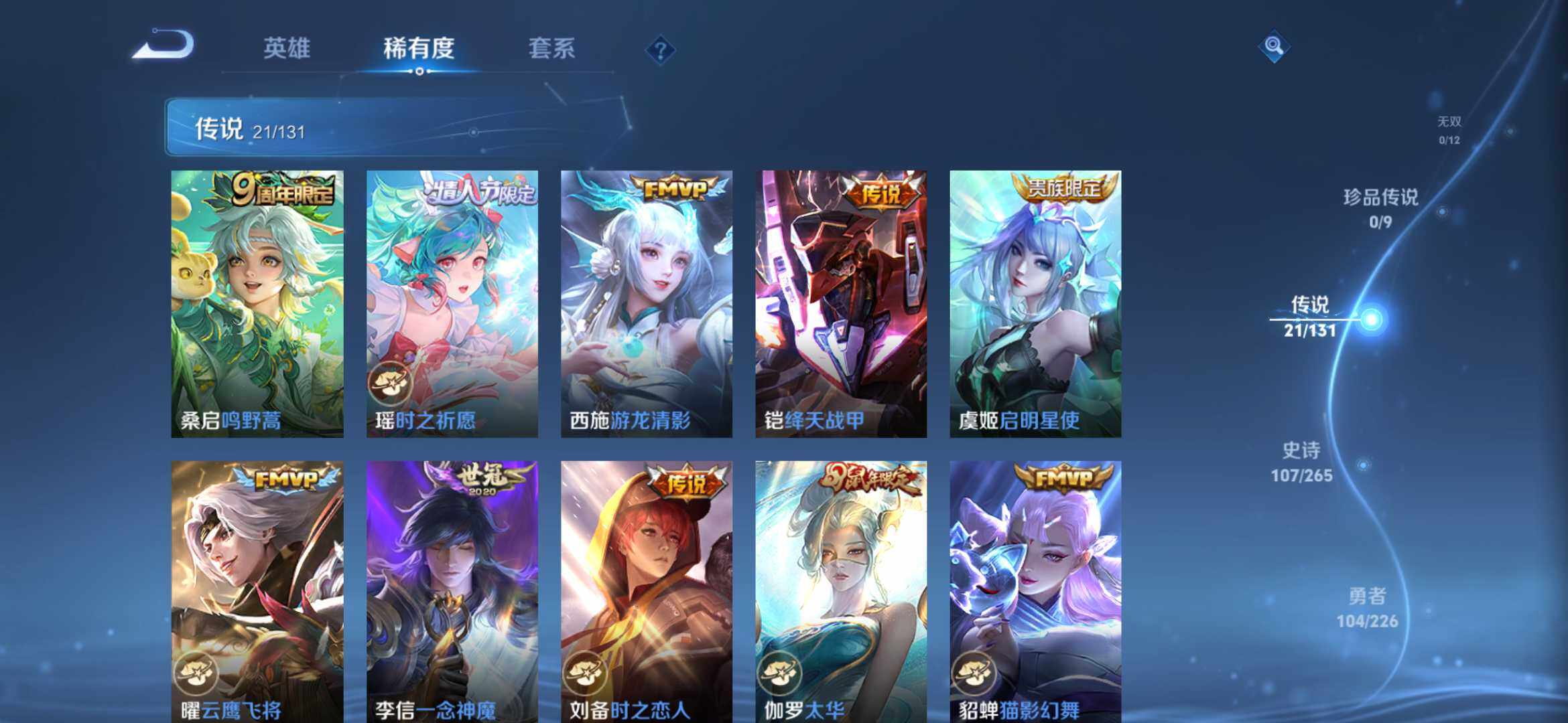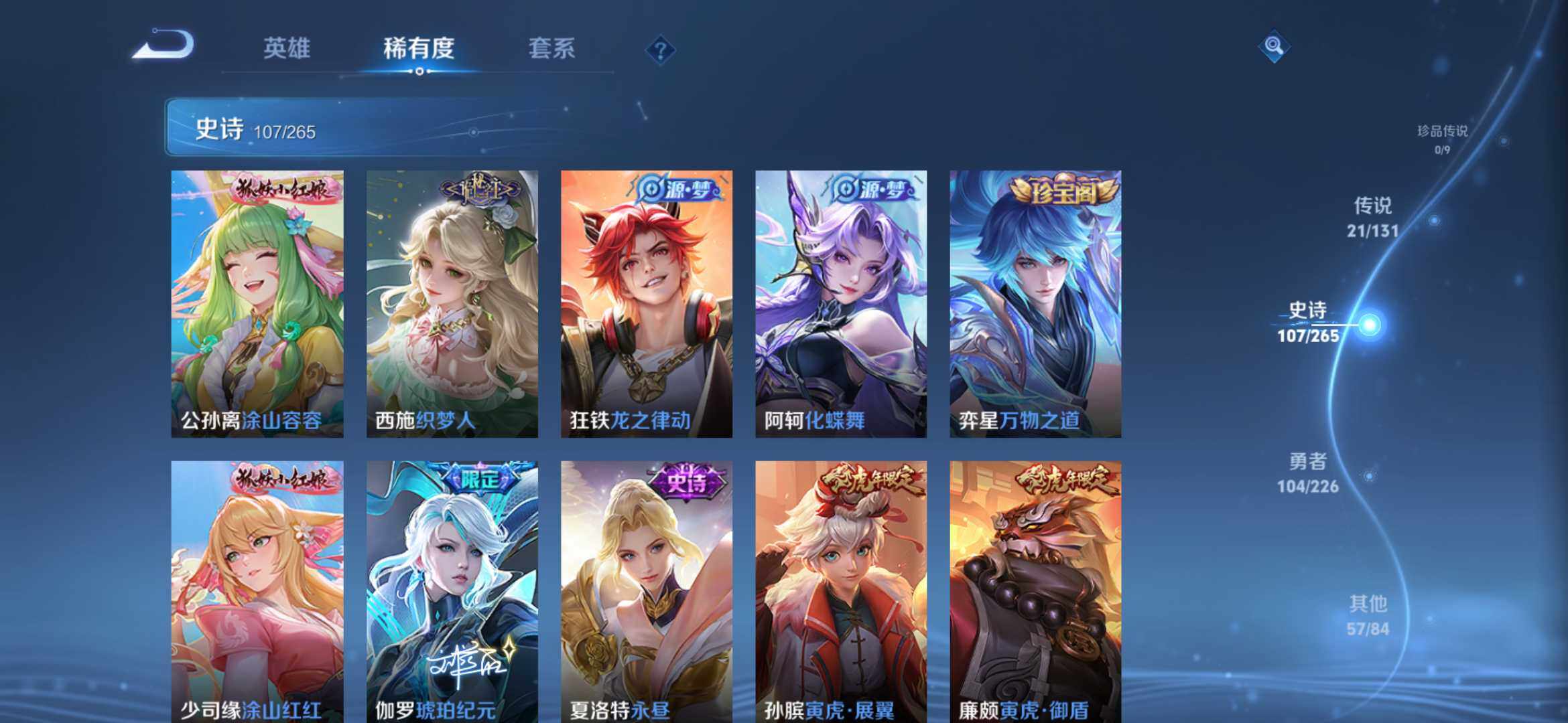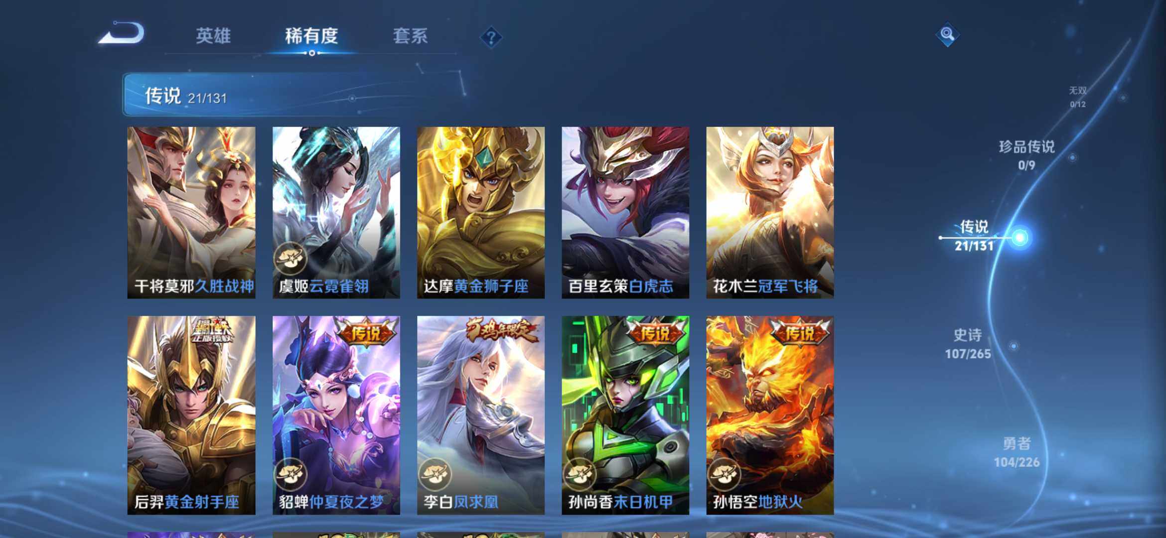 2270222-【291皮2典藏21传说全息碎影 银白咏叹调 时之祈愿 一念神魔 太华白虎志 凤求凰】安卓q-v9-永恒钻石ii段位-127英雄-291皮肤-2典藏-0珍品无双-0无双-0珍品传说-21传说-107史诗 【荣耀典藏】:孙悟空全息碎影,铠银白咏叹调 【传说皮肤】:桑启鸣野蒿,瑶时之祈愿,西施游龙清影,铠绛天战甲,虞姬启明星使,曜云鹰飞将,李信一念神魔,刘备时之恋人,伽罗太华,