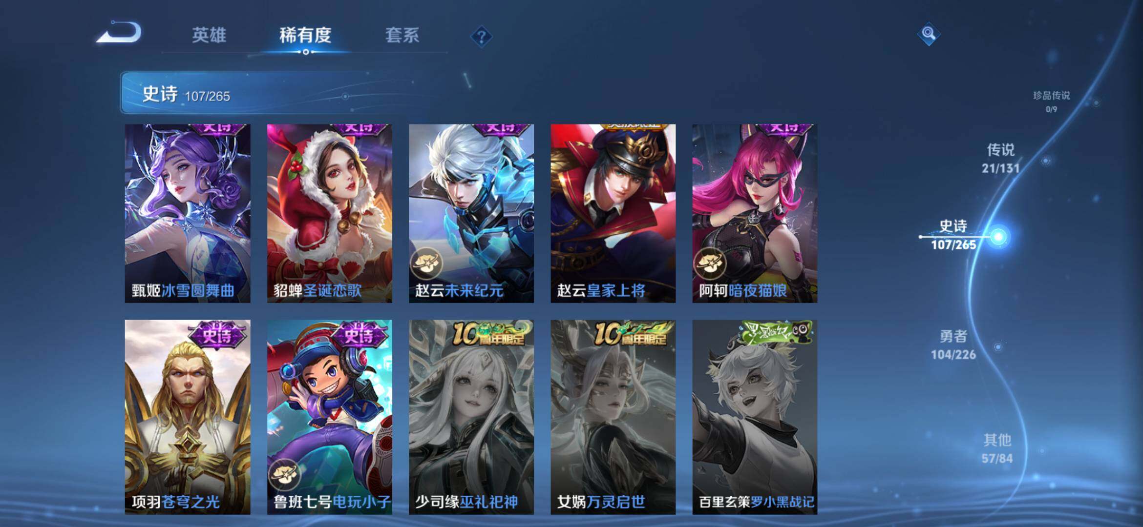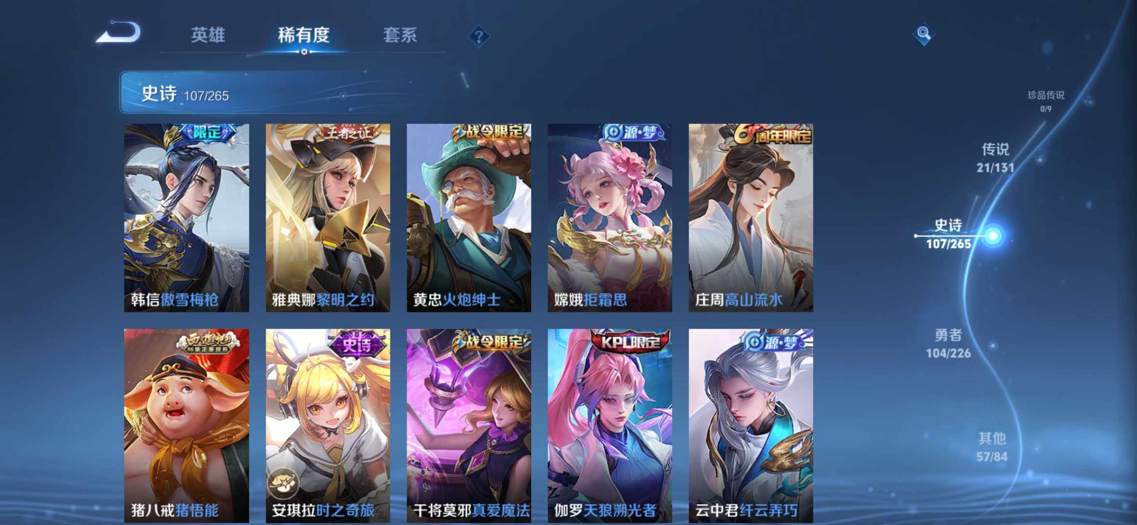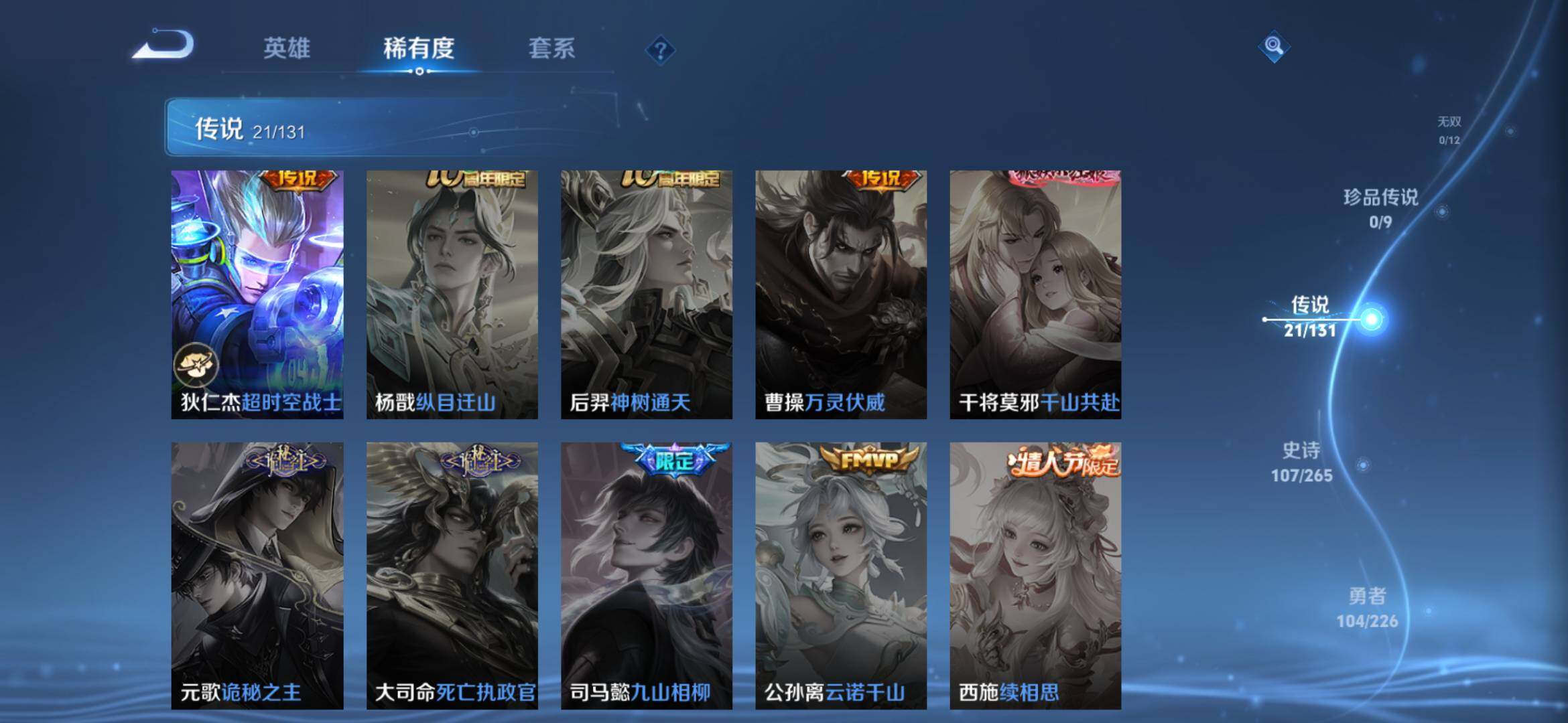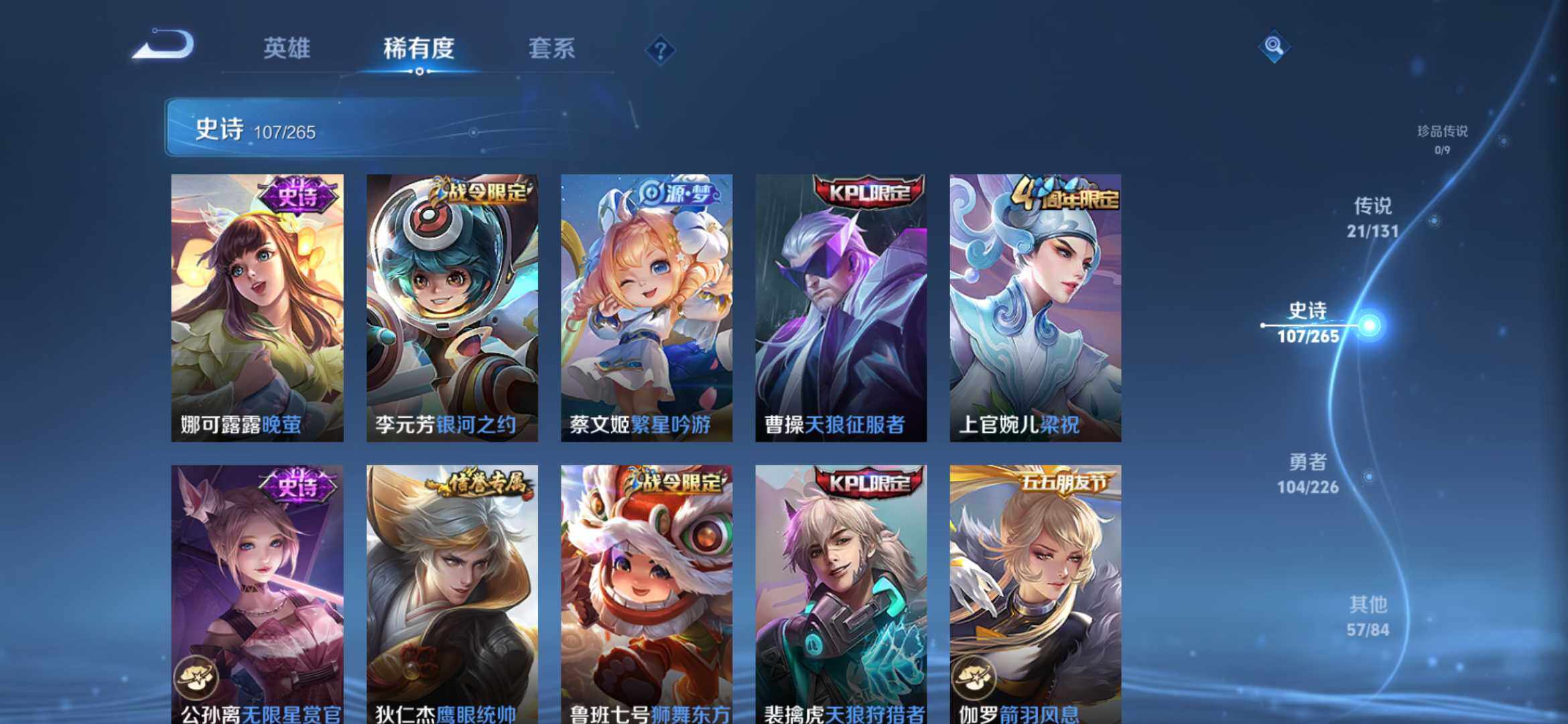 2270222-【291皮2典藏21传说全息碎影 银白咏叹调 时之祈愿 一念神魔 太华白虎志 凤求凰】安卓q-v9-永恒钻石ii段位-127英雄-291皮肤-2典藏-0珍品无双-0无双-0珍品传说-21传说-107史诗 【荣耀典藏】:孙悟空全息碎影,铠银白咏叹调 【传说皮肤】:桑启鸣野蒿,瑶时之祈愿,西施游龙清影,铠绛天战甲,虞姬启明星使,曜云鹰飞将,李信一念神魔,刘备时之恋人,伽罗太华,