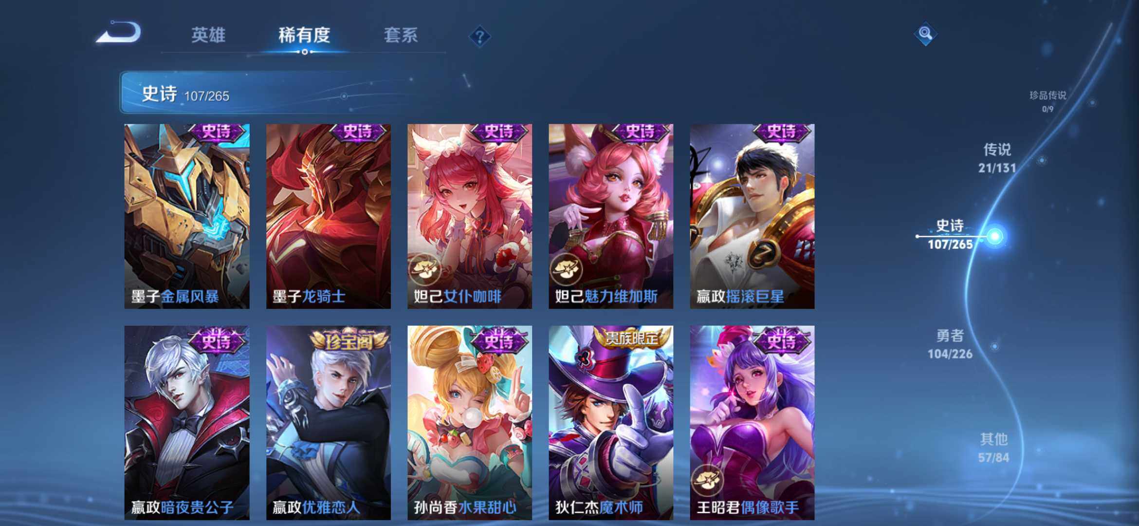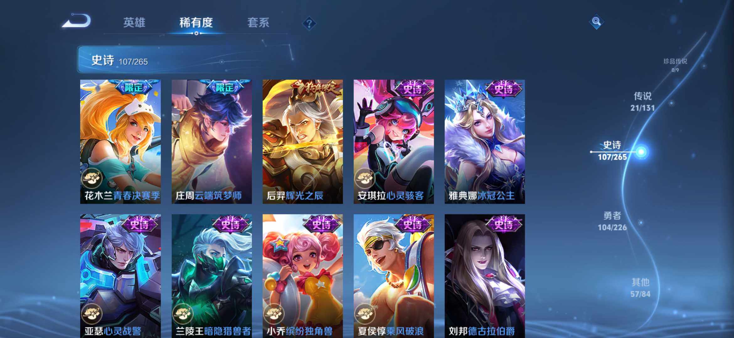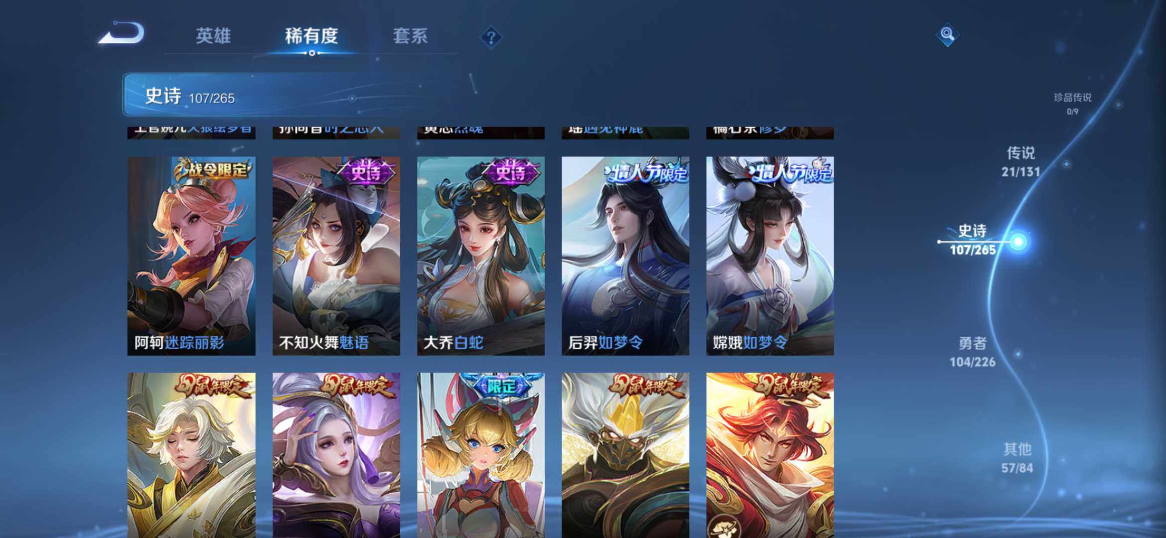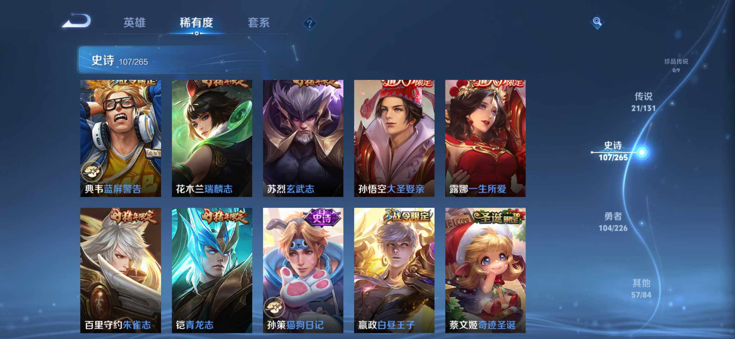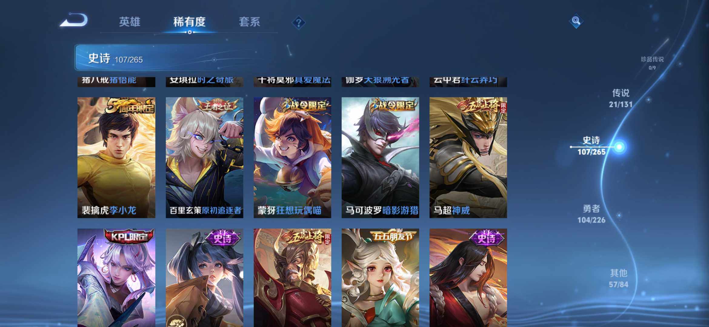 2270222-【291皮2典藏21传说全息碎影 银白咏叹调 时之祈愿 一念神魔 太华白虎志 凤求凰】安卓q-v9-永恒钻石ii段位-127英雄-291皮肤-2典藏-0珍品无双-0无双-0珍品传说-21传说-107史诗 【荣耀典藏】:孙悟空全息碎影,铠银白咏叹调 【传说皮肤】:桑启鸣野蒿,瑶时之祈愿,西施游龙清影,铠绛天战甲,虞姬启明星使,曜云鹰飞将,李信一念神魔,刘备时之恋人,伽罗太华,