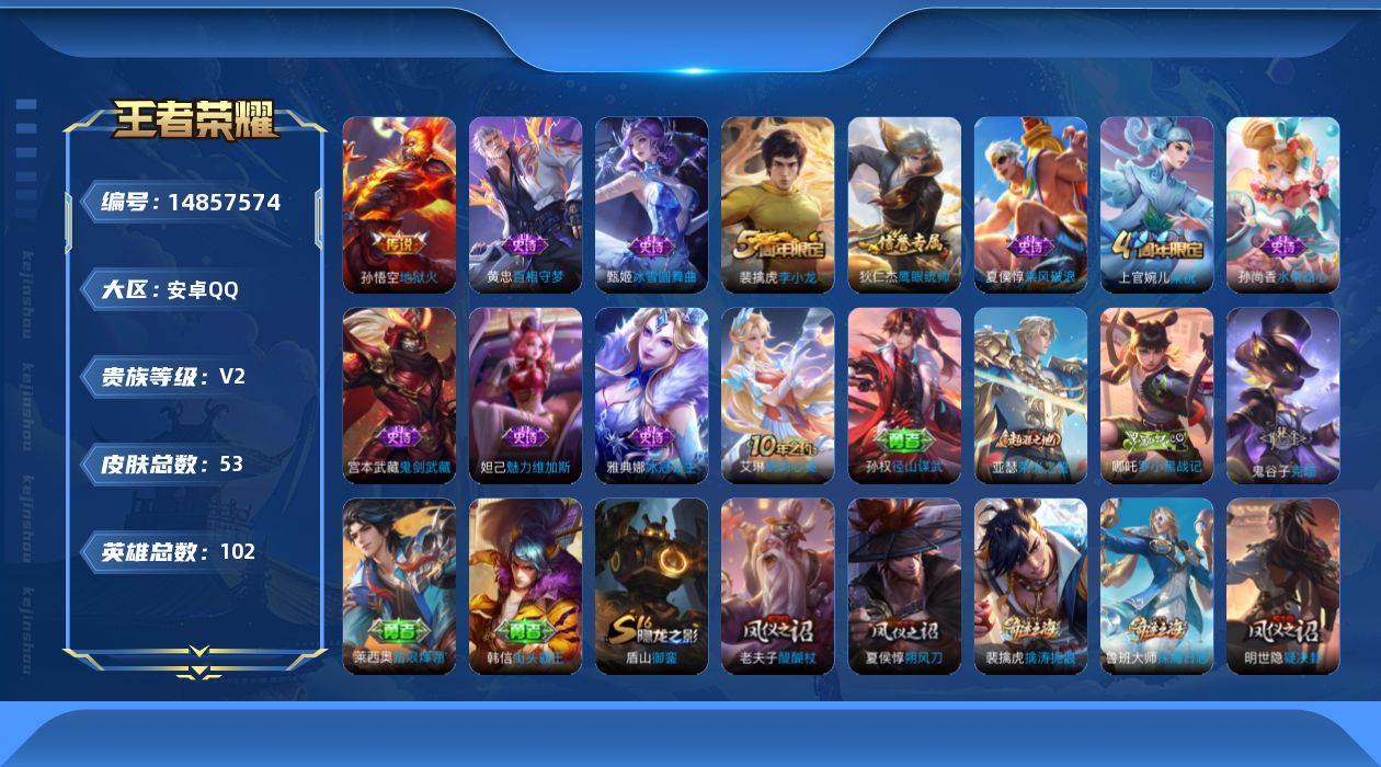 [14857574]ht358可二次2太阳q39级安q-v2-53皮肤 102英雄【1传说】地狱火【1星传说】幽冥火10史诗 18限定 2王者印记 打野11段 发育路10段【热门】冰冠公主 梁祝 黄忠百相守梦 原初探秘者 李小龙 乘风破浪 街头霸王 鬼剑武藏 冰雪圆舞曲 御銮 朔风刀 混沌棋 疑决卦 醍醐杖 万华元夜 克喵 演武夺筹 驱傩正仪 擒涛扼浪 魅力维加斯 探海日志 水果甜心 鹰眼统帅 罗小黑战记