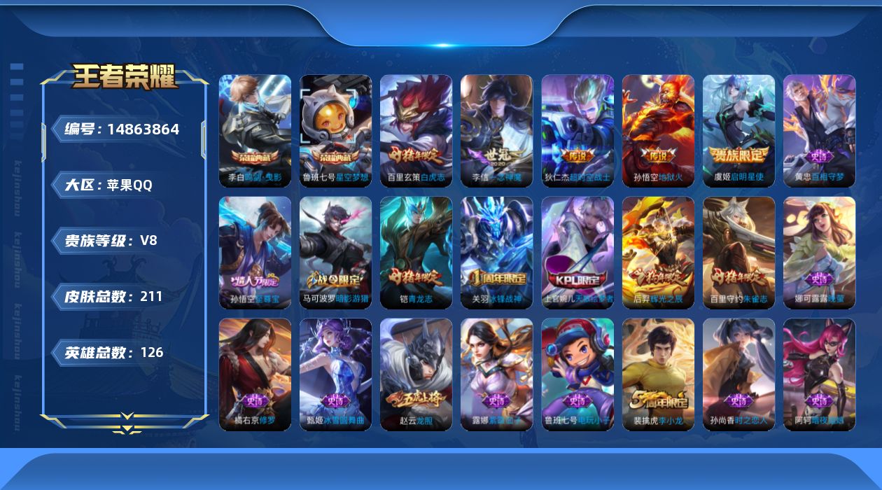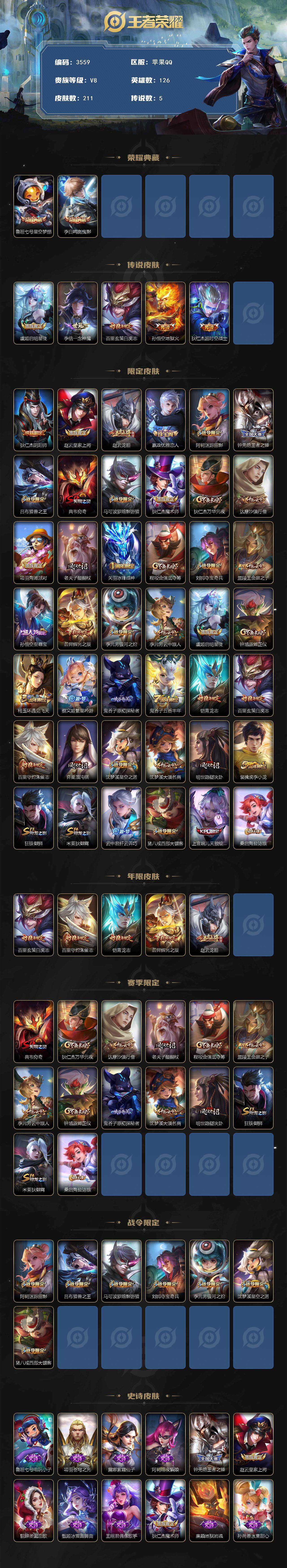 [14863864]苹果q-v7-永恒钻石i段位-126英雄-211皮肤-2典藏皮肤-5传说-48史诗 【荣耀典藏】:鲁班七号星空梦想,李白鸣剑曳影 【传说皮肤】:虞姬启明星使,李信一念神魔,百里玄策白虎志,孙悟空地狱火,狄仁杰超时空战士 【限定皮肤】:狄仁杰阴阳师,赵云皇家上将,赵云龙胆,嬴政优雅恋人,阿轲迷踪丽影,钟无艳王者之锤,吕布猎兽之王,典韦穷奇,马可波罗暗影游猎,狄仁杰魔术师,狄仁杰万华元夜,达摩沙漠行僧,项羽海滩派对,老夫子醍醐杖,关羽冰锋战神,程咬金演武夺筹,刘邦夺宝奇兵,兰陵王金庭之子,孙悟空至尊宝,后羿辉光之辰,李元芳银河之约,李元芳云中旅人,虞姬启明星使,钟馗驱傩正仪,杨玉环遇见飞天,蔡文姬繁星吟游,鬼谷子原初探秘者,鬼谷子五谷丰年,铠青龙志,百里玄策白虎志,百里守约朱雀志,弈星混沌棋,沈梦溪星空之诺,沈梦溪大漠名商,明世隐疑决卦,裴擒虎李小龙,狂铁御狮,米莱狄御霄,云中君纤云弄巧,猪八戒西部大镖客,上官婉儿天狼绘梦者,桑启海盐诗旅 【年限皮肤】:百里玄策白虎志,百里守约朱雀志,铠青龙志,后羿辉光之辰,赵云龙胆 【赛季限定】:典韦穷奇,狄仁杰万华元夜,达摩沙漠行僧,老夫子醍醐杖,程咬金演武夺筹,兰陵王金庭之子,李元芳云中旅人,钟馗驱傩正仪,鬼谷子原初探秘者,弈星混沌棋,沈梦溪大漠名商,明世隐疑决卦,狂铁御狮,米莱狄御霄,桑启海盐诗旅 【战令限定】:阿轲迷踪丽影,吕布猎兽之王,马可波罗暗影游猎,刘邦夺宝奇兵,李元芳银河之约,沈梦溪星空之诺,猪八戒西部大镖客 【史诗皮肤】:鲁班七号电玩小子,项羽苍穹之光,露娜紫霞仙子,阿轲暗夜猫娘,钟无艳王者之锤,赵云皇家上将,貂蝉圣诞恋歌,甄姬冰雪圆舞曲,王昭君偶像歌手,狄仁杰魔术师,廉颇地狱岩魂,孙尚香水果甜心,嬴政优雅恋人,妲己魅力维加斯,墨子金属风暴,曹操幽灵船长,李白千年之狐,吕布末日机甲,关羽冰锋战神,孙悟空至尊宝,刘邦德古拉伯爵,夏侯惇乘风破浪,兰陵王暗隐猎兽者,诸葛亮黄金分割率,雅典娜冰冠公主,后羿辉光之辰,铠曙光守护者,刘禅天才门将,程咬金功夫厨神,阿轲节奏热浪,杨玉环遇见飞天,孙策猫狗日记,铠青龙志,百里守约朱雀志,狄仁杰鹰眼统帅,蔡文姬繁星吟游,李元芳银河之约,娜可露露晚萤,阿轲迷踪丽影,橘右京修罗,赵云龙胆,孙尚香时之恋人,上官婉儿天狼绘梦者,马可波罗暗影游猎,裴擒虎李小龙,云中君纤云弄巧,鬼谷子五谷丰年,黄