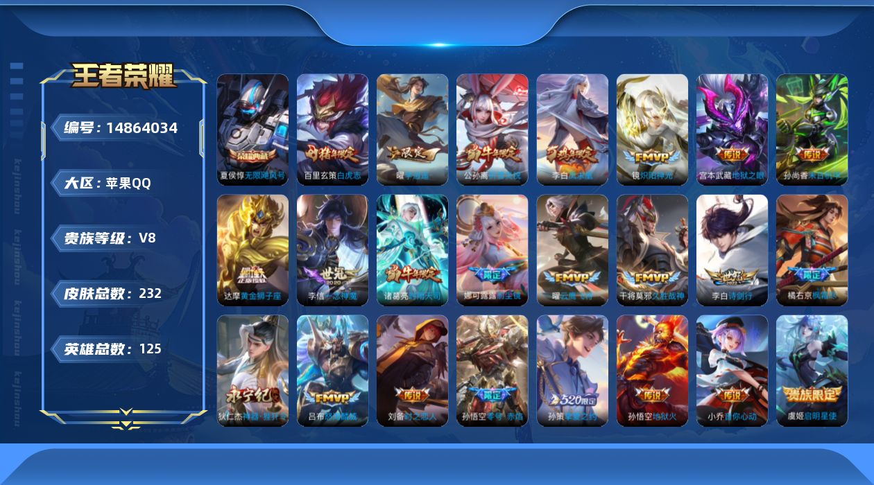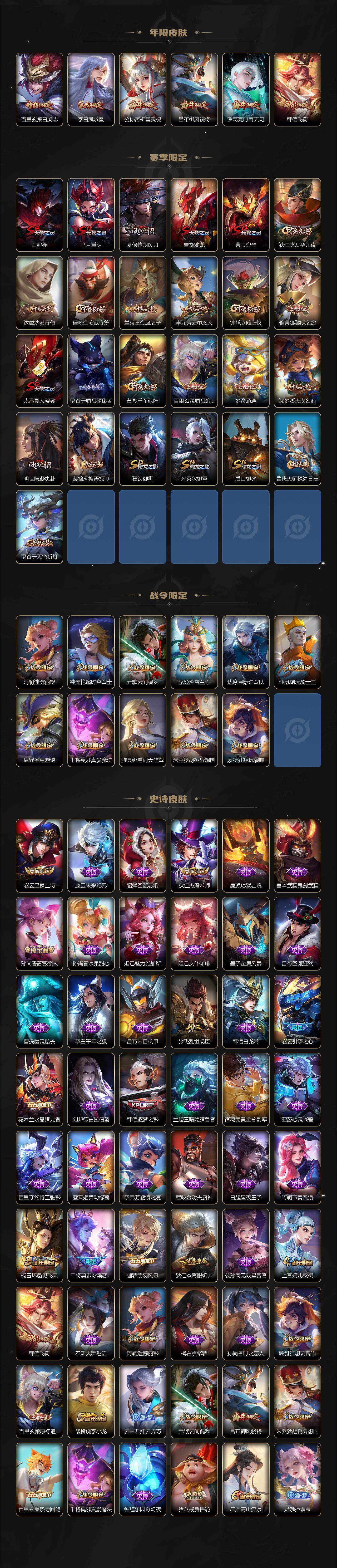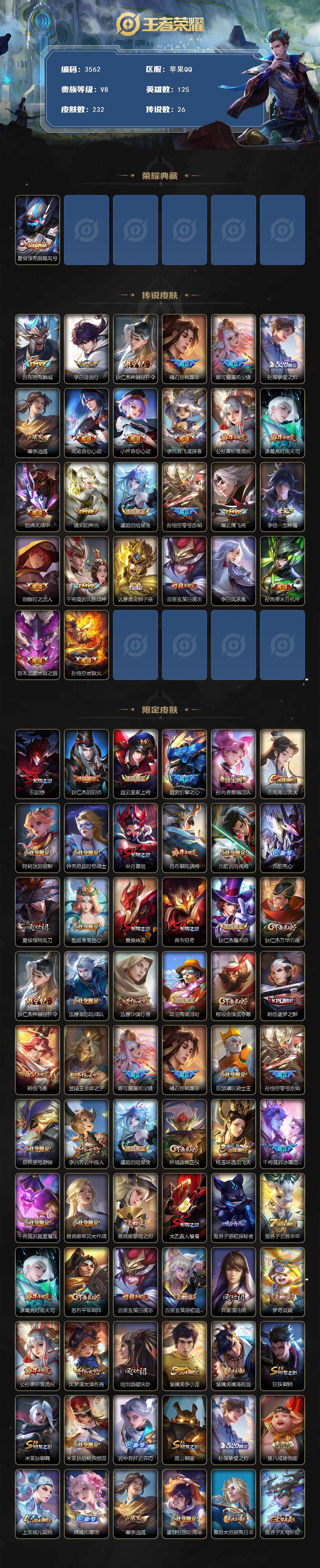 [14864034]苹果q-v8-最强王者段位-125英雄-232皮肤-1典藏皮肤-26传说-61史诗 【英雄全皮】:橘右京全皮 【荣耀典藏】:夏侯惇无限飓风号 【传说皮肤】:吕布怒海麟威,李白诗剑行,狄仁杰神器狴犴令,橘右京枫霜尽,娜可露露前尘镜,孙策挚爱之约,曜李 ,周瑜音你心动,小乔音你心动,李元芳飞鸢探春,公孙离祈雪灵祝,诸葛亮时雨天司,铠绛天战甲,镜炽阳神光,虞姬启明星使,孙悟空零号赤焰,曜云鹰飞将,李信一念神魔,刘备时之恋人,干将莫邪久胜战神,达摩黄金狮子座,百里玄策白虎志,李白凤求凰,孙尚香末日机甲,宫本武藏地狱之眼,孙悟空地狱火 【限定皮肤】:白起狰,狄仁杰阴阳师,赵云皇家上将,赵云引擎之心,孙尚香蔷薇恋人,庄周高山流水,阿轲迷踪丽影,钟无艳超时空战士,芈月重明,吕布御风骁将,元歌云间偶戏,元歌无心,夏侯惇朔风刀,甄姬落雪兰心,曹操烛龙,典韦穷奇,狄仁杰魔术师,狄仁杰万华元夜,狄仁杰神器狴犴令,达摩星际陆战队,达摩沙漠行僧,项羽海滩派对,程咬金演武夺筹,韩信逐梦之影,韩信飞衡,兰陵王金庭之子,娜可露露前尘镜,橘右京枫霜尽,亚瑟潮玩骑士王,孙悟空零号赤焰,后羿圣弓游侠,李元芳云中旅人,虞姬启明星使,钟馗驱傩正仪,杨玉环遇见飞天,干将莫邪冰霜恋舞曲,干将莫邪真爱魔法,雅典娜单词大作战,雅典娜黎明之约,太乙真人饕餮,鬼谷子原初探秘者,鬼谷子五谷丰年,诸葛亮时雨天司,苏烈千军破阵,百里玄策白虎志,百里玄策原初追逐者,弈星混沌棋,梦奇顽趣,公孙离祈雪灵祝,沈梦溪大漠名商,明世隐疑决卦,裴擒虎李小龙,裴擒虎擒涛扼浪,狂铁御狮,米莱狄御霄,米莱狄胡桃异想国,云中君纤云弄巧,盾山御銮,孙策挚爱之约,猪八戒猪悟能,上官婉儿梁祝,嫦娥拒霜思,曜李 ,蒙犽狂想玩偶喵,鲁班大师探海日志,鬼谷子天穹祈灯 【年限皮肤】:百里玄策白虎志,李白凤求凰,公孙离祈雪灵祝,吕布御风骁将,诸葛亮时雨天司,韩信飞衡 【赛季限定】:白起狰,芈月重明,夏侯惇朔风刀,曹操烛龙,典韦穷奇,狄仁杰万华元夜,达摩沙漠行僧,程咬金演武夺筹,兰陵王金庭之子,李元芳云中旅人,钟馗驱傩正仪,雅典娜黎明之约,太乙真人饕餮,鬼谷子原初探秘者,苏烈千军破阵,百里玄策原初追逐者,弈星混沌棋,梦奇顽趣,沈梦溪大漠名商,明世隐疑决卦,裴擒虎擒涛扼浪,狂铁御狮,米莱狄御霄,盾山御銮,鲁班大师探海日志,鬼谷子天穹祈灯 【战令限定】:阿轲