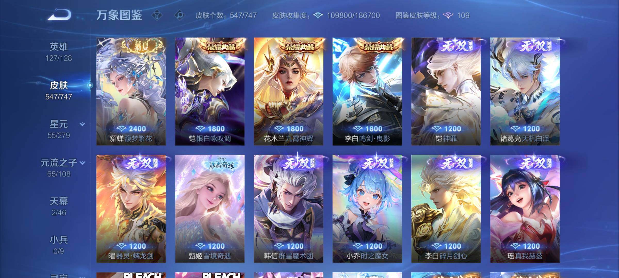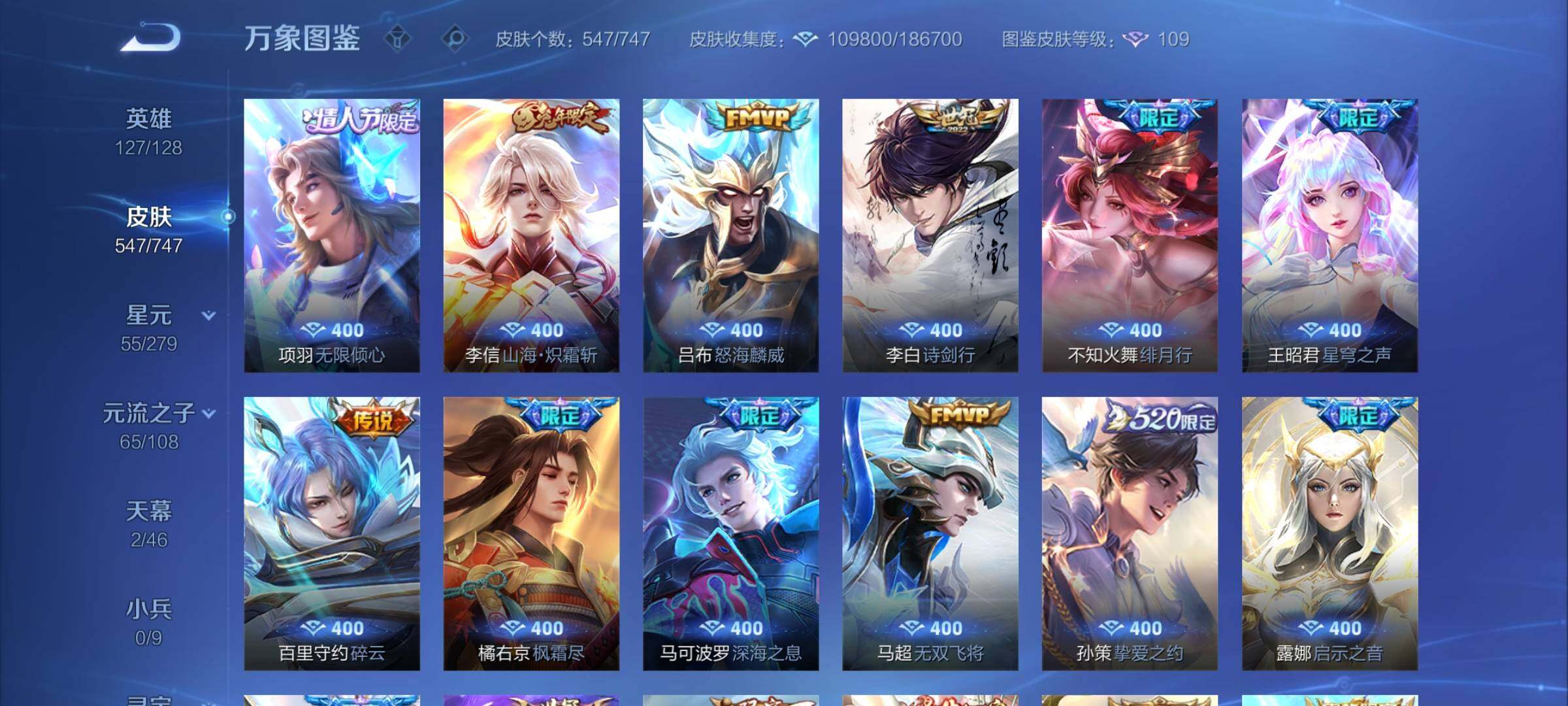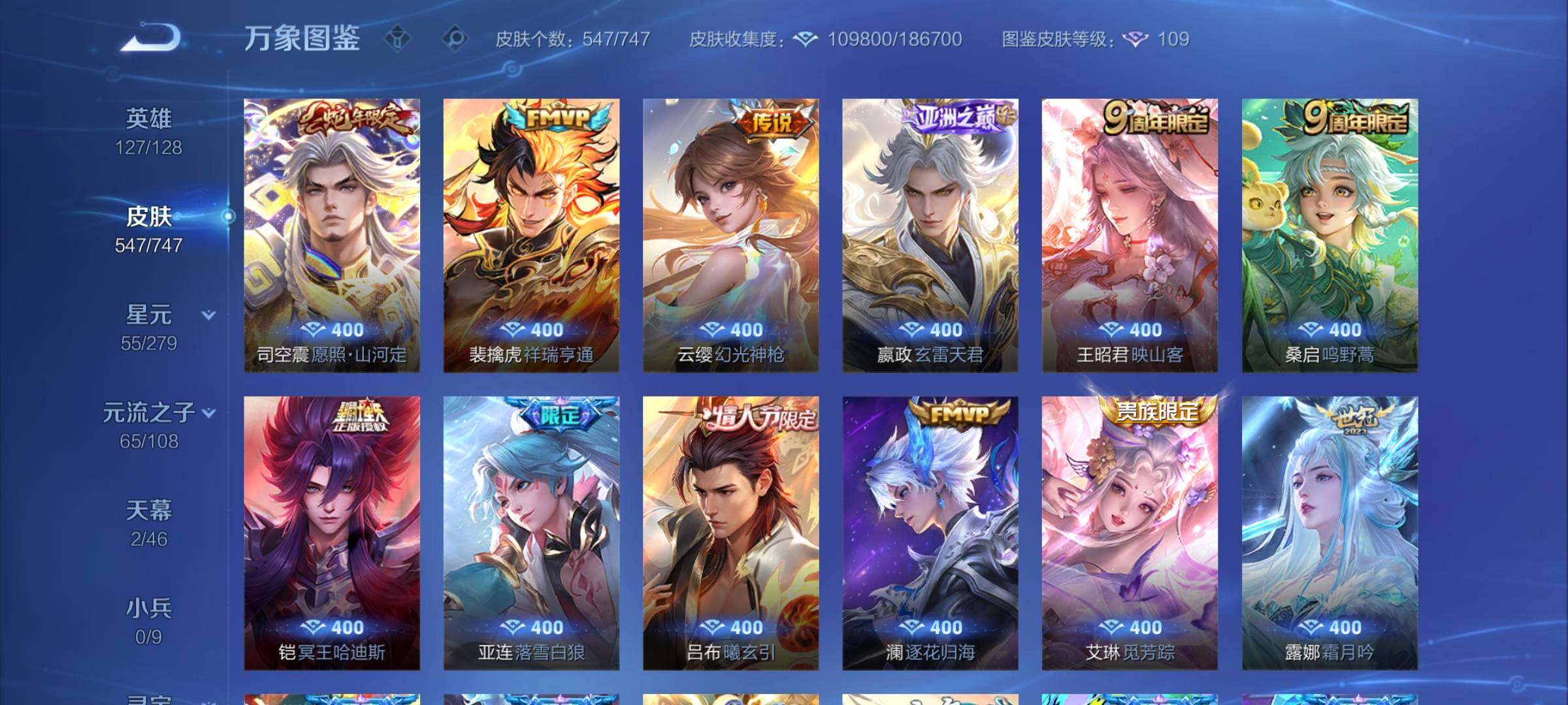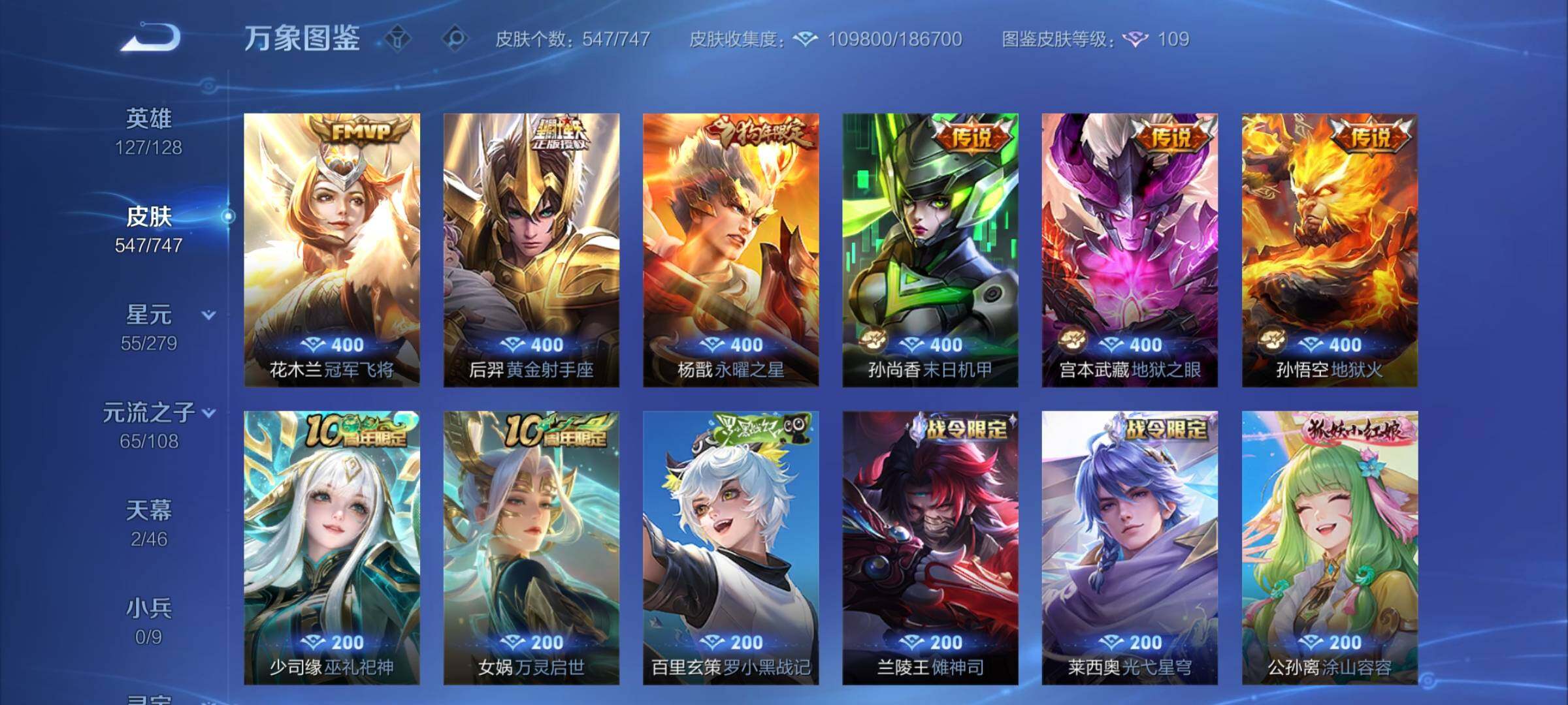 【店铺主推·无双v10·7w流光积分·馥梦繁花·3典藏·8无双·满珍品·蛇年全限定·全皮露娜·全皮花木兰·全皮澜·全皮镜·破晓神光·棉花糖聚会天幕·可二次】w8943-安卓q区服-127英雄-547皮肤-30王者印记-满级铭文-贵族积分25w【无双贵族11】【3典藏·1珍品无双·8无双·9珍品·5星传说·69传说·2天幕·54按键·176个性戳戳】【因赛季更新游戏段付以上号为准!】 【英雄