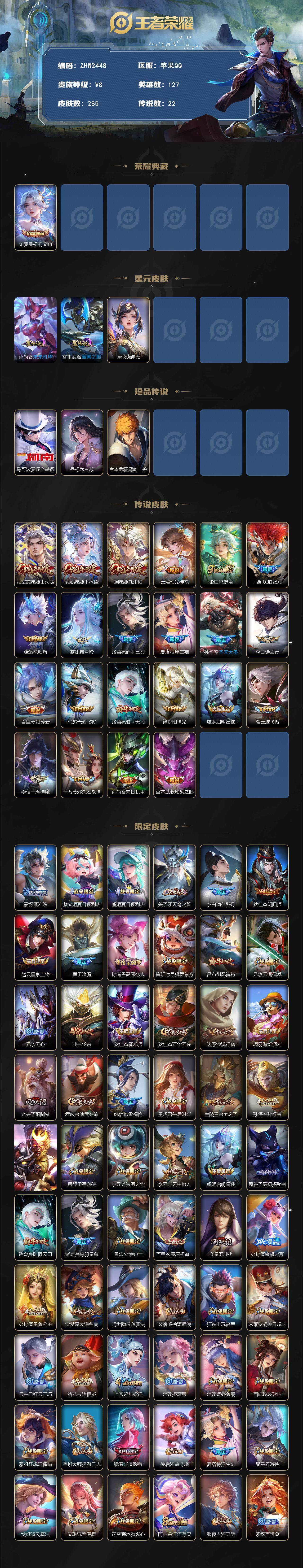 可二次,【店主推荐捡漏号!可直接换绑】苹果q-v8-最强王者段位-127英雄-285皮肤-1典藏皮肤-3珍品传说-22传说-92史诗 【英雄全皮】:孙权全皮,司空震全皮,戈娅全皮,空空儿全皮 【荣耀典藏】:伽罗最初的交响 【珍品传说】:马可波罗怪盗基德,暃朽木白哉,宫本武藏黑崎一护 【传说皮肤】:司空震愿照山河定,女娲愿照千秋盛,澜愿照九州拓,云缨幻光神呛,桑启鸣野蒿,马超琥珀纪元,澜逐花归海,露娜霜月吟,诸葛亮鹤羽星尊,夏洛特浮生妄,孙悟空齐天大圣,李白诗剑行,百里守约碎云,马超无双飞将,诸葛亮时雨天司,镜炽阳神光,虞姬启明星使,曜云鹰飞将,李信一念神魔,干将莫邪久胜战神,孙尚香末日机甲,宫本武藏地狱之眼 【限定皮肤】:蒙犽顽岩魄,蔡文姬夏日便利店,虞姬夏日便利店,姜子牙天穹之誓,李白谪仙醉月,狄仁杰阴阳师,赵云皇家上将,墨子降魔,孙尚香蔷薇恋人,鲁班七号狮舞东方,吕布御风骁将,元歌云间偶戏,元歌无心,典韦岱宗,狄仁杰魔术师,狄仁杰万华元夜,达摩沙漠行僧,项羽海滩派对,老夫子醍醐杖,程咬金演武夺筹,韩信傲雪梅呛,王昭君午后时光,兰陵王金庭之子,孙悟空孙行者,孙悟空齐天大圣,后羿圣弓游侠,李元芳银河之约,李元芳云中旅人,虞姬启明星使,鬼谷子原初探秘者,诸葛亮时雨天司,诸葛亮鹤羽星尊,黄忠火炮绅士,百里玄策原初追逐者,弈星混沌棋,公孙离蜜橘之夏,公孙离玉兔公主,沈梦溪大漠名商,明世隐吟游魔法,裴擒虎擒涛扼浪,狂铁电玩高手,米莱狄胡桃异想国,云中君纤云弄巧,猪八戒猪悟能,上官婉儿梁祝,嫦娥拒霜思,嫦娥暖冬兔眠,西施玲珑珍味,蒙犽狂想玩偶喵,鲁班大师探海日志,镜匿光追影者,桑启海盐诗旅,夏洛特浮生妄,暃星界游侠,戈娅驭风魔法,艾琳流音漫舞,司空震地狱燃心,阿古朵江河有灵,张良古海寻踪,蒙犽百解令,高渐离燃音魔法,妲己灵卜魔法,鬼谷子天穹祈灯,伽罗琥珀纪元,马超琥珀纪元,姬小满妄想食味,沈梦溪龙舞盛年,鲁班七号蔬乡物语,李元芳蔬乡物语,刘邦剑破天穹,程咬金群星魔术团,镜青焰无极,项羽苍威无极,芈月浮光幕影,周瑜熔金海岸 【年限皮肤】:吕布御风骁将,诸葛亮时雨天司,典韦岱宗 【赛季限定】:狄仁杰万华元夜,达摩沙漠行僧,老夫子醍醐杖,程咬金演武夺筹,兰陵王金庭之子,张良古海寻踪,李元芳云中旅人,鬼谷子原初探秘者,百里玄策原初追逐者,弈星混沌棋,沈梦溪大漠名商,裴擒虎擒涛扼浪,鲁班大师探海日志,桑启海盐诗旅,鬼谷子天穹祈灯,刘邦剑破天穹,姜子牙天穹之誓 【战令限定】:蔡文姬夏日便利店,虞姬夏日便利店,鲁班七号狮舞东方,元歌云间偶戏,王昭君午后时光,艾琳流音漫舞,后羿圣弓游侠,李元芳银河之约,黄忠火炮绅士,明世隐吟游魔法,狂铁电玩高手,米莱狄胡桃异想国,嫦娥暖冬兔眠,西施玲珑珍味,蒙犽狂想玩偶喵,司空震地狱燃心,暃星界游侠,戈娅驭风魔法,高渐离燃音魔法,妲己灵卜魔法,鲁班七号蔬乡物语,李元芳蔬乡物语,镜青焰无极,项羽苍威无极 【史诗皮肤】:鲁班七号电玩小子,露娜紫霞仙子,赵云皇家上将,赵云未来纪元,甄姬冰雪圆舞曲,王昭君偶像歌手,狄仁杰魔术师,宫本武藏鬼剑武藏,孙尚香蔷薇恋人,孙尚香水果甜心,嬴政摇滚巨星,墨子金属风暴,吕布圣诞狂欢,曹操幽灵船长,花木兰水晶猎龙者,夏侯惇乘风破浪,小乔缤纷独角兽,兰陵王暗隐猎兽者,诸葛亮黄金分割率,亚瑟心灵战警,雅典娜冰冠公主,安琪拉心灵骇客,百里守约特工魅影,铠曙光守护者,蔡文姬舞动绿茵,刘禅天才门将,公孙离蜜橘之夏,李元芳逐浪之夏,程咬金功夫厨神,白起星夜王子,阿轲节奏热浪,孙策猫狗日记,大乔猫狗日记,伽罗箭羽风息,鲁班七号狮舞东方,狄仁杰鹰眼统帅,上官婉儿梁祝,李元芳银河之约,典韦岱宗,蒙犽狂想玩偶喵,百里玄策原初追逐者,云中君纤云弄巧,元歌云间偶戏,吕布御风骁将,米莱狄胡桃异想国,杨戬天秀启明,孙悟空孙行者,猪八戒猪悟能,司马懿暗渊魔法,嫦娥拒霜思,镜匿光追影者,黄忠火炮绅士,韩信傲雪梅呛,公孙离玉兔公主,澜赏金猎手,明世隐吟游魔法,狂铁电玩高手,元歌无心,墨子降魔,暃星界游侠,戈娅驭风魔法,镜真我赫兹,司空震地狱燃心,阿古朵江河有灵,蒙犽百解令,妲己灵卜魔法,高渐离燃音魔法,伽罗琥珀纪元,姬小满妄想食味,鲁班七号蔬乡物语,镜青焰无极,芈月浮光幕影,蔡文姬夏日便利店,蒙犽顽岩魄,亚连破空之剑,李白谪仙醉月,艾琳陌上桑,百里守约百相守梦,牛魔星界战将,孙膑茶境仙,阿轲化蝶舞,刘禅鸭鸭历险记,狂铁龙之律动,扁鹊灵蛊蚀心,百里守约雪豹霜爪,后羿石田雨龙,周瑜百相守梦,云缨赞萌露比,黄忠百相守梦,西施织梦人,弈星守夜人,公孙离涂山容容,少司缘巫礼祀神 【其他皮肤】:项羽海滩派对,韩信教廷特使,韩信街头霸王,露娜哥特玫瑰,赵云白执事,赵云忍炎影,芈月红桃皇后,程咬金星际陆战队,白起白色死神,牛魔西部大镖客,扁鹊化身博士,宫本武藏未来纪元,孙膑天使之翼,姜子牙时尚教父,典韦黄金武士,达摩拳王,花木兰兔女郎,张飞五福同心,甄姬花好人间,刘备万事如意,狄仁杰阴阳师,刘备纽约教父,刘备汉昭烈帝,关羽龙腾万里,墨子进击墨子号,钟无艳海滩丽影,王昭君幻想奇妙夜,狂铁命运角斗场,老夫子功夫老勺,孙尚香沉稳之力,诸葛亮掌控之力,李白敏锐之力,鬼谷子幻乐之宴,苏烈坚韧之力,明世隐虹云星官,吕布野性能量,沈梦溪鲨炮海盗猫,姜子牙炽热元素使,弈
