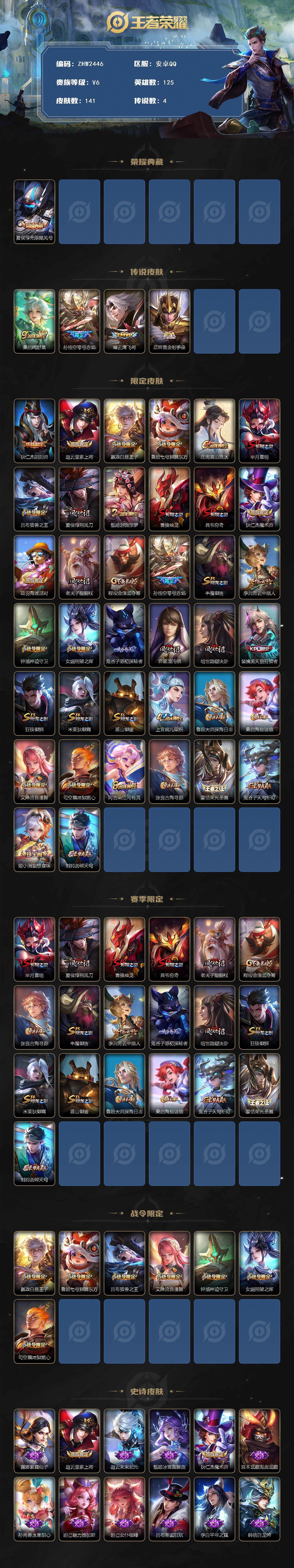 可二次【店主推荐捡漏号!可直接换绑】:安卓q-v6-最强王者段位-125英雄-141皮肤-1典藏皮肤-4传说-42史诗 【荣耀典藏】:夏侯惇无限飓风号 【传说皮肤】:桑启鸣野蒿,孙悟空零号赤焰,曜云鹰飞将,后羿黄金射手座 【限定皮肤】:狄仁杰阴阳师,赵云皇家上将,嬴政白昼王子,鲁班七号狮舞东方,庄周高山流水,芈月重明,吕布猎兽之王,夏侯惇朔风刀,甄姬游园惊梦,曹操烛龙,典韦穷奇,狄仁杰魔术师,项羽海滩派对,老夫子醍醐杖,程咬金演武夺筹,孙悟空零号赤焰,牛魔御旌,李元芳云中旅人,钟馗神迹守卫,女娲朔望之晖,鬼谷子原初探秘者,弈星混沌棋,明世隐疑决卦,裴擒虎天狼狩猎者,狂铁御狮,米莱狄御霄,盾山御銮,上官婉儿梁祝,鲁班大师探海日志,桑启海盐诗旅,艾琳流音漫舞,司空震地狱燃心,阿古朵江河有灵,张良古海寻踪,蒙恬荣光圣徽,鬼谷子天穹祈灯,姬小满妄想食味,刘邦剑破天穹 【赛季限定】:芈月重明,夏侯惇朔风刀,曹操烛龙,典韦穷奇,老夫子醍醐杖,程咬金演武夺筹,张良古海寻踪,牛魔御旌,李元芳云中旅人,鬼谷子原初探秘者,弈星混沌棋,明世隐疑决卦,狂铁御狮,米莱狄御霄,盾山御銮,鲁班大师探海日志,桑启海盐诗旅,鬼谷子天穹祈灯,蒙恬荣光圣徽,刘邦剑破天穹 【战令限定】:嬴政白昼王子,鲁班七号狮舞东方,吕布猎兽之王,艾琳流音漫舞,钟馗神迹守卫,女娲朔望之晖,司空震地狱燃心 【史诗皮肤】:露娜紫霞仙子,赵云皇家上将,赵云未来纪元,甄姬冰雪圆舞曲,狄仁杰魔术师,宫本武藏鬼剑武藏,孙尚香水果甜心,妲己魅力维加斯,妲己女仆咖啡,吕布圣诞狂欢,李白千年之狐,韩信白龙吟,刘邦德古拉伯爵,夏侯惇乘风破浪,小乔缤纷独角兽,兰陵王暗隐猎兽者,诸葛亮黄金分割率,甄姬游园惊梦,蔡文姬舞动绿茵,刘禅天才门将,李元芳逐浪之夏,程咬金功夫厨神,阿轲节奏热浪,嬴政白昼王子,孙策猫狗日记,伽罗箭羽风息,裴擒虎天狼狩猎者,鲁班七号狮舞东方,狄仁杰鹰眼统帅,上官婉儿梁祝,娜可露露晚萤,不知火舞魅语,橘右京修罗,孙尚香时之恋人,庄周高山流水,貂蝉唤灵魅影,镜真我赫兹,莱西奥末日机甲,司空震地狱燃心,阿古朵江河有灵,蒙恬荣光圣徽,姬小满妄想食味 【其他皮肤】:项羽海滩派对,韩信教廷特使,韩信街头霸王,芈月红桃皇后,白起白色死神,扁鹊化身博士,宫本武藏未来纪元,安琪拉玩偶对对碰,孙膑天使之翼,妲己少女阿狸,典韦黄金武士,亚瑟死亡骑士,达摩拳王,花木兰兔女郎,甄姬花好人间,刘备万事如意,宫本武藏万象初新,后羿阿尔法小队,狄仁杰阴阳师,刘备汉昭烈帝,关羽龙腾万里,钟无艳海滩丽影,曹操烛龙,王昭君幻想奇妙夜,芈月重明,老夫子功夫老勺,孙尚香沉稳之力,典韦穷奇,诸葛亮掌控之力,狂铁御狮,苏烈坚韧之力,米莱狄御霄,吕布猎兽之王,庄周奇妙博物学,牛魔御旌,女娲朔望之晖,小乔丁香结,钟馗神迹守卫,盾山御銮,孙膑归虚梦演,姜子牙炽热元素使,夏侯惇朔风刀,弈星混沌棋,哪吒次元突破,明世隐疑决卦,老夫子醍醐杖,鬼谷子原初探秘者,程咬金演武夺筹,刘禅唤灵魔甲,李元芳云中旅人,桑启海盐诗旅,海月幻泉雾影,太乙真人劲辣红锅,鲁班大师探海日志,艾琳流音漫舞,张良古海寻踪,曹操决胜大满贯,后羿完美运算,鬼谷子天穹祈灯,廉颇功夫炙烤,钟无艳春野之旅,刘邦剑破天穹,干将莫邪雾都夜雨,典韦铁骨偃魂,东皇太一金福满堂,钟馗虚灵犬护,阿古朵布丁狗之约,露娜命运加冕,鲁班七号木偶奇遇记,项羽帝国元帅,钟无艳生化警戒,狄仁杰锦衣卫,后羿精灵王,刘禅英喵野望,兰陵王隐刃,李白范海辛,李元芳特种部队,马可波罗激情绿茵,杨戬埃及法老,诸葛亮星航指挥官,黄忠芝加哥教父,铠龙域领主,苏烈爱与和平,公孙离花间舞,裴擒虎街头旋风,孙策海之征途,伽罗花见巫女,李信灼热之刃,上官婉儿修竹墨客,马超幸存者,西施归虚梦演,镜冰刃幻境,金蝉前尘,暃碧珀绯影 【营地id】:1604854947