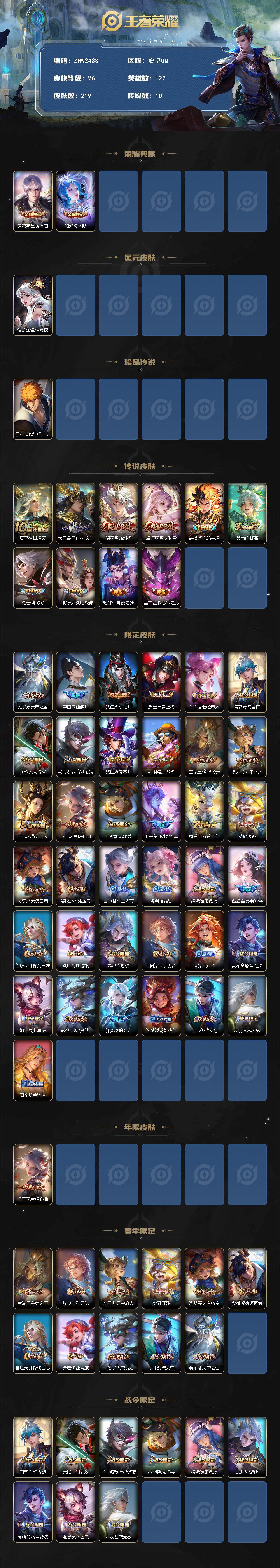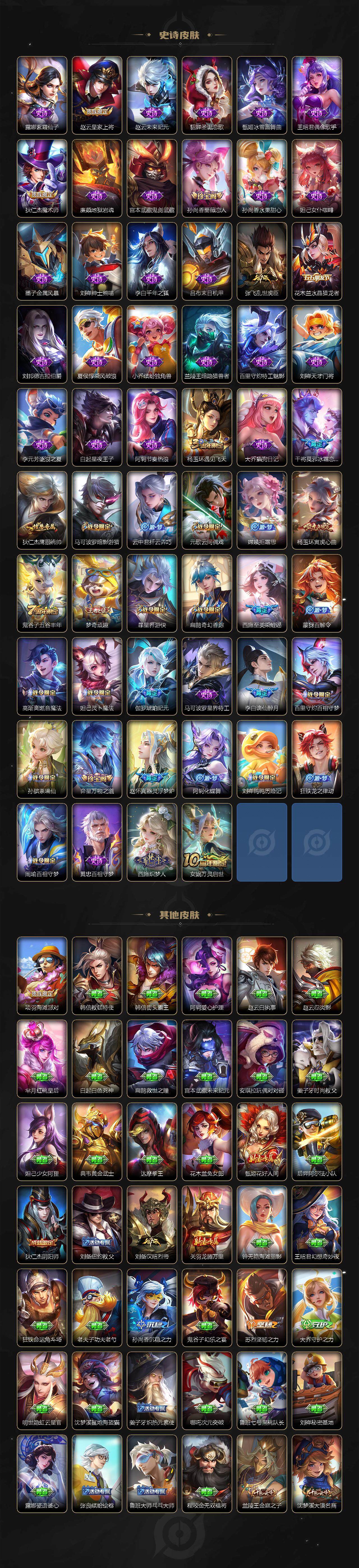 【店主推荐捡漏号!可直接换绑】安卓q-v6-最强王者段位-127英雄-219皮肤-2典藏皮肤-1珍品传说-1星传说-10传说-57史诗 【英雄全皮】:空空儿全皮 【荣耀典藏】:诸葛亮星域神启,貂蝉幻阙歌 【珍品传说】:宫本武藏黑崎一护 【传说皮肤】:后羿神树通天,大司命死亡执政官,澜愿照九州拓,虞姬愿照岁时盈,裴擒虎祥瑞亨通,桑启鸣野蒿,曜云鹰飞将,干将莫邪久胜战神,貂蝉仲夏夜之梦,宫本武藏地狱之眼 【限定皮肤】:姜子牙天穹之誓,李白谪仙醉月,狄仁杰阴阳师,赵云皇家上将,孙尚香蔷薇恋人,扁鹊奇幻香踪,元歌云间偶戏,马可波罗暗影游猎,狄仁杰魔术师,项羽海滩派对,兰陵王金庭之子,李元芳云中旅人,杨玉环遇见飞天,杨玉环寅虎心曲,杨戬潮玩骑兵,干将莫邪冰霜恋舞曲,鬼谷子五谷丰年,梦奇顽趣,沈梦溪大漠名商,裴擒虎擒涛扼浪,云中君纤云弄巧,嫦娥拒霜思,嫦娥暖冬兔眠,西施至美乘鲤谣,鲁班大师探海日志,桑启海盐诗旅,暃星界游侠,张良古海寻踪,蒙犽百解令,高渐离燃音魔法,妲己灵卜魔法,鬼谷子天穹祈灯,伽罗琥珀纪元,沈梦溪龙舞盛年,刘邦剑破天穹,项羽苍威无极,周瑜熔金海岸 【年限皮肤】:杨玉环寅虎心曲 【赛季限定】:兰陵王金庭之子,张良古海寻踪,李元芳云中旅人,梦奇顽趣,沈梦溪大漠名商,裴擒虎擒涛扼浪,鲁班大师探海日志,桑启海盐诗旅,鬼谷子天穹祈灯,刘邦剑破天穹,姜子牙天穹之誓 【战令限定】:扁鹊奇幻香踪,元歌云间偶戏,马可波罗暗影游猎,杨戬潮玩骑兵,嫦娥暖冬兔眠,暃星界游侠,高渐离燃音魔法,妲己灵卜魔法,项羽苍威无极 【史诗皮肤】:露娜紫霞仙子,赵云皇家上将,赵云未来纪元,貂蝉圣诞恋歌,甄姬冰雪圆舞曲,王昭君偶像歌手,狄仁杰魔术师,廉颇地狱岩魂,宫本武藏鬼剑武藏,孙尚香蔷薇恋人,孙尚香水果甜心,妲己女仆咖啡,墨子金属风暴,刘禅绅士熊喵,李白千年之狐,吕布末日机甲,张飞乱世虎臣,花木兰水晶猎龙者,刘邦德古拉伯爵,夏侯惇乘风破浪,小乔缤纷独角兽,兰陵王暗隐猎兽者,百里守约特工魅影,刘禅天才门将,李元芳逐浪之夏,白起星夜王子,阿轲节奏热浪,杨玉环遇见飞天,大乔猫狗日记,干将莫邪冰霜恋舞曲,狄仁杰鹰眼统帅,马可波罗暗影游猎,云中君纤云弄巧,元歌云间偶戏,嫦娥拒霜思,杨玉环寅虎心曲,鬼谷子五谷丰年,梦奇顽趣,暃星界游侠,扁鹊奇幻香踪,西施至美乘鲤谣,蒙犽百解令,妲己灵卜魔法,高渐离燃音魔法,伽罗琥珀纪元,马可波罗星界特工,李白谪仙醉月,百里守约百相守梦,孙膑茶境仙,弈星万物之道,赵怀真器灵浮梦炉,阿轲化蝶舞,刘禅鸭鸭历险记,狂铁龙之律动,周瑜百相守梦,黄忠百相守梦,西施织梦人,女娲万灵启世 【其他皮肤】:项羽海滩派对,韩信教廷特使,韩信街头霸王,阿轲爱心护理,赵云白执事,赵云忍炎影,芈月红桃皇后,白起白色死神,扁鹊救世之瞳,宫本武藏未来纪元,安琪拉玩偶对对碰,姜子牙时尚教父,妲己少女阿狸,典韦黄金武士,达摩拳王,花木兰兔女郎,甄姬花好人间,后羿阿尔法小队,狄仁杰阴阳师,刘备纽约教父,刘备汉昭烈帝,关羽龙腾万里,钟无艳海滩丽影,王昭君幻想奇妙夜,狂铁命运角斗场,老夫子功夫老勺,孙尚香沉稳之力,鬼谷子幻乐之宴,苏烈坚韧之力,大乔守护之力,明世隐虹云星官,沈梦溪鲨炮海盗猫,姜子牙炽热元素使,哪吒次元突破,鲁班七号黑桃队长,刘禅秘密基地,露娜瓷语鉴心,张良缤纷绘卷,鲁班大师乓乓大师,程咬金无双福将,兰陵王金庭之子,沈梦溪大漠名商,蒙恬蔚蓝守将,李元芳云中旅人,桑启海盐诗旅,嫦娥暖冬兔眠,猪八戒潮玩探月行,牛魔牛运亨通,裴擒虎擒涛扼浪,杨戬潮玩骑兵,太乙真人劲辣红锅,鲁班大师探海日志,李元芳妄想特派,张良古海寻踪,海月王牌新星,亚连破局者,兰陵王幻夜行动,后羿完美运算,鬼谷子天穹祈灯,妲己灵卜魔法,朵莉亚金色潮汐,廉颇功夫炙烤,沈梦溪龙舞盛年,钟无艳春野之旅,刘邦剑破天穹,项羽苍威无极,貂蝉长夏之忆,姜子牙天穹之誓,周瑜熔金海岸,盘古敬我三分,东皇太一噬灭天穹,老夫子百相守梦,干将莫邪雾都夜雨,吕布逐霄战戟,苍苍林狼骑,太乙真人谧流熔炉,典韦铁骨偃魂,马超访茗客,西施雪境奇遇,姜子牙星梦巡礼,东皇太一金福满堂,少司缘灵卦秘语,明世隐景韶洛都,戈娅玫蓝誓约,刘备浪漫序章,钟馗虚灵犬护,沈梦溪鸭鸭历险记,苏烈春野闲踪,张良灵野札记,阿古朵布丁狗之约,露娜命运加冕,姬小满小满鸭,白起死霸装,甄姬逆浪荇歌,孙策百相守梦,庄周锦麟游梦,空空儿戏梦巡演,高渐离落日弦歌,莱西奥踏浪烽翎,鬼谷子克喵,哪吒罗小黑战记,亚瑟荣光之誓,张良罗小黑战记,艾琳鹤鸣心笺,鲁班七号福禄兄弟,高渐离金属狂潮,项羽帝国元帅,露娜绯红之刃,貂蝉异域舞娘,花木兰剑舞者,王昭君精灵公主,狄仁杰锦衣卫,小乔万圣前夜,孙悟空西部大镖客,后羿精灵王,兰陵王隐刃,李元芳特种部队,刘邦圣殿之光,虞姬加勒比小姐,关羽天启骑士,蔡文姬蔷薇王座,夏侯惇战争骑士,雅典娜战争女神,马可波罗激情绿茵,苍维京掠夺者,杨戬埃及法老,黄忠芝加哥教父,干将莫邪第七人偶,铠龙域领主,百里守约绝影神呛,百里玄策威尼斯狂欢,梦奇美梦成真,女娲尼罗河女神,弈星踏雪寻梅,米莱狄精准探案法,元歌午夜歌剧院,孙策海之征途,司马懿魇语军师,盾山极冰防御线,李信灼热之刃,盘古创世神祝,马超幸存者,镜冰刃幻境,蒙恬秩序猎龙将,澜孤猎,司空震启蛰,云缨赤焰之缨,金