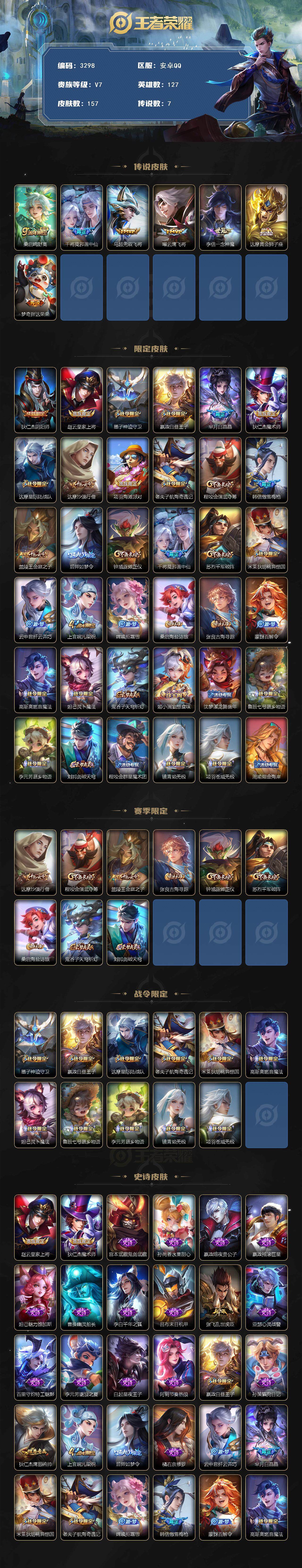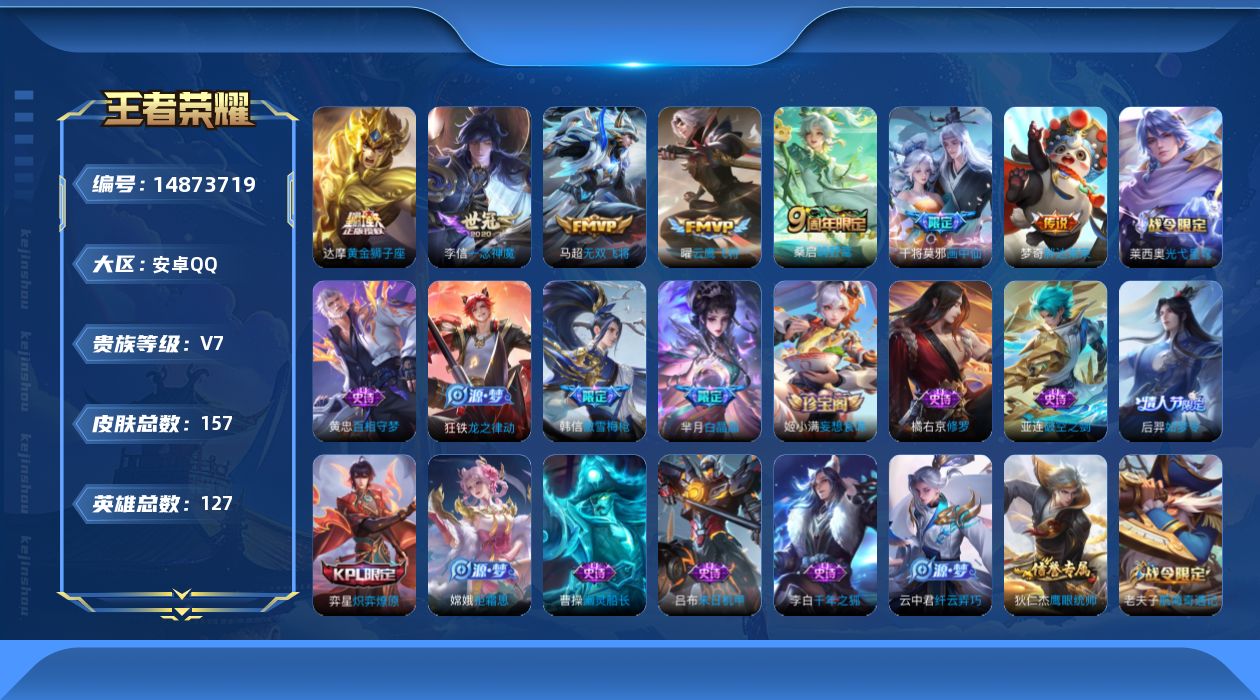 [14873719]安卓q-v7-至尊星耀v段位-127英雄-157皮肤-7传说-38史诗 【英雄全皮】:孙权全皮 【传说皮肤】:桑启鸣野蒿,干将莫邪画中仙,马超无双飞将,曜云鹰飞将,李信一念神魔,达摩黄金狮子座,梦奇胖达荣荣 【限定皮肤】:狄仁杰阴阳师,赵云皇家上将,墨子神迹守卫,嬴政白昼王子,芈月白晶晶,狄仁杰魔术师,达摩星际陆战队,达摩沙漠行僧,项羽海滩派对,老夫子航海奇遇记,程咬金演武夺筹,韩信傲雪梅呛,兰陵王金庭之子,后羿如梦令,钟馗驱傩正仪,干将莫邪画中仙,苏烈千军破阵,米莱狄胡桃异想国,云中君纤云弄巧,上官婉儿梁祝,嫦娥拒霜思,桑启海盐诗旅,张良古海寻踪,蒙犽百解令,高渐离燃音魔法,妲己灵卜魔法,鬼谷子天穹祈灯,姬小满妄想食味,沈梦溪龙舞盛年,鲁班七号蔬乡物语,李元芳蔬乡物语,刘邦剑破天穹,程咬金群星魔术团,镜青焰无极,项羽苍威无极,周瑜熔金海岸 【赛季限定】:达摩沙漠行僧,程咬金演武夺筹,兰陵王金庭之子,张良古海寻踪,钟馗驱傩正仪,苏烈千军破阵,桑启海盐诗旅,鬼谷子天穹祈灯,刘邦剑破天穹 【战令限定】:墨子神迹守卫,嬴政白昼王子,达摩星际陆战队,老夫子航海奇遇记,米莱狄胡桃异想国,高渐离燃音魔法,妲己灵卜魔法,鲁班七号蔬乡物语,李元芳蔬乡物语,镜青焰无极,项羽苍威无极 【史诗皮肤】:赵云皇家上将,狄仁杰魔术师,宫本武藏鬼剑武藏,孙尚香水果甜心,嬴政暗夜贵公子,嬴政摇滚巨星,妲己魅力维加斯,曹操幽灵船长,李白千年之狐,吕布末日机甲,张飞乱世虎臣,亚瑟心灵战警,百里守约特工魅影,李元芳逐浪之夏,白起星夜王子,阿轲节奏热浪,嬴政白昼王子,孙策猫狗日记,狄仁杰鹰眼统帅,上官婉儿梁祝,后羿如梦令,橘右京修罗,云中君纤云弄巧,芈月白晶晶,米莱狄胡桃异想国,老夫子航海奇遇记,嫦娥拒霜思,韩信傲雪梅呛,蒙犽百解令,妲己灵卜魔法,高渐离燃音魔法,姬小满妄想食味,鲁班七号蔬乡物语,镜青焰无极,亚连破空之剑,弈星炽弈燎原,狂铁龙之律动,黄忠百相守梦,莱西奥光弋星穹 【其他皮肤】:项羽海滩派对,韩信街头霸王,阿轲爱心护理,赵云白执事,赵云忍炎影,牛魔西部大镖客,扁鹊化身博士,安琪拉玩偶对对碰,孙膑天使之翼,姜子牙时尚教父,亚瑟死亡骑士,达摩拳王,花木兰兔女郎,张飞五福同心,甄姬花好人间,刘备万事如意,宫本武藏万象初新,后羿阿尔法小队,狄仁杰阴阳师,关羽龙腾万里,宫本武藏霸王丸,王昭君幻想奇妙