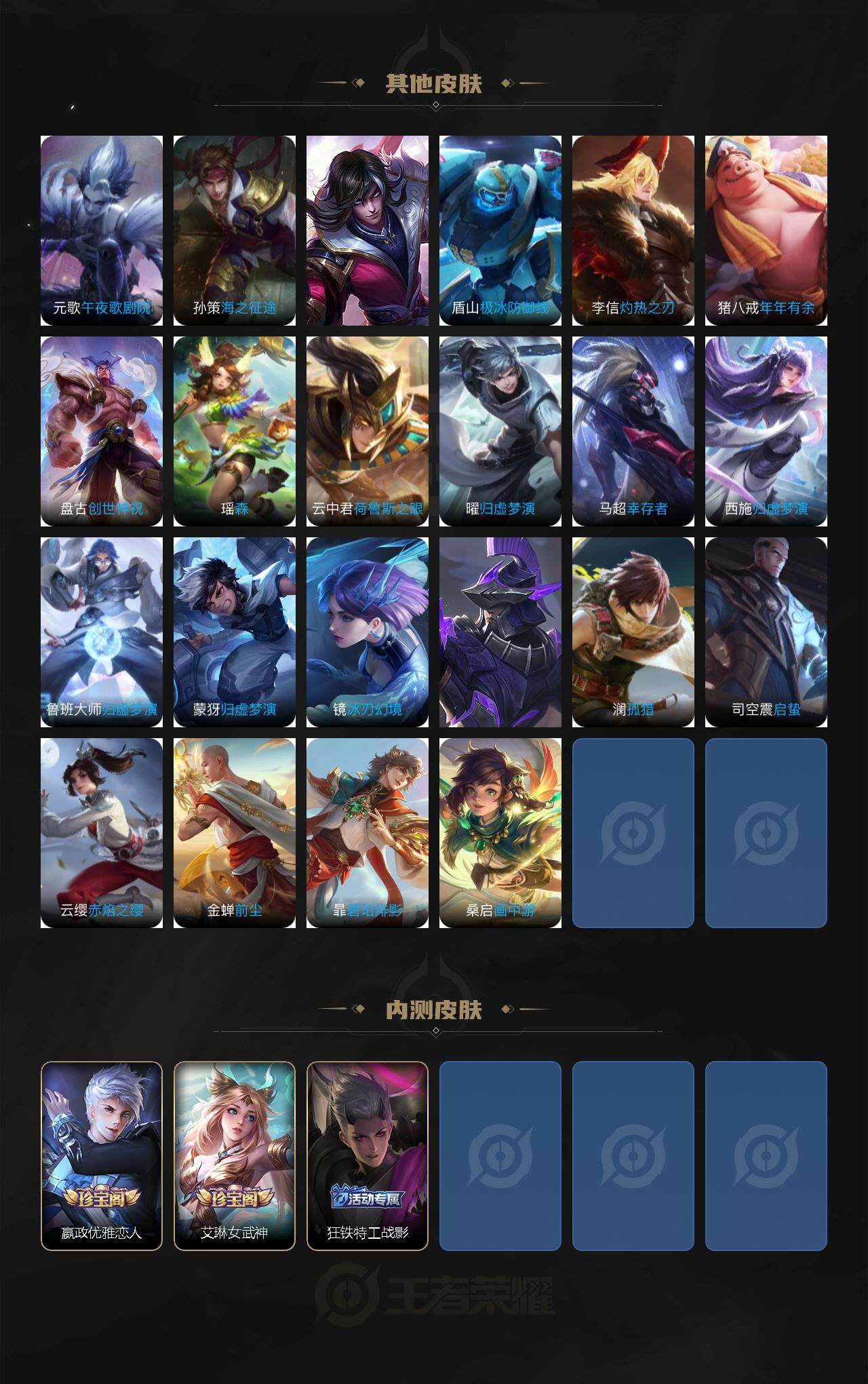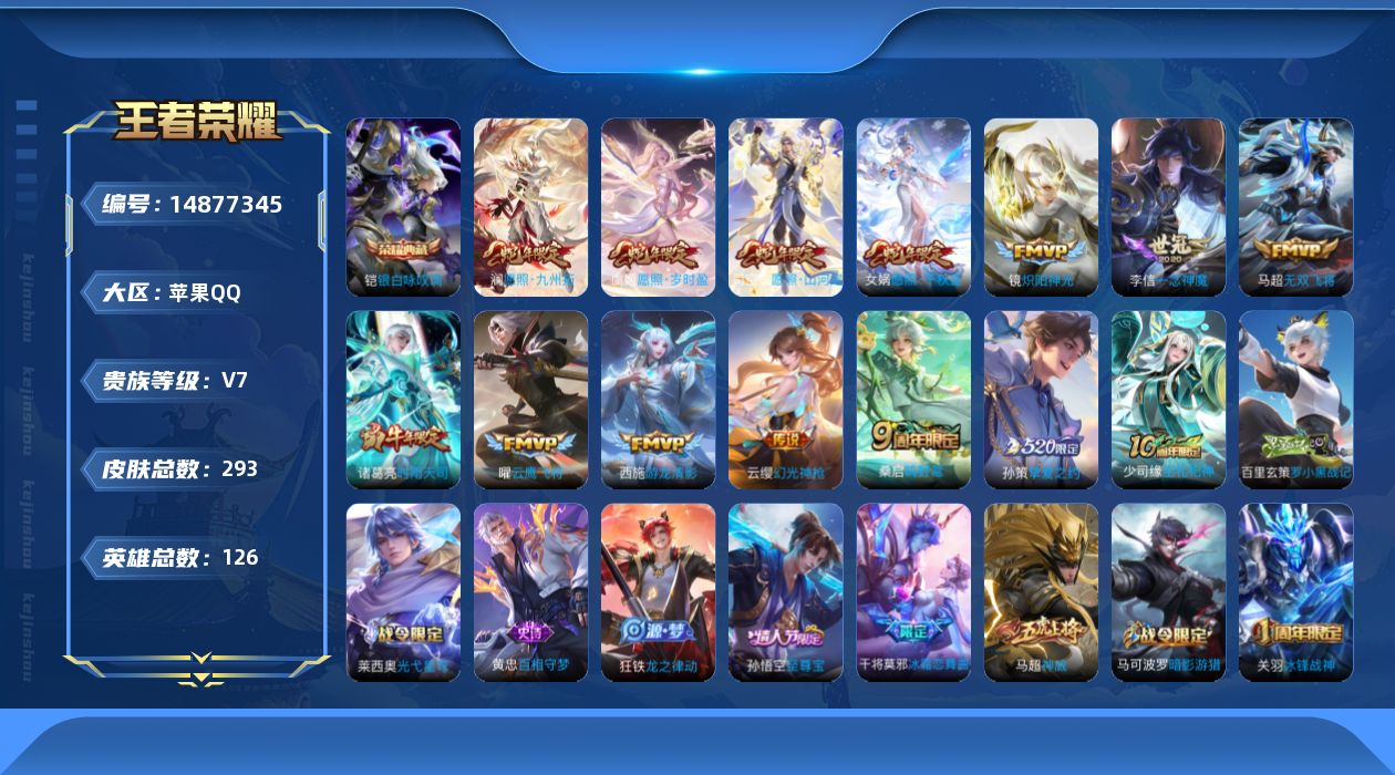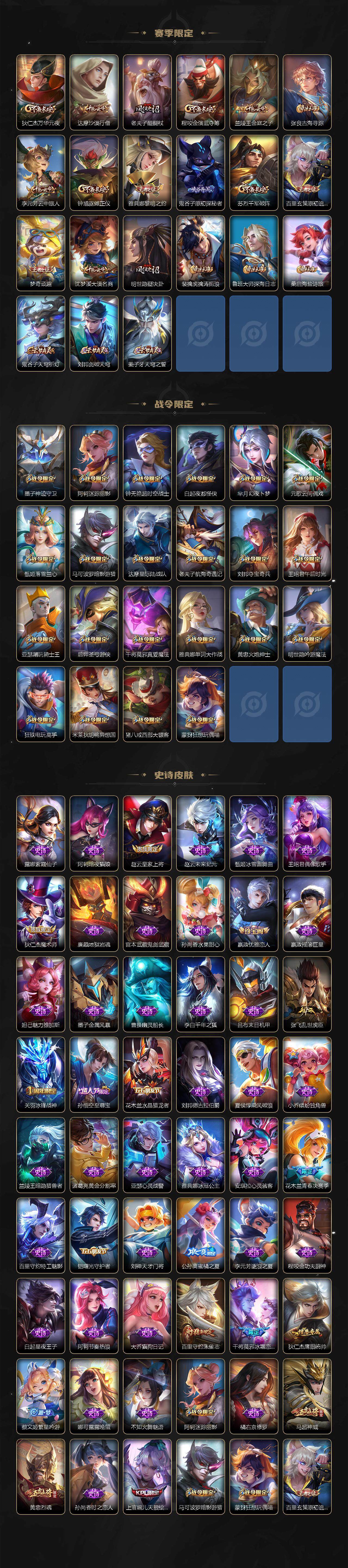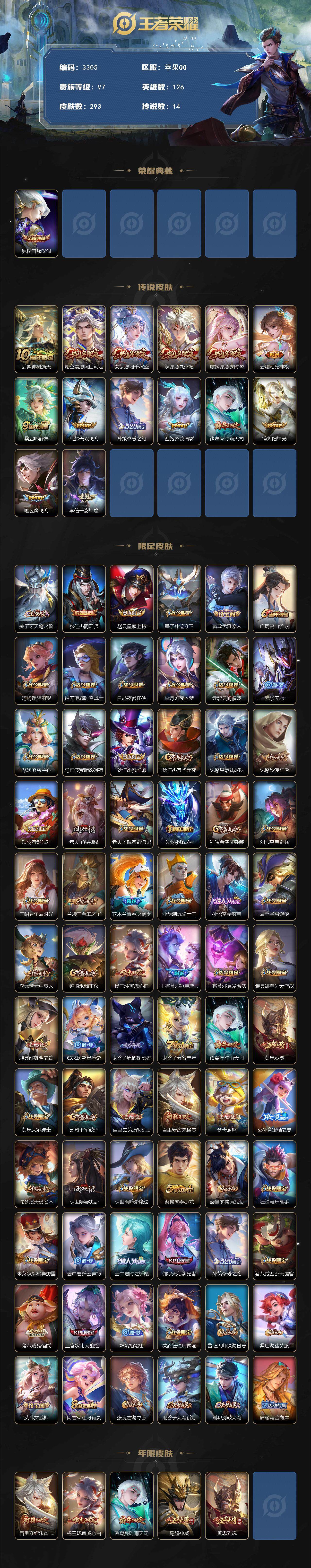 [14877345]苹果q-v7-最强王者段位-126英雄-293皮肤-1典藏皮肤-14传说-88史诗 【英雄全皮】:鬼谷子全皮,猪八戒全皮,影全皮 【荣耀典藏】:铠银白咏叹调 【传说皮肤】:后羿神树通天,司空震愿照山河定,女娲愿照千秋盛,澜愿照九州拓,虞姬愿照岁时盈,云缨幻光神呛,桑启鸣野蒿,马超无双飞将,孙策挚爱之约,西施游龙清影,诸葛亮时雨天司,镜炽阳神光,曜云鹰飞将,李信一念神魔 【限定皮肤】:姜子牙天穹之誓,狄仁杰阴阳师,赵云皇家上将,墨子神迹守卫,嬴政优雅恋人,庄周高山流水,阿轲迷踪丽影,钟无艳超时空战士,白起夜都怪侠,芈月幻夜卜梦,元歌云间偶戏,元歌无心,甄姬落雪兰心,马可波罗暗影游猎,狄仁杰魔术师,狄仁杰万华元夜,达摩星际陆战队,达摩沙漠行僧,项羽海滩派对,老夫子醍醐杖,老夫子航海奇遇记,关羽冰锋战神,程咬金演武夺筹,刘邦夺宝奇兵,王昭君午后时光,兰陵王金庭之子,花木兰青春决赛季,亚瑟潮玩骑士王,孙悟空至尊宝,后羿圣弓游侠,李元芳云中旅人,钟馗驱傩正仪,杨玉环寅虎心曲,干将莫邪冰霜恋舞曲,干将莫邪真爱魔法,雅典娜单词大作战,雅典娜黎明之约,蔡文姬繁星吟游,鬼谷子原初探秘者,鬼谷子五谷丰年,诸葛亮时雨天司,黄忠烈魂,黄忠火炮绅士,苏烈千军破阵,百里玄策原初追逐者,百里守约朱雀志,梦奇顽趣,公孙离蜜橘之夏,沈梦溪大漠名商,明世隐疑决卦,明世隐吟游魔法,裴擒虎李小龙,裴擒虎擒涛扼浪,狂铁电玩高手,米莱狄胡桃异想国,云中君纤云弄巧,云中君时之祈愿,伽罗天狼溯光者,孙策挚爱之约,猪八戒西部大镖客,猪八戒猪悟能,上官婉儿天狼绘梦者,嫦娥拒霜思,蒙犽狂想玩偶喵,鲁班大师探海日志,桑启海盐诗旅,艾琳女武神,阿古朵江河有灵,张良古海寻踪,鬼谷子天穹祈灯,刘邦剑破天穹,周瑜熔金海岸 【年限皮肤】:百里守约朱雀志,杨玉环寅虎心曲,诸葛亮时雨天司,马超神威,黄忠烈魂 【赛季限定】:狄仁杰万华元夜,达摩沙漠行僧,老夫子醍醐杖,程咬金演武夺筹,兰陵王金庭之子,张良古海寻踪,李元芳云中旅人,钟馗驱傩正仪,雅典娜黎明之约,鬼谷子原初探秘者,苏烈千军破阵,百里玄策原初追逐者,梦奇顽趣,沈梦溪大漠名商,明世隐疑决卦,裴擒虎擒涛扼浪,鲁班大师探海日志,桑启海盐诗旅,鬼谷子天穹祈灯,刘邦剑破天穹,姜子牙天穹之誓 【战令限定】:墨子神迹守卫,阿轲迷踪丽影,钟无艳超时空战士,白起夜都怪侠,芈月幻夜卜梦,元歌云间